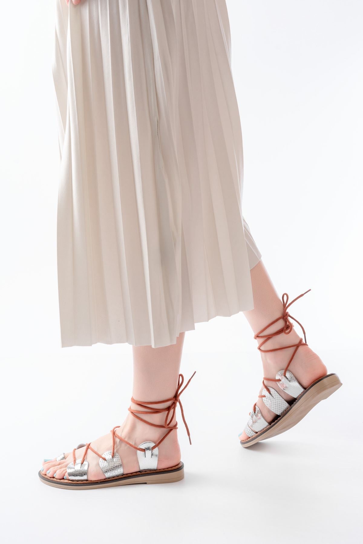 Evesty Gümüş Bilekten Bağlamalı Hakiki Deri Kadın Sandalet