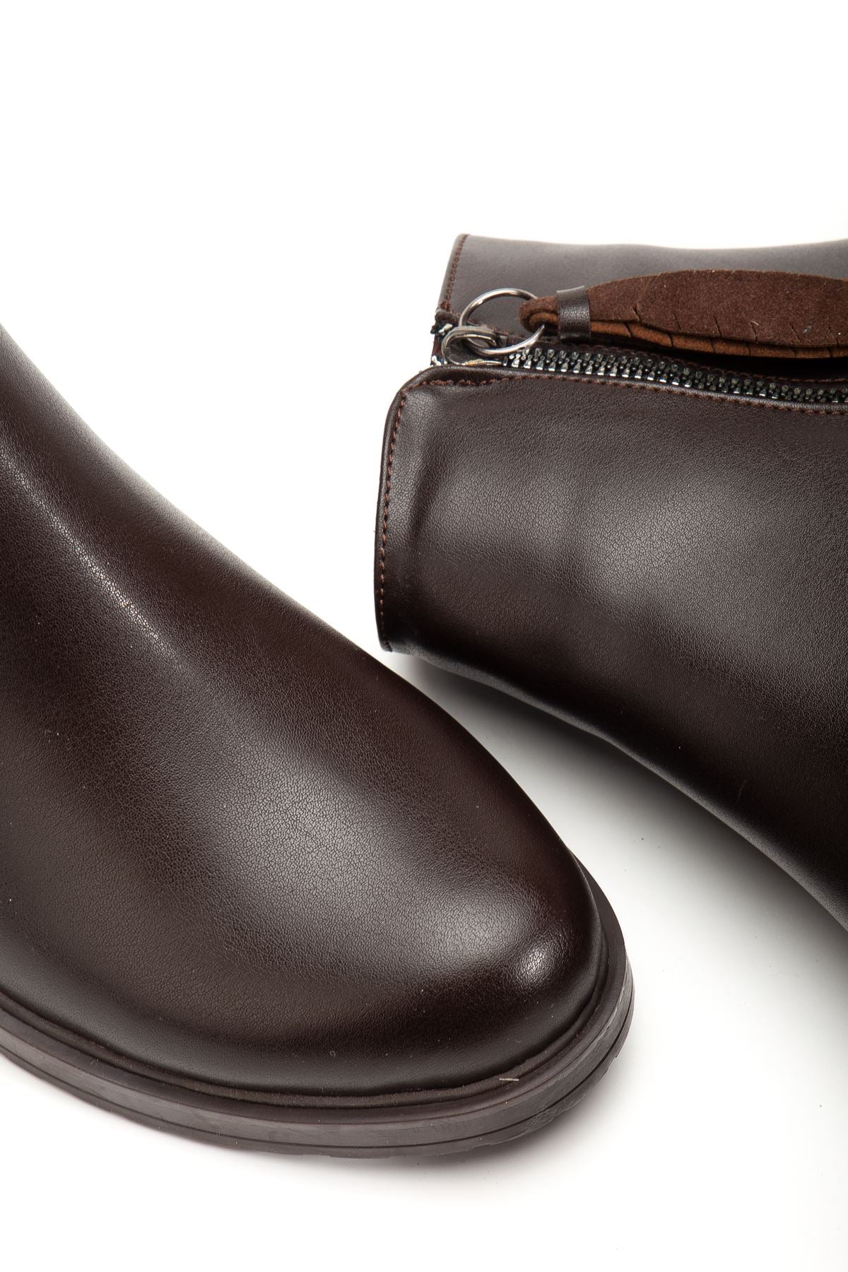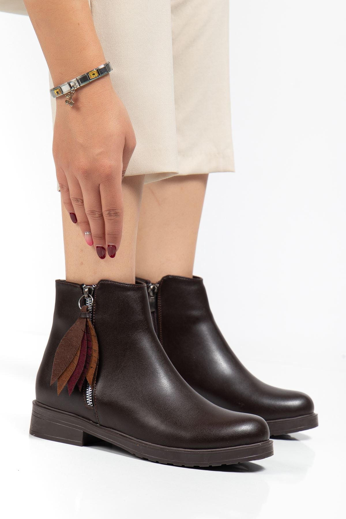 Alenyaz Kahve Yaprak Desenli Fermuarlı Kadın Bot