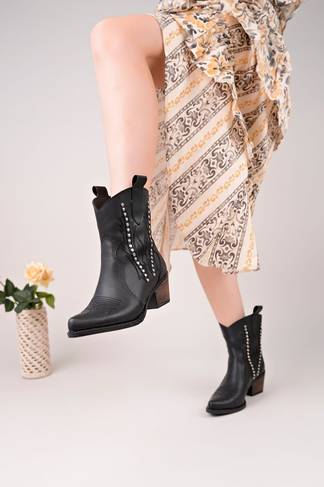 Western esintili tasarımı ve yan yüzeydeki taş detaylarıyla Matin modeli, güçlü ve karakterli bir stil sunar. Dengeli kalın topuğu sayesinde rahat bir duruş sağlarken, bilek hizasında biten formu kombinlere net bir siluet kazandırır. Zamansız çizgileriyle hem modern hem iddialı bir görünüm yaratır.