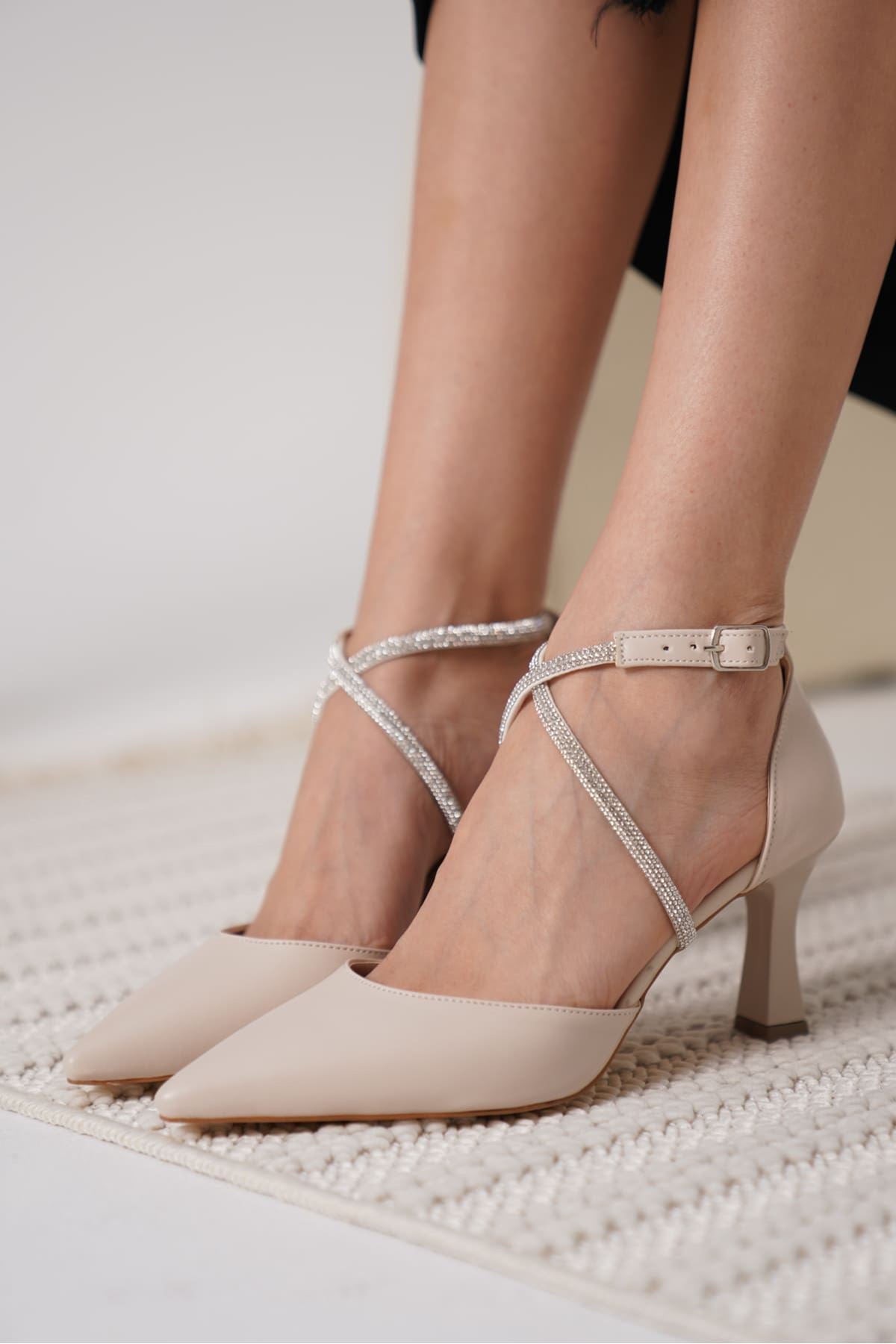 Fiona Kadın Taşlı Bej Sivri Burun Abiye Topuklu Ayakkabı