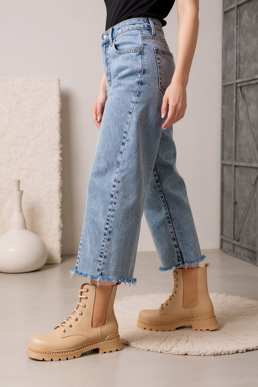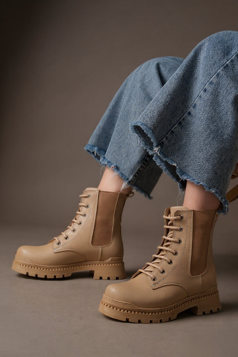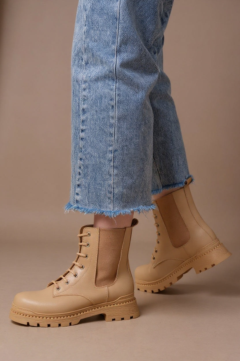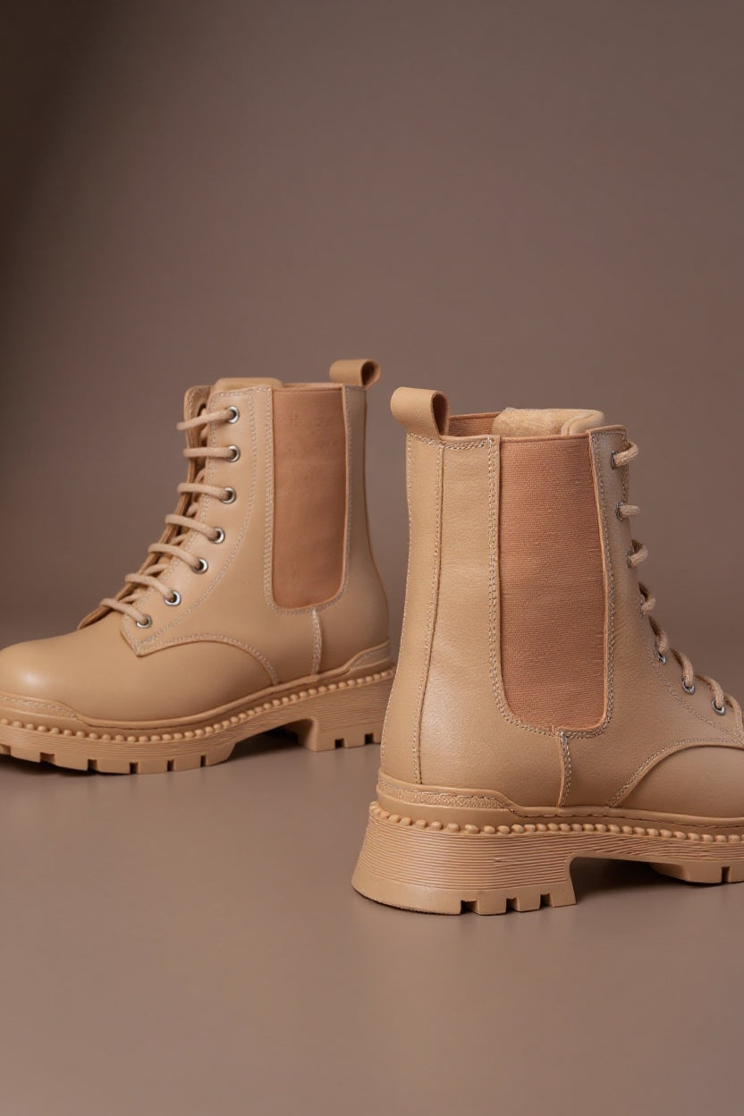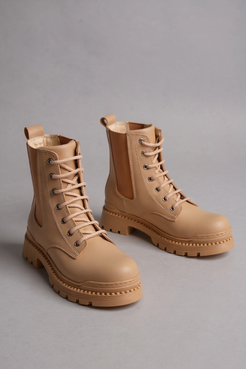 Hendy Bej Düz Topuklu Bağcıklı Lastikli Kadın Bot