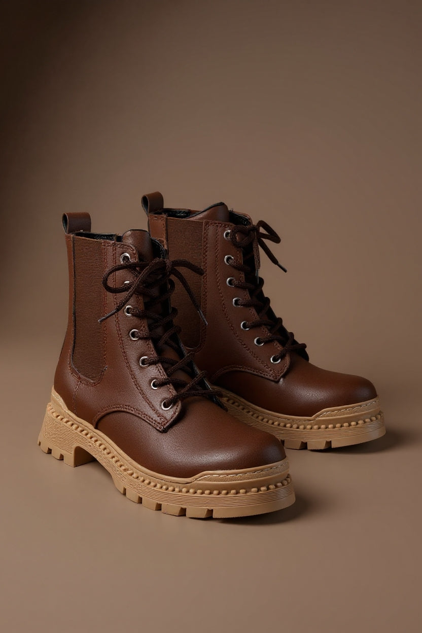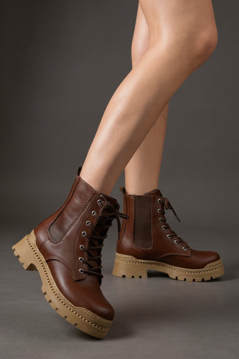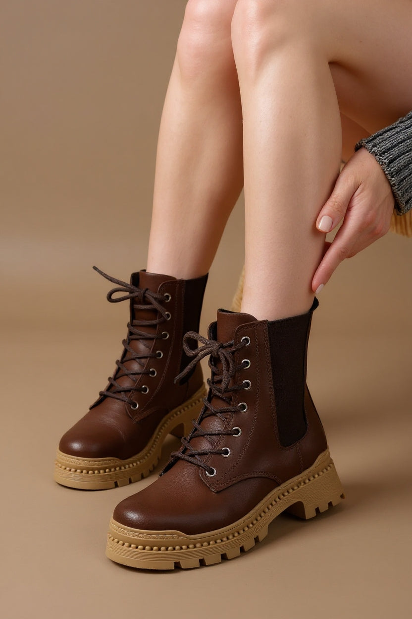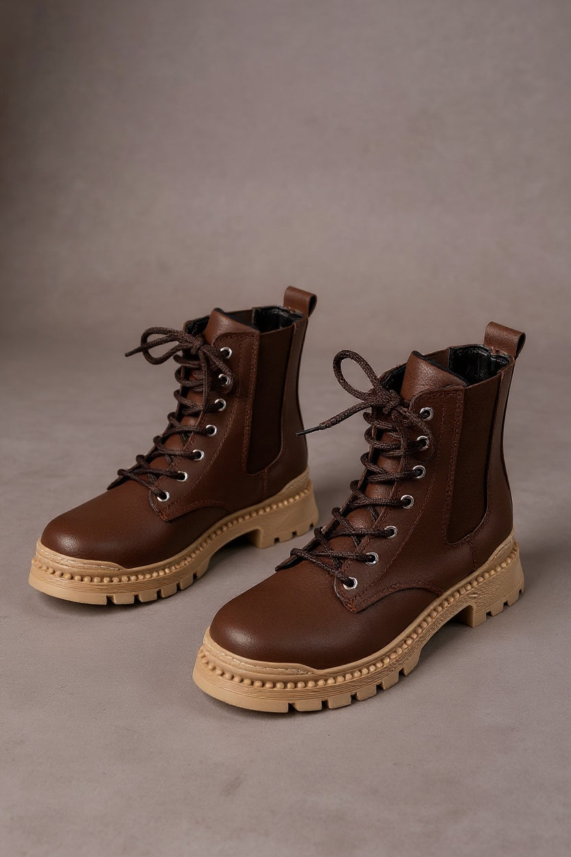 Hendy Kahverengi Düz Topuklu Bağcıklı Lastikli Kadın Bot