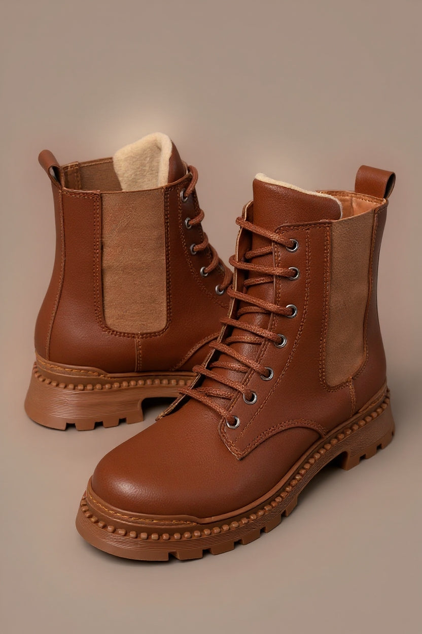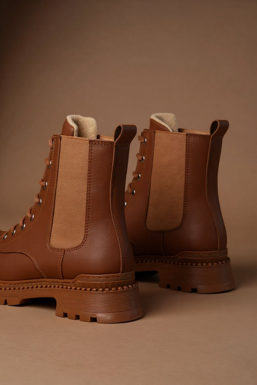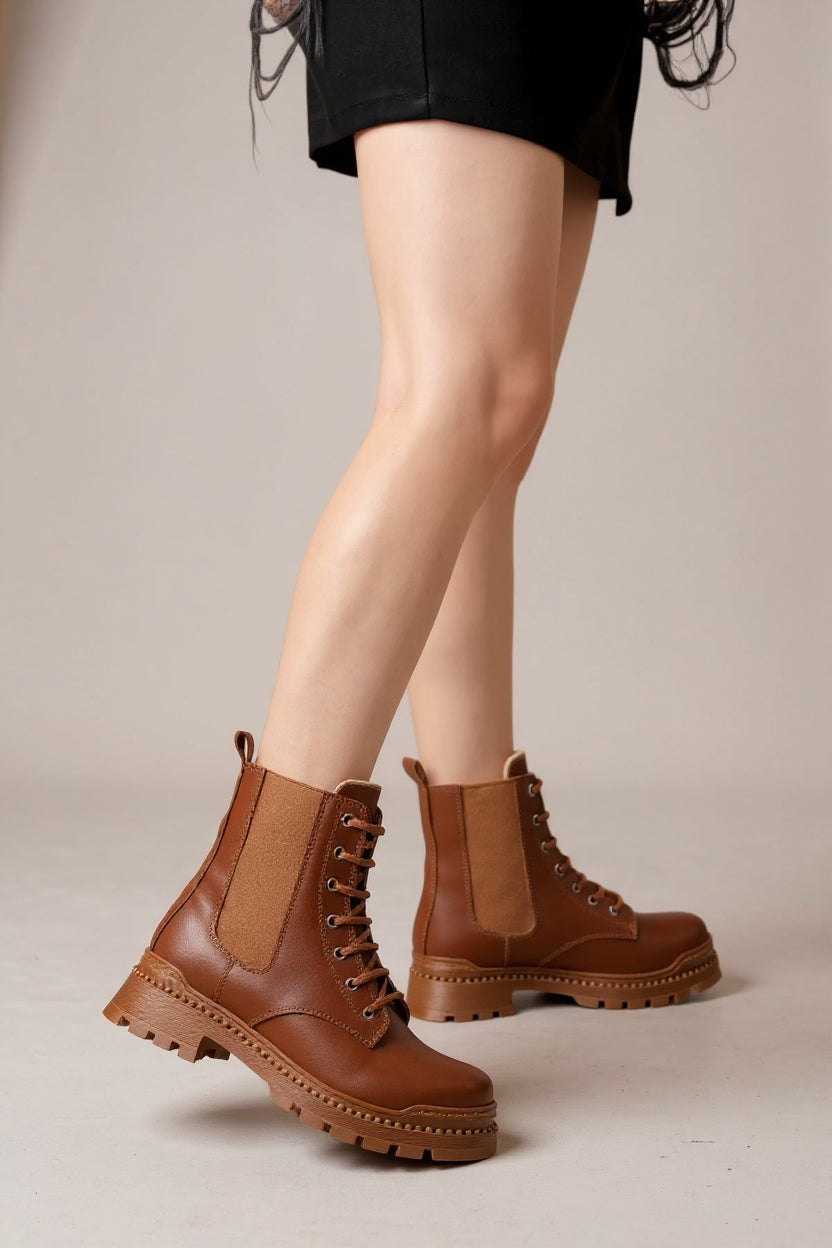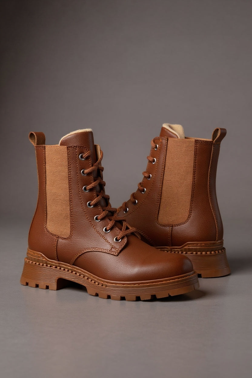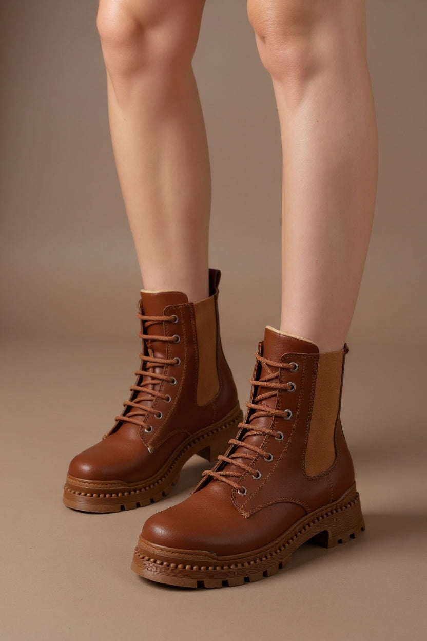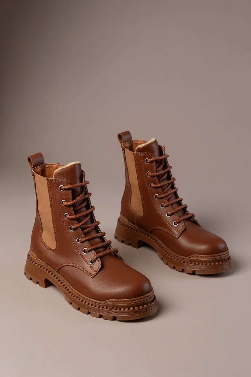 Hendy Taba Düz Topuklu Bağcıklı Lastikli Kadın Bot