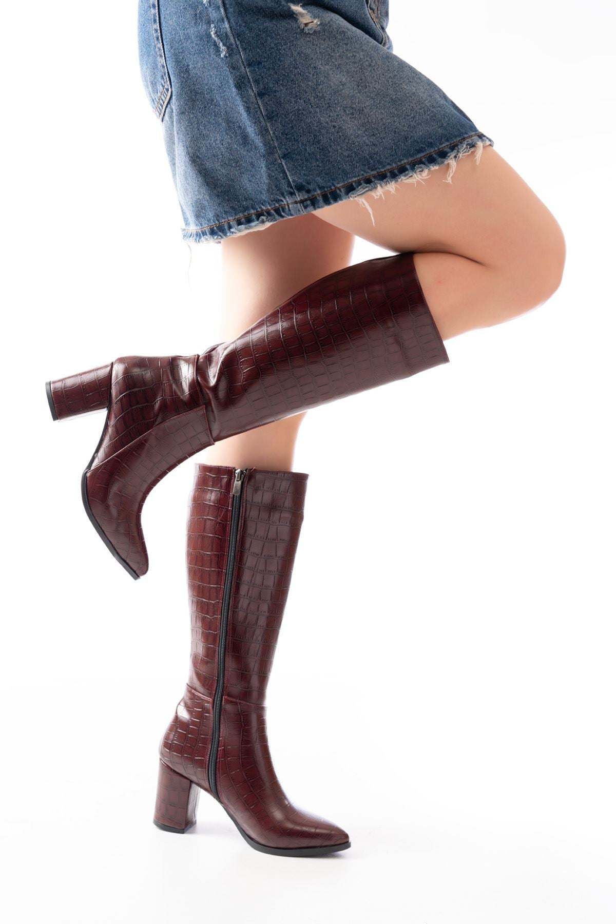 Fulern Bordo Kroko Topuklu Kadın Çizme