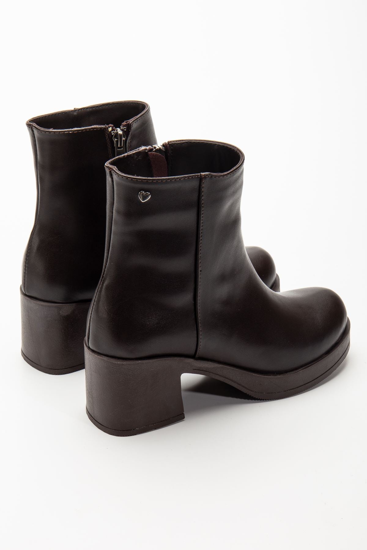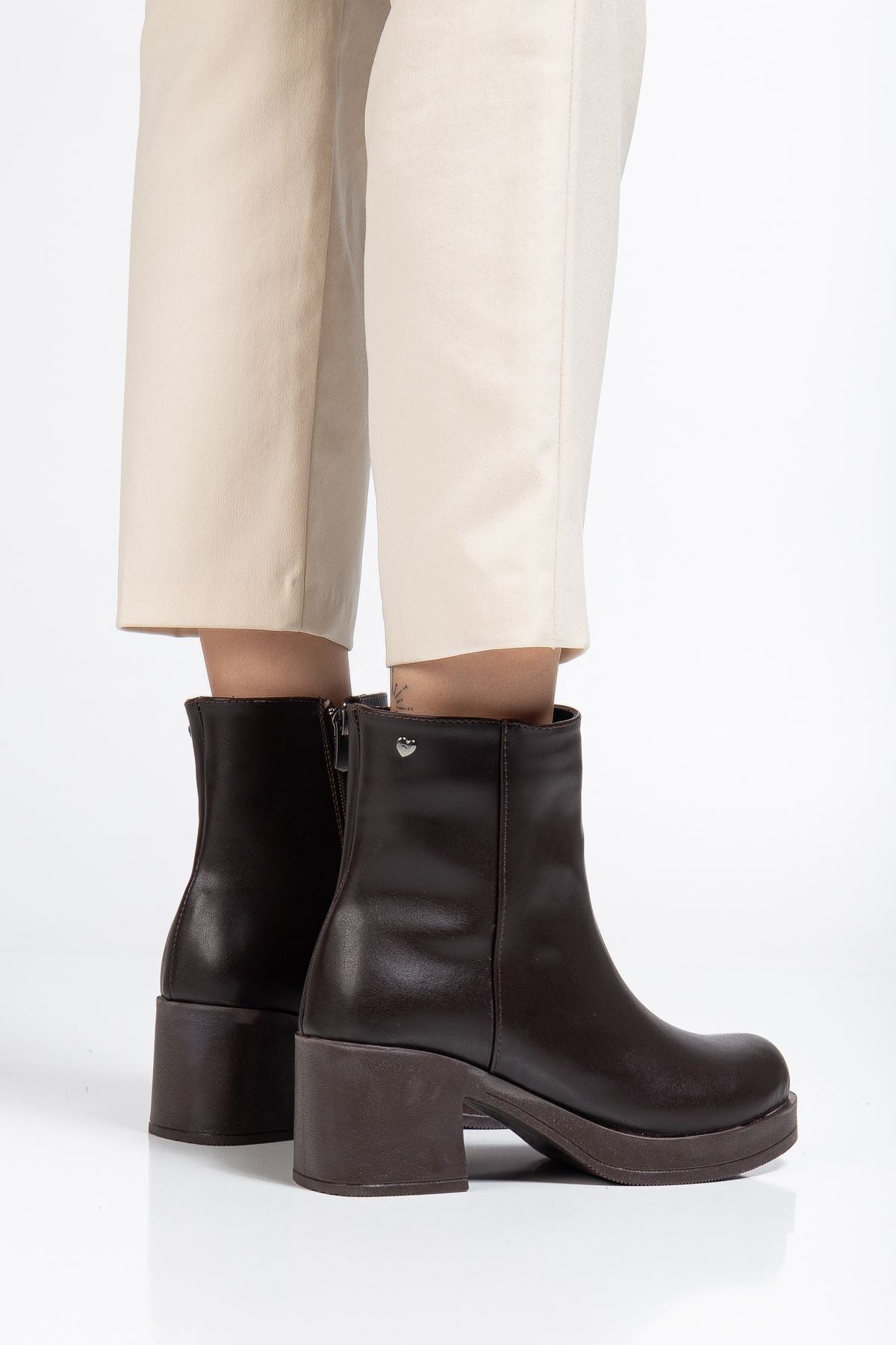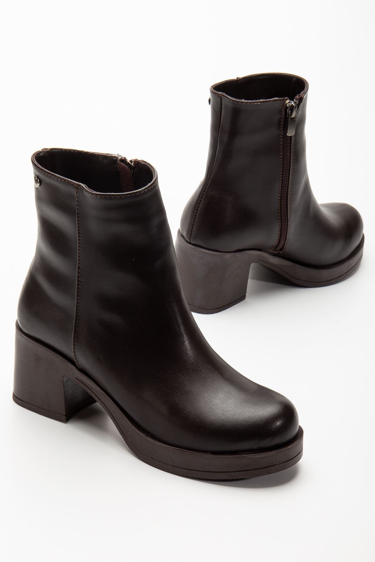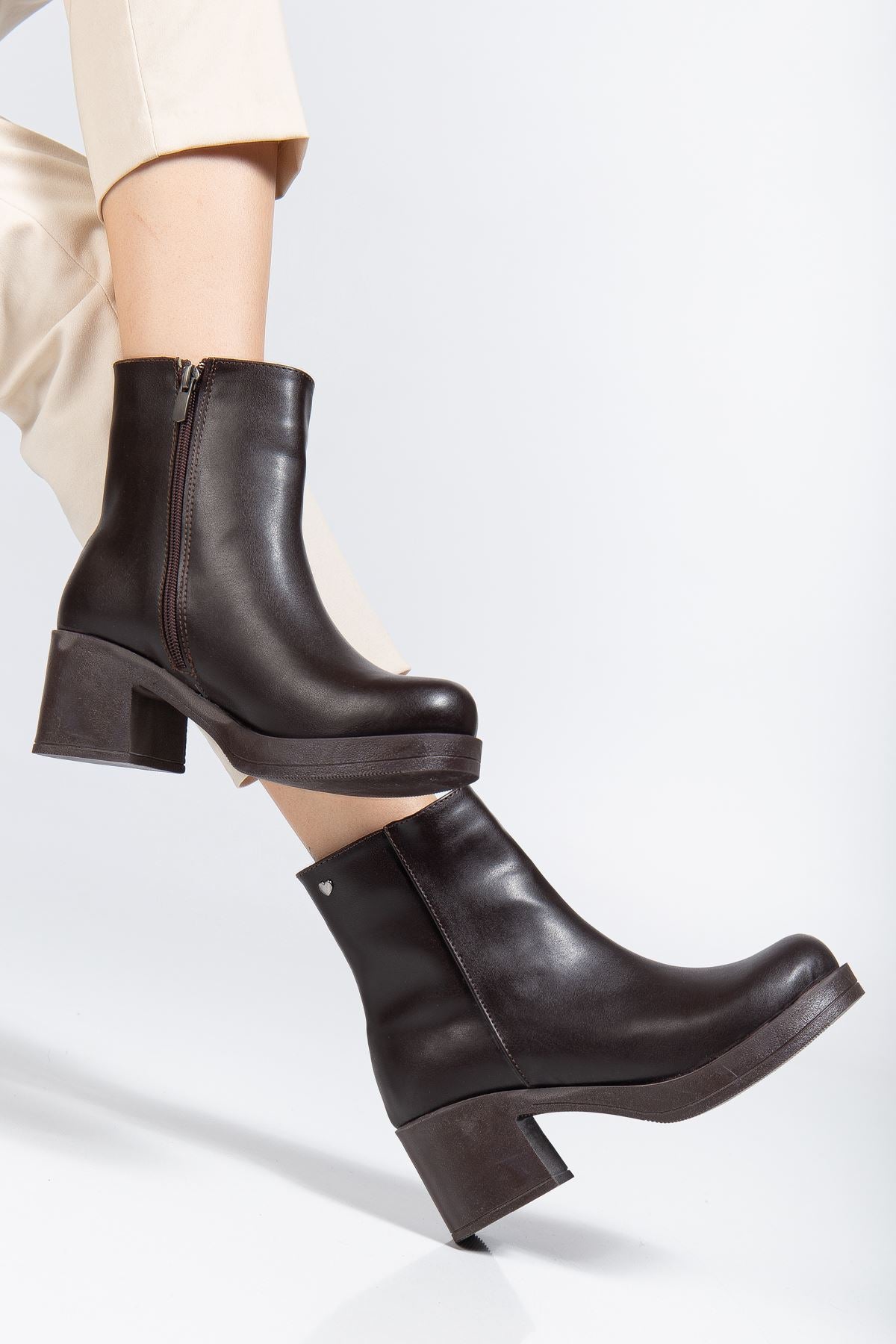 Mahzu Kahve Fermuarlı Kalın Topuklu Kadın Bot