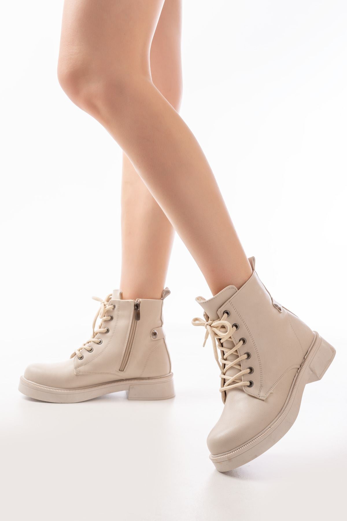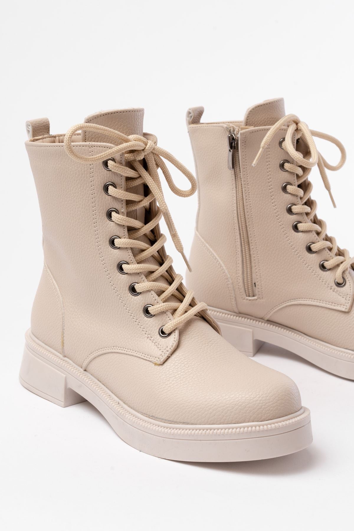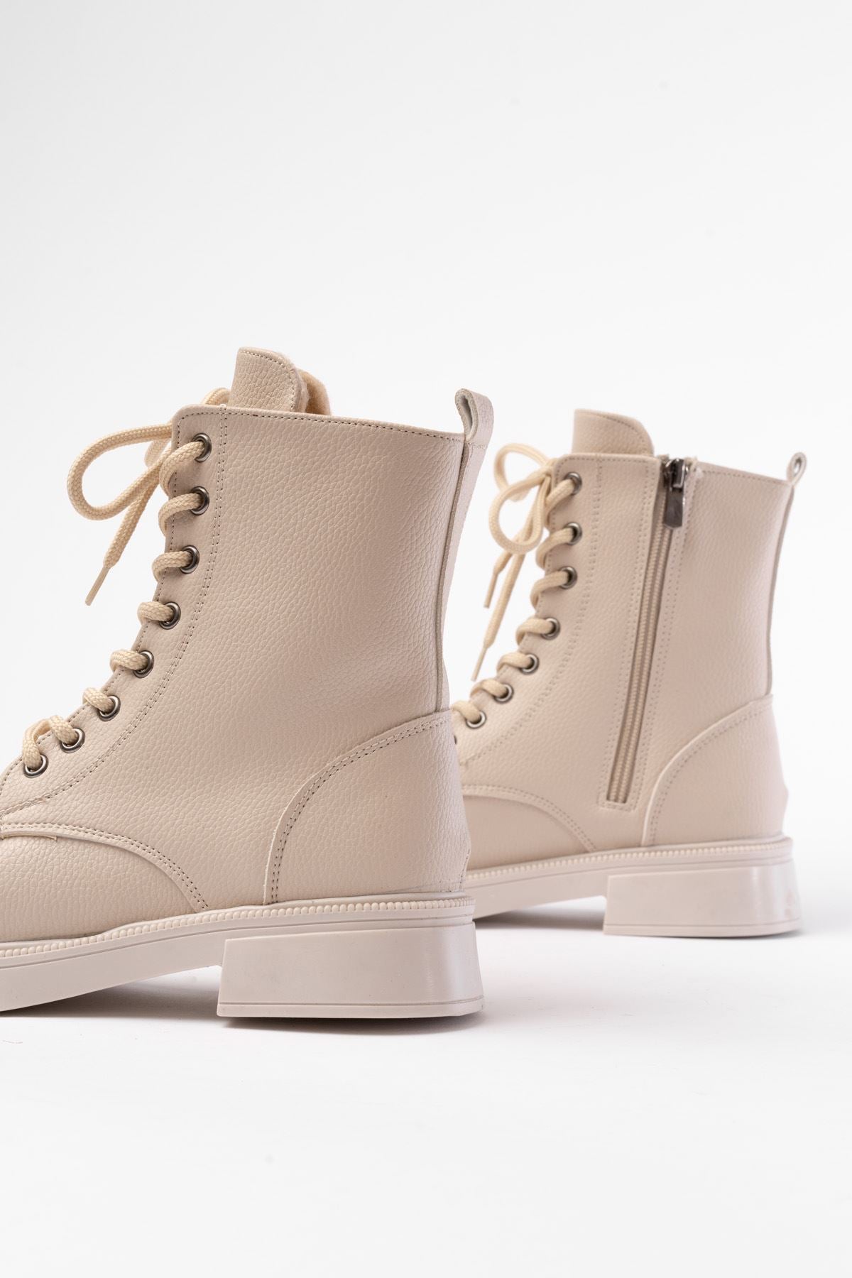 Fatenle Bej Galata Düz Topuklu Bağcıklı Fermuarlı Kadın Bot
