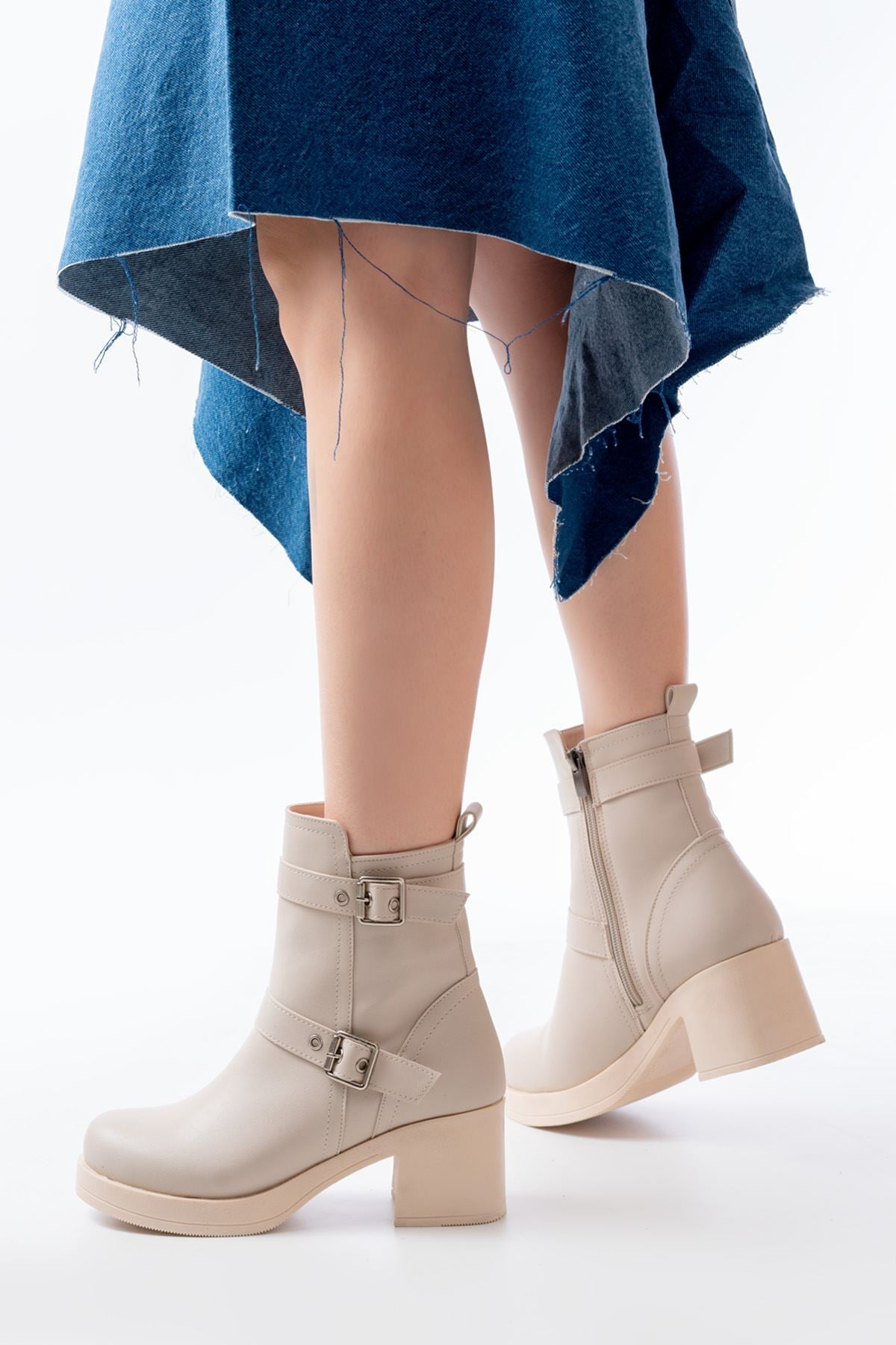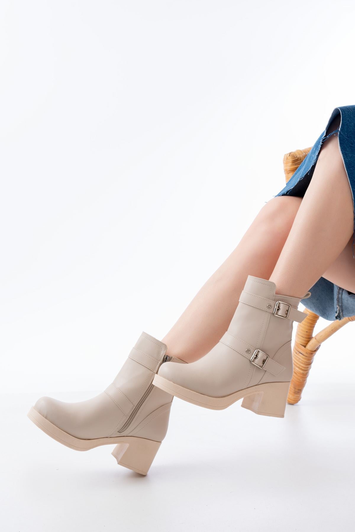 Tahzun Bej Topuklu Fermuarlı Kadın Bot