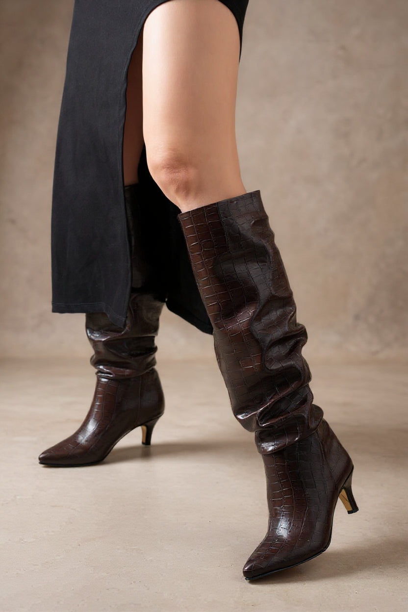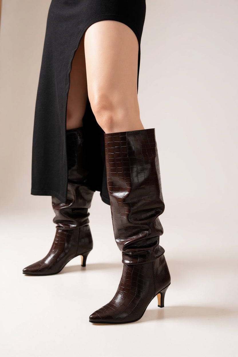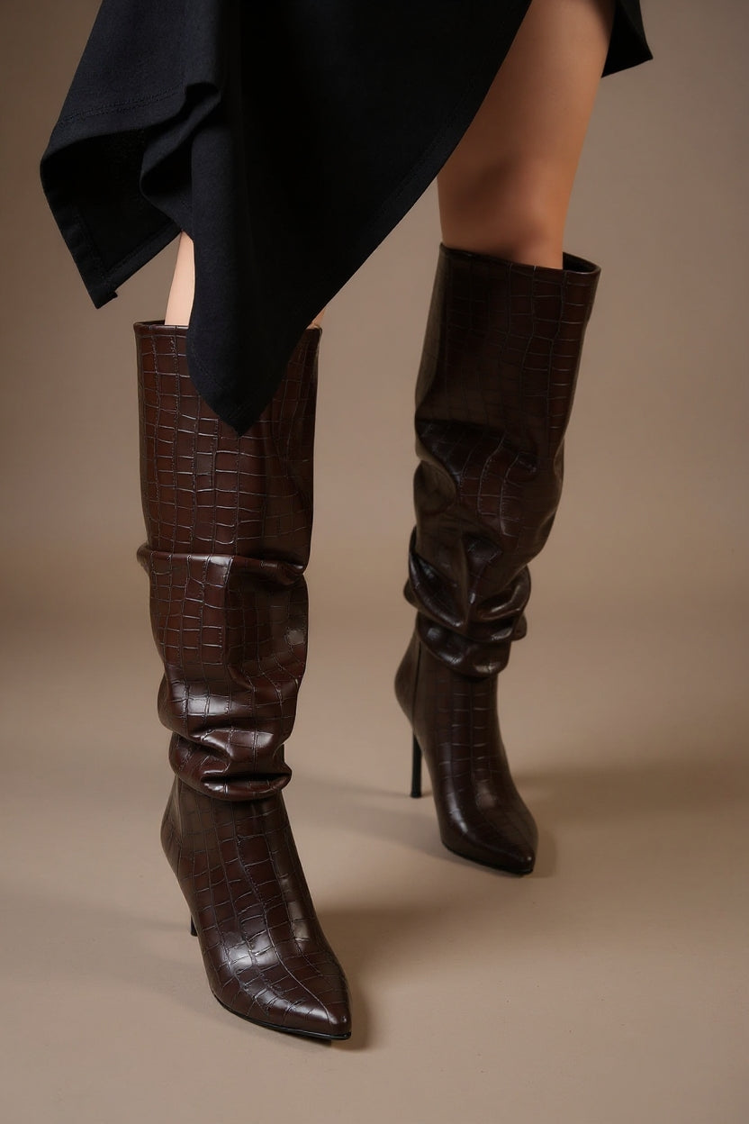 Aybin Kahverengi Kroko Körüklü İnce Topuklu Kadın Çizme