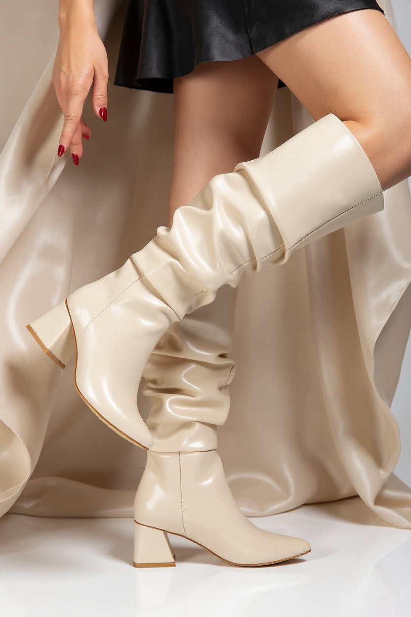 Feminen detaylarıyla dikkat çeken Ayzena Bej Kadın Çizme, zarif görünümünü konforla buluşturuyor. Körüklü formu, bacak boyunu optik olarak uzatırken, kalın 7 cm topuğu gün boyu rahat adımlar atmanı sağlar. Yumuşak PU deri dokusu ve modern kesimiyle kış kombinlerinin vazgeçilmezi olacak.
