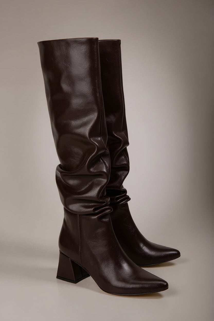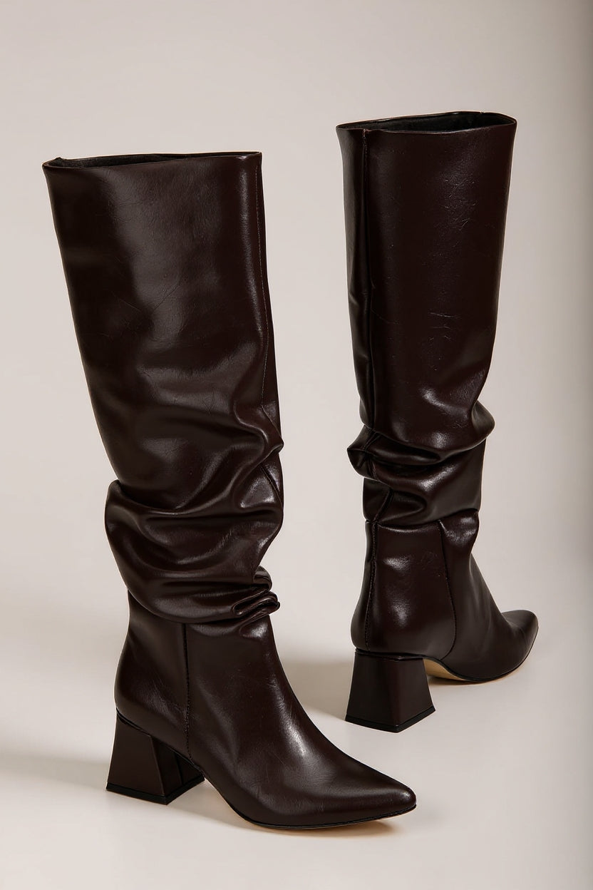 Ayzena Kahve Kırışık Rugan Körüklü Kalın Topuklu Kadın Çizme