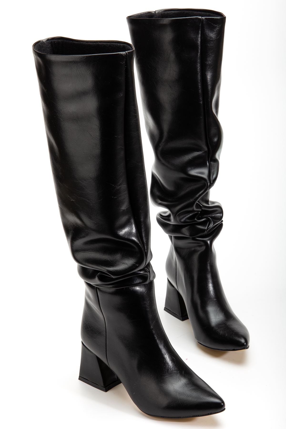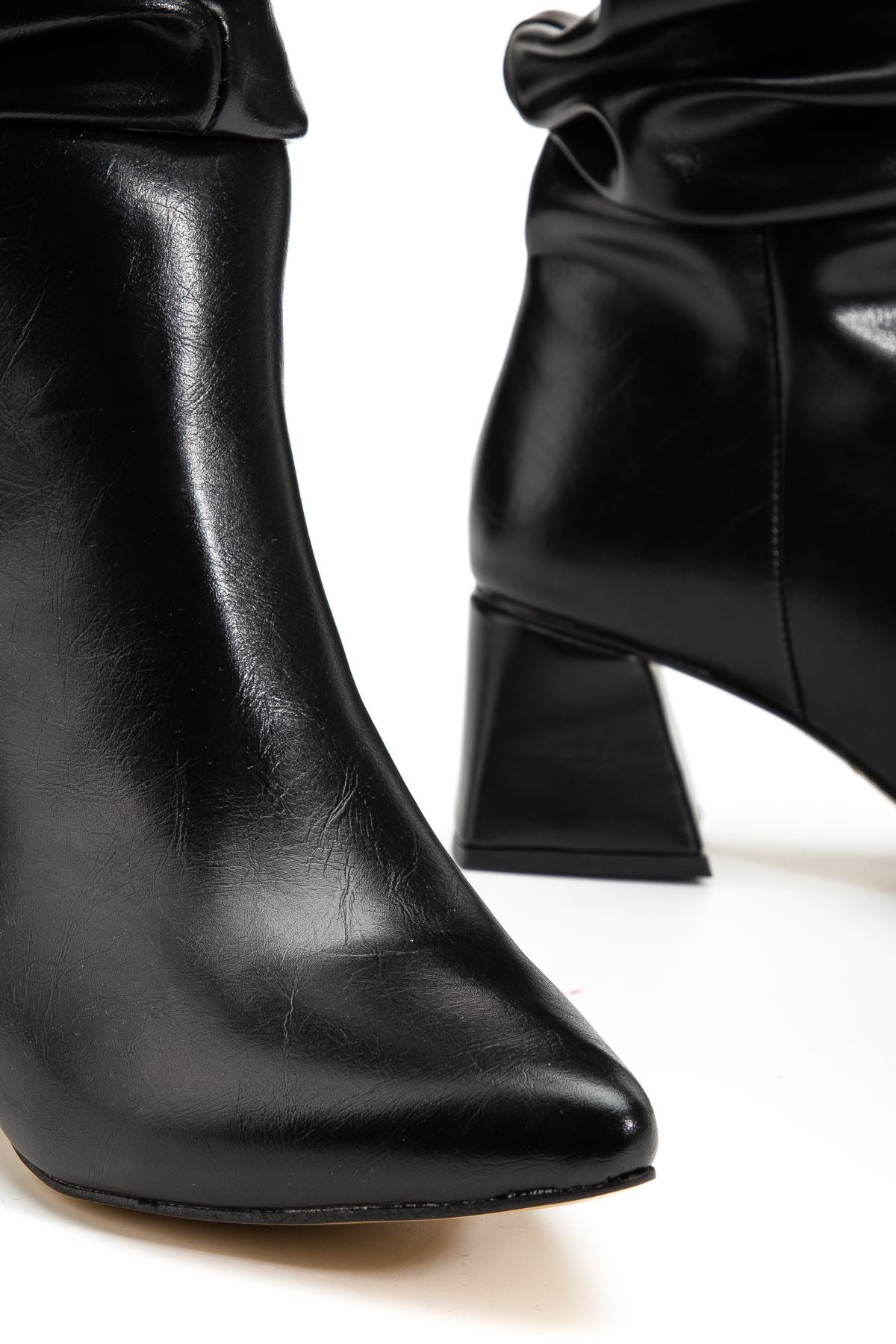 Ayzena Siyah Kırışık Rugan Körüklü Kalın Topuklu Kadın Çizme