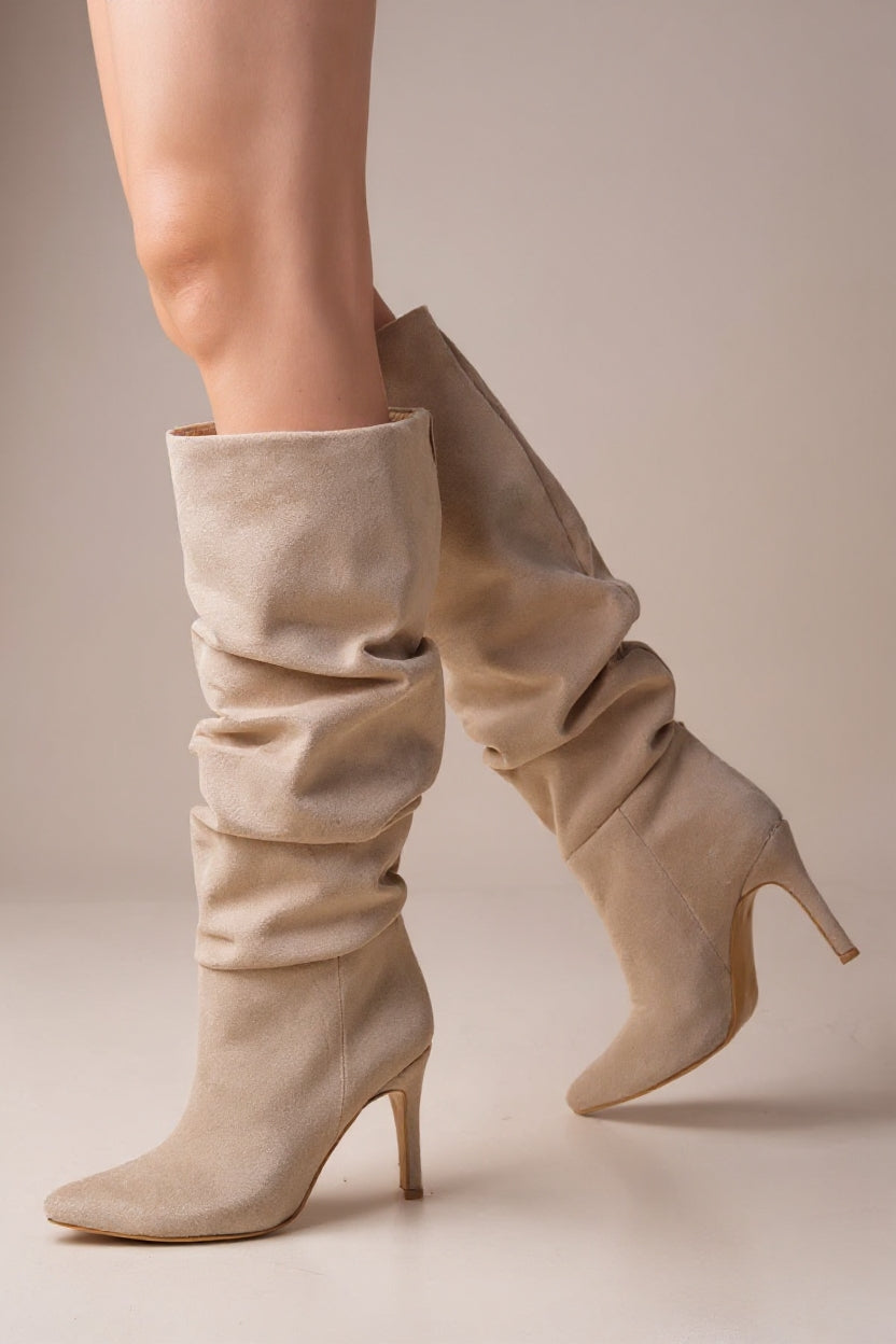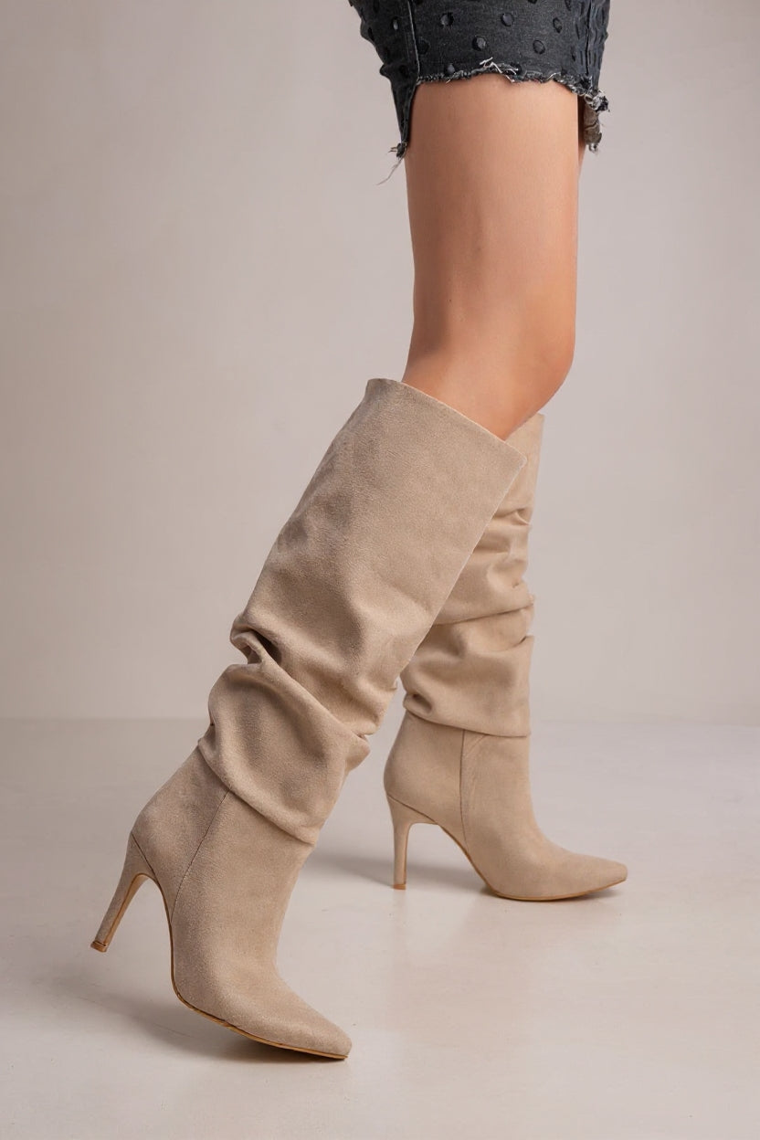 Benan Bej Süet Körüklü İnce Topuklu Kadın Çizme