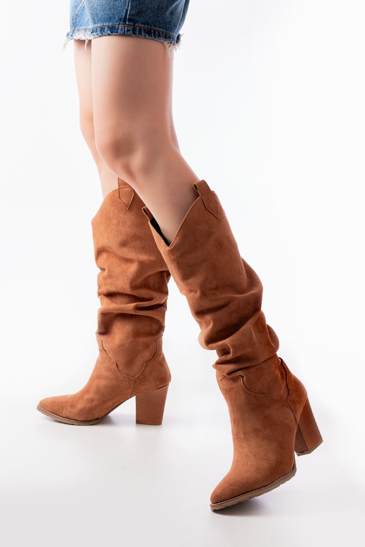 Miuren Taba Süet Körüklü Kalın Topuklu Kadın Çizme