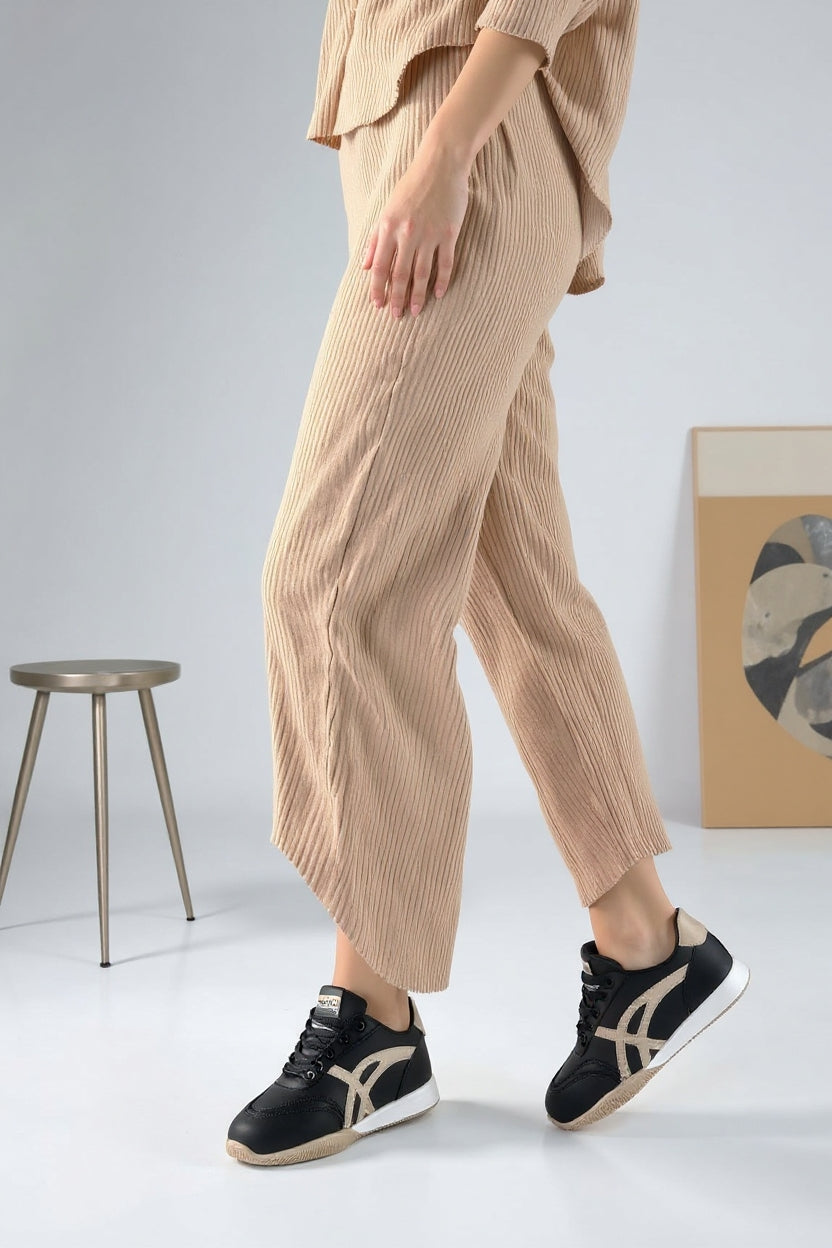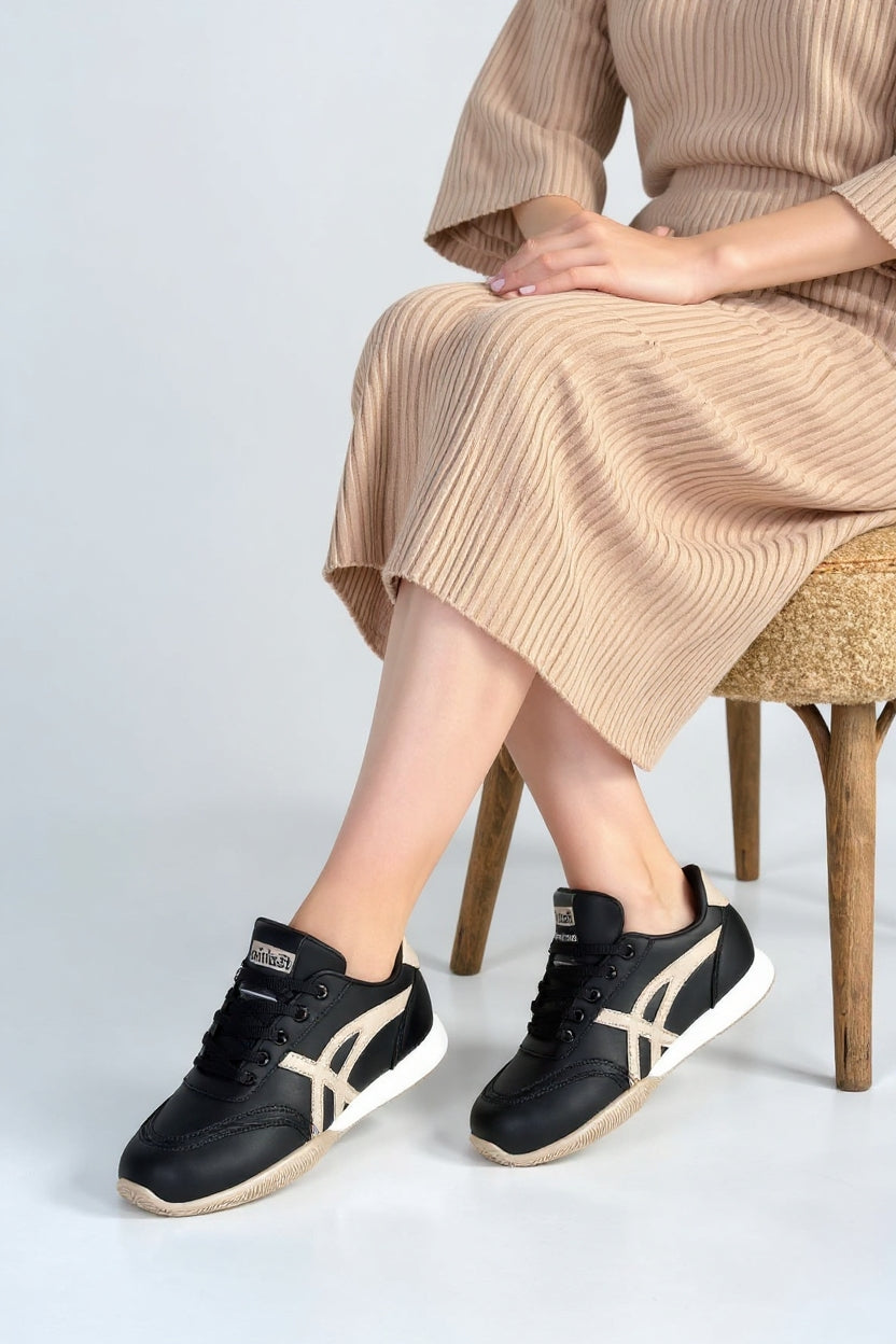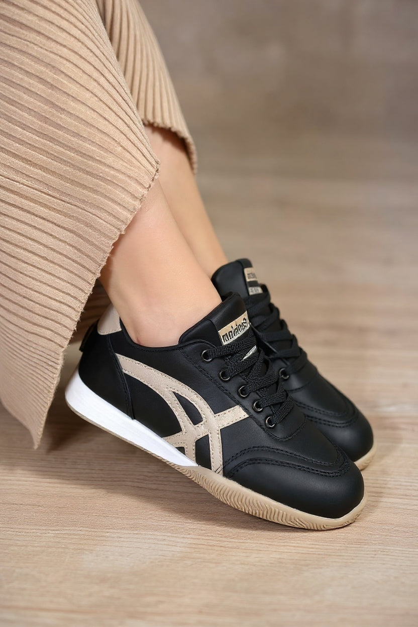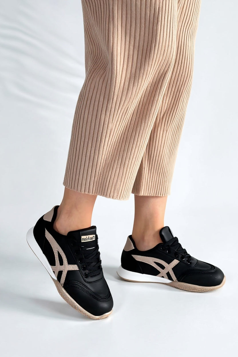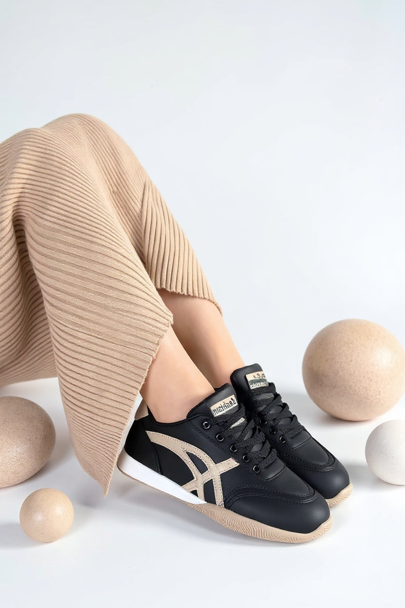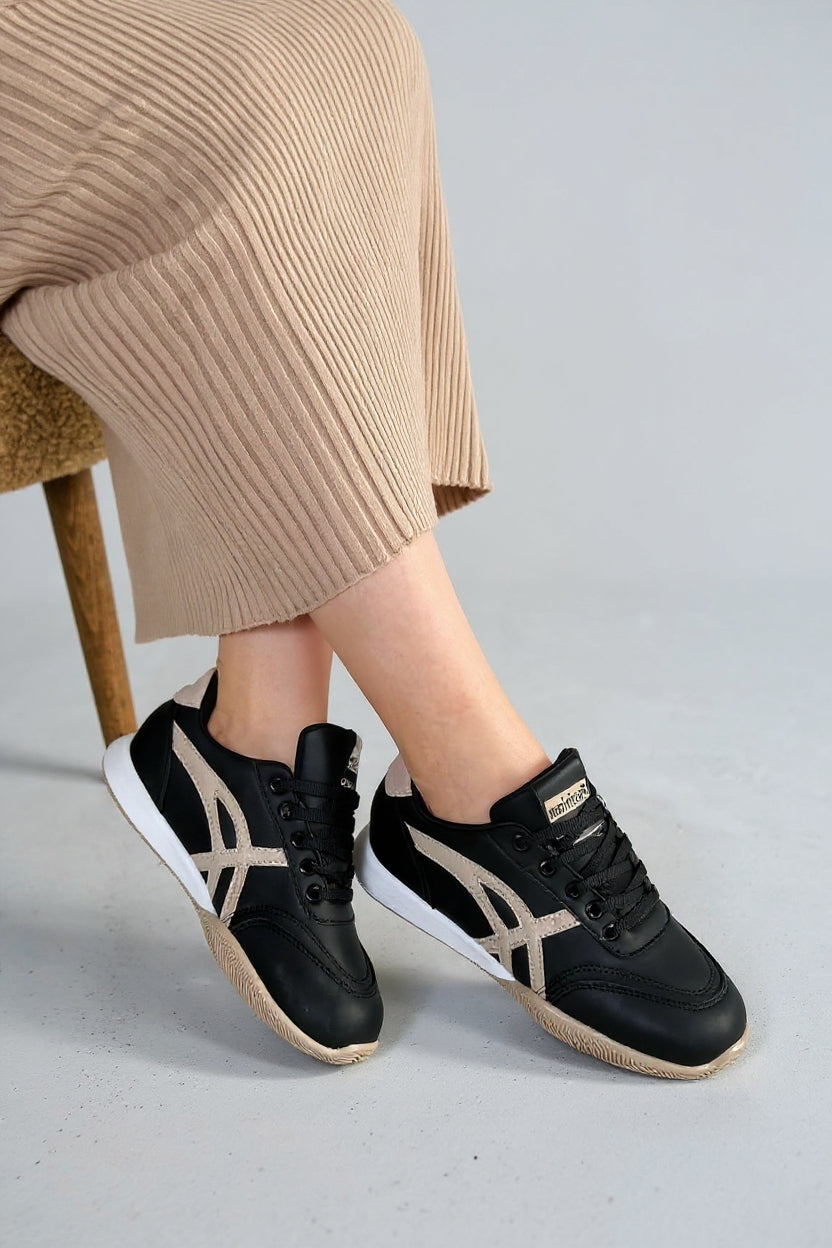 Zlay Kadın Siyah Bağcıklı Bej Desenli Spor Ayakkabı