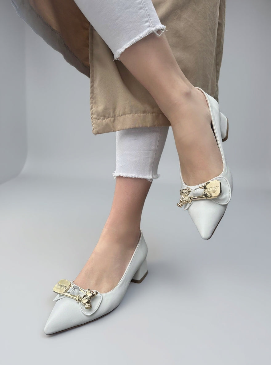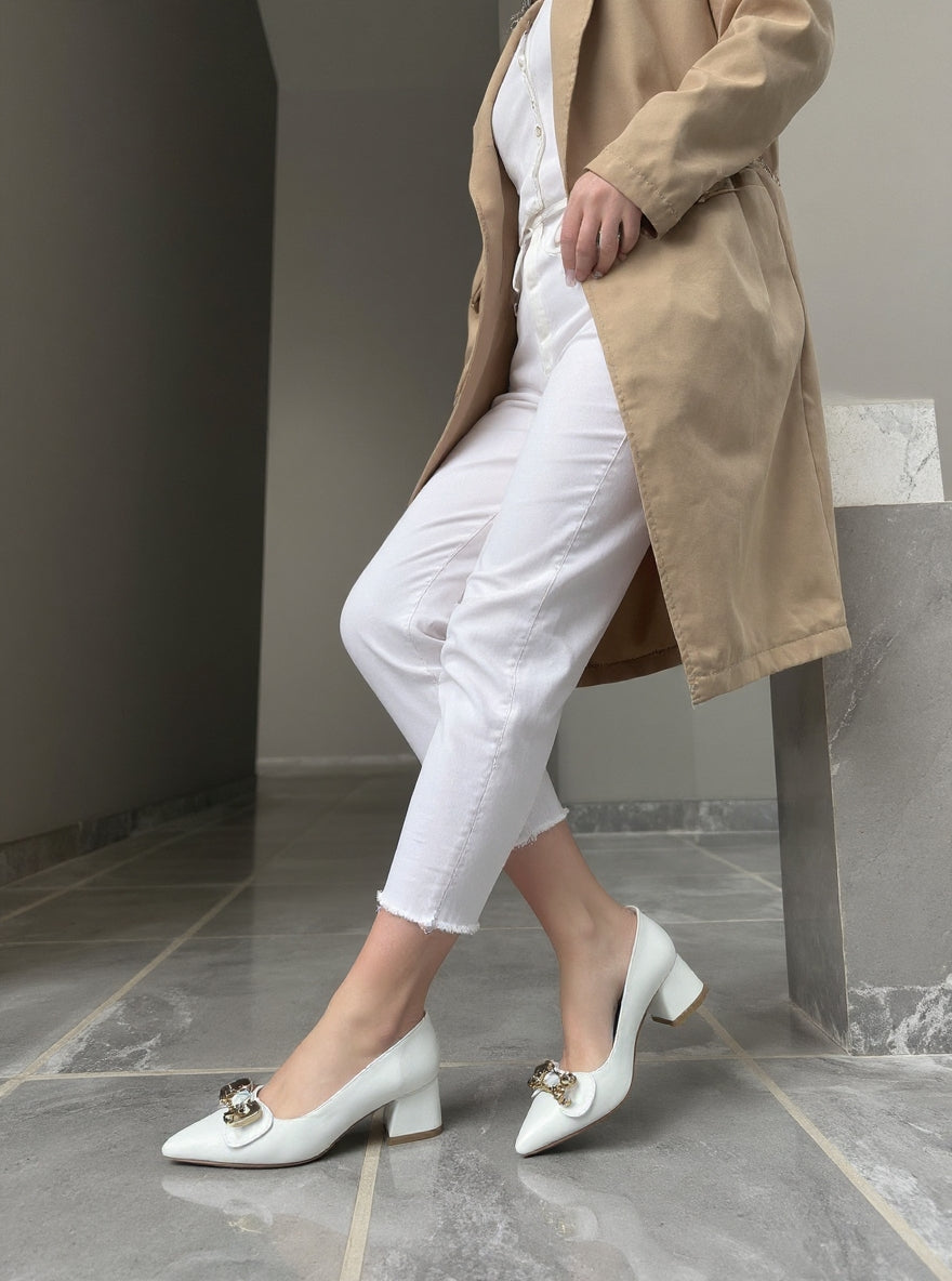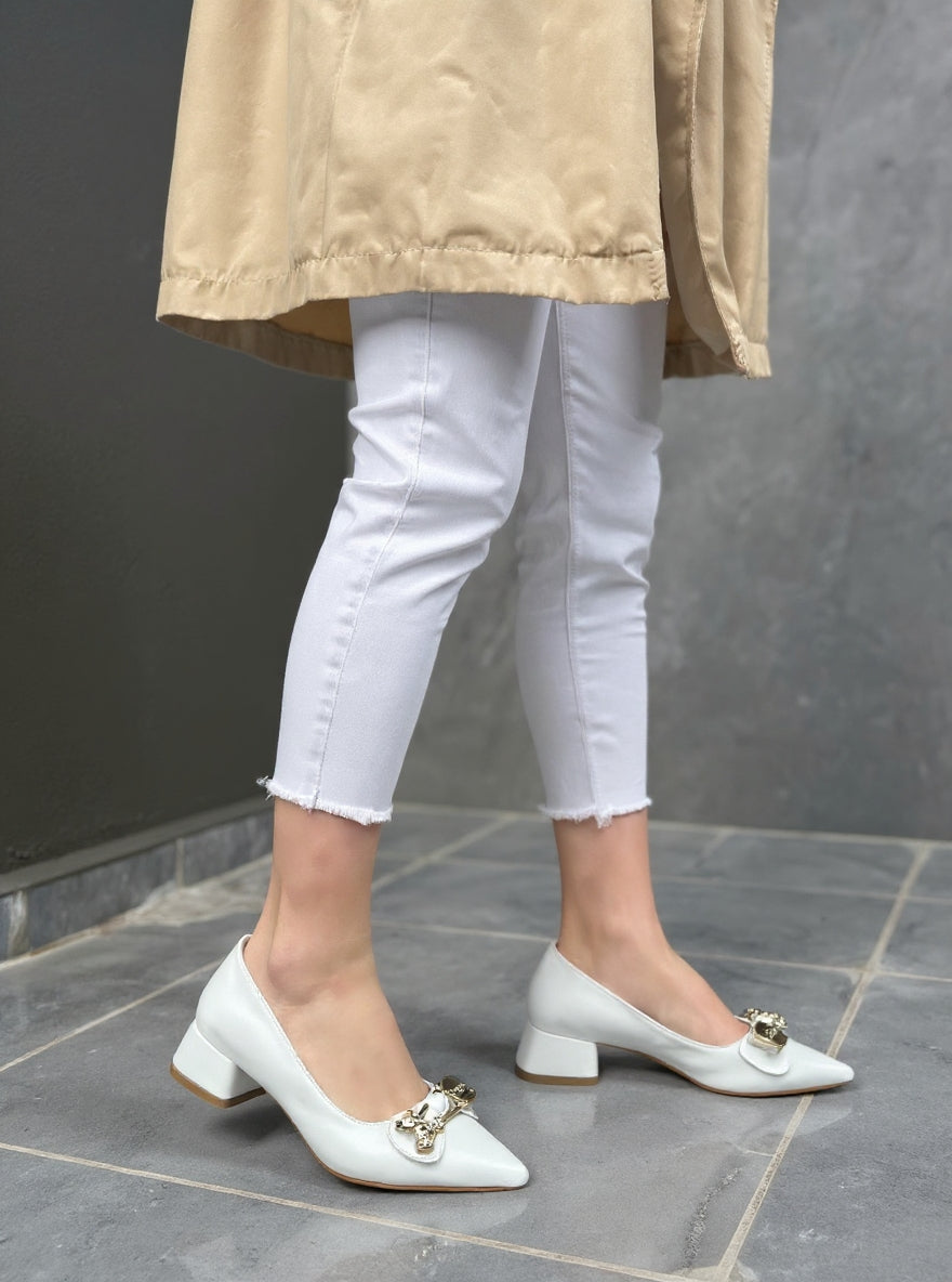 Jies Kadın Beyaz Kapalı Burun Kısa Topuklu Ayakkabı