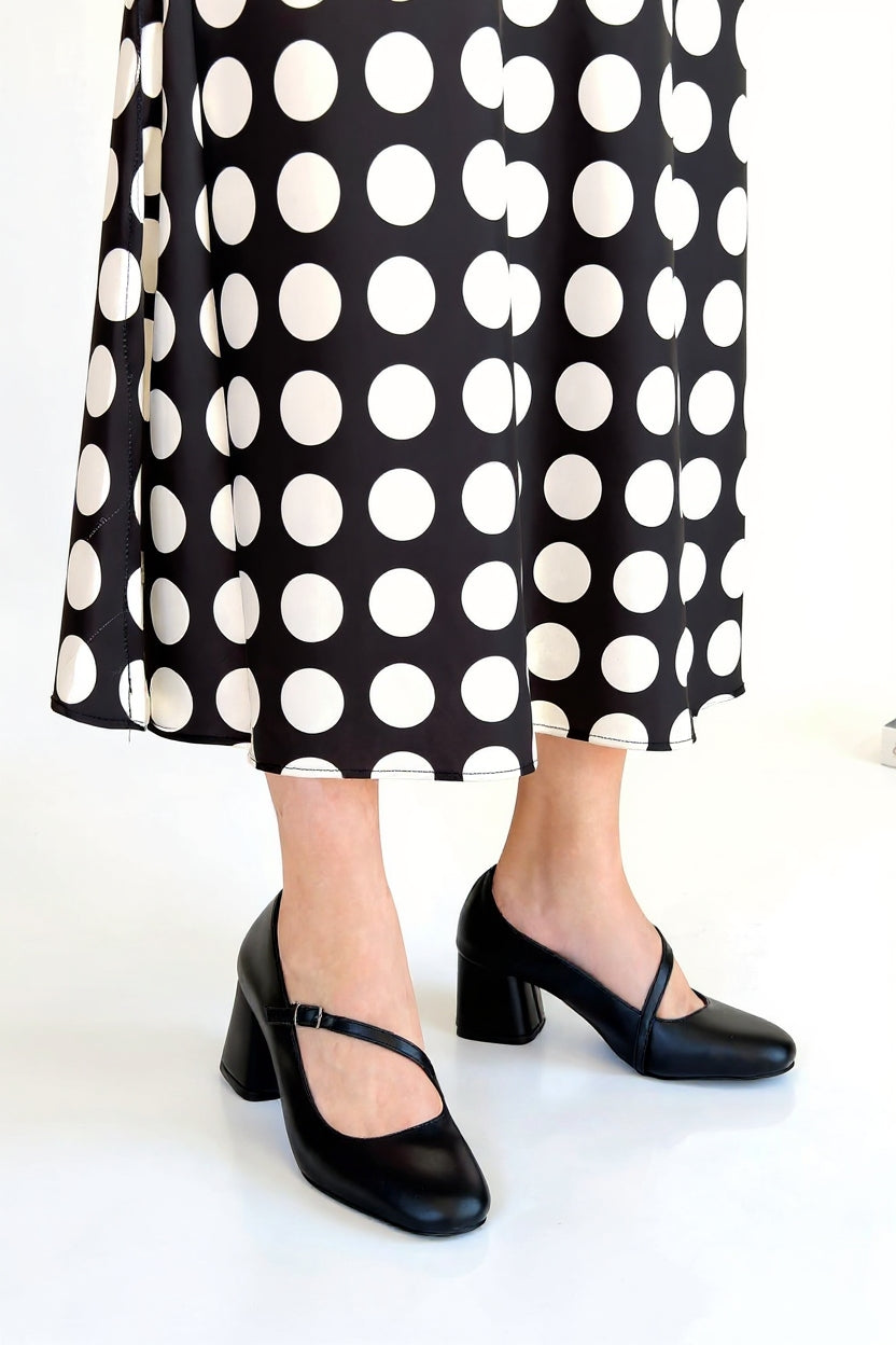 Güçlü duruşu destekleyen kapalı burun formu ve bilekten kemerli yapısıyla Kier, feminen çizgiyi dengeli bir topuk yüksekliğiyle buluşturur. Ayağı sabitleyen kemer detayı sayesinde gün boyu güvenli bir kullanım sunarken, sade tasarımıyla hem ofis kombinlerine hem özel davetlere rahatlıkla uyum sağlar. Dengeli topuk yapısı, zarif bir siluet oluştururken konfordan ödün vermez.