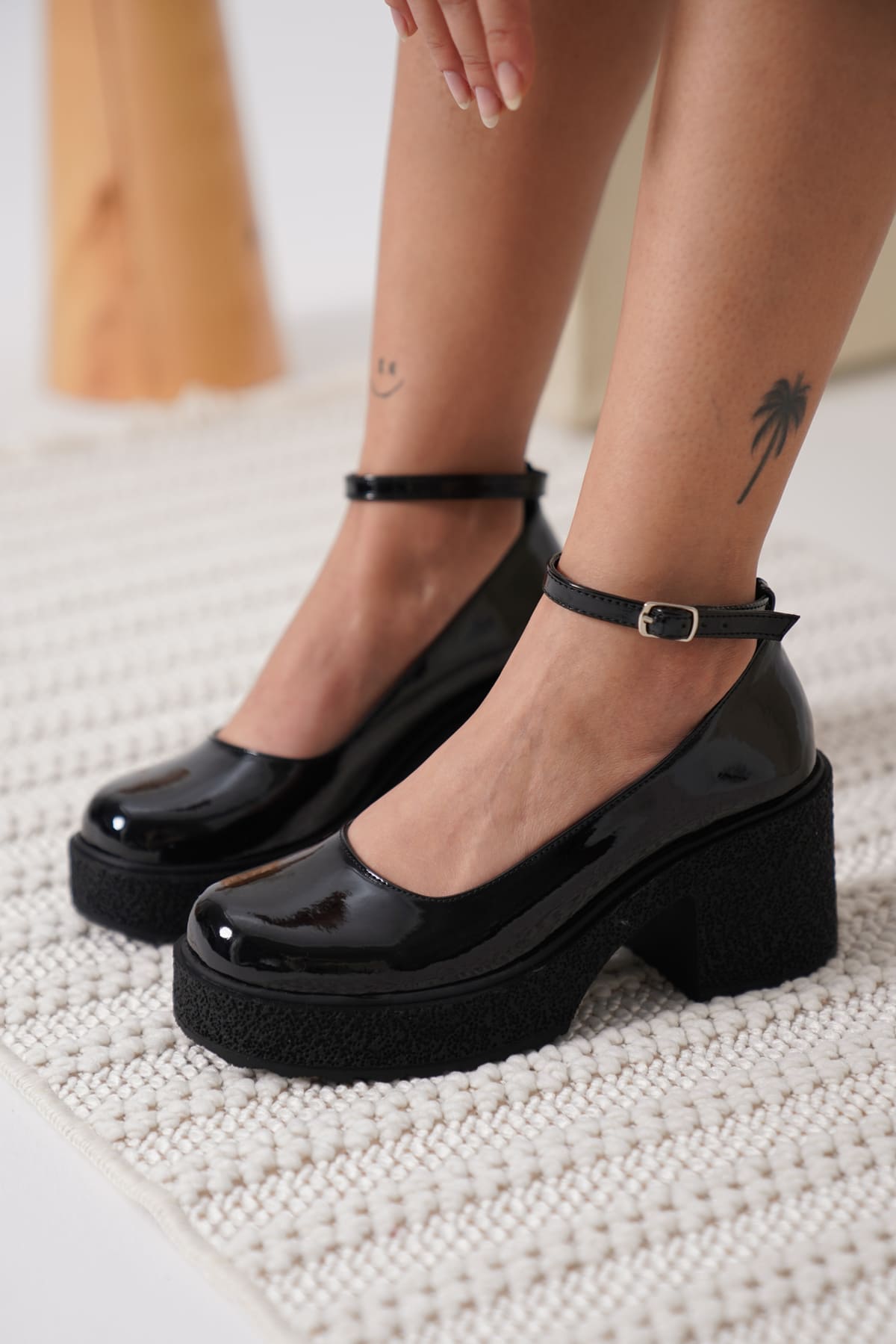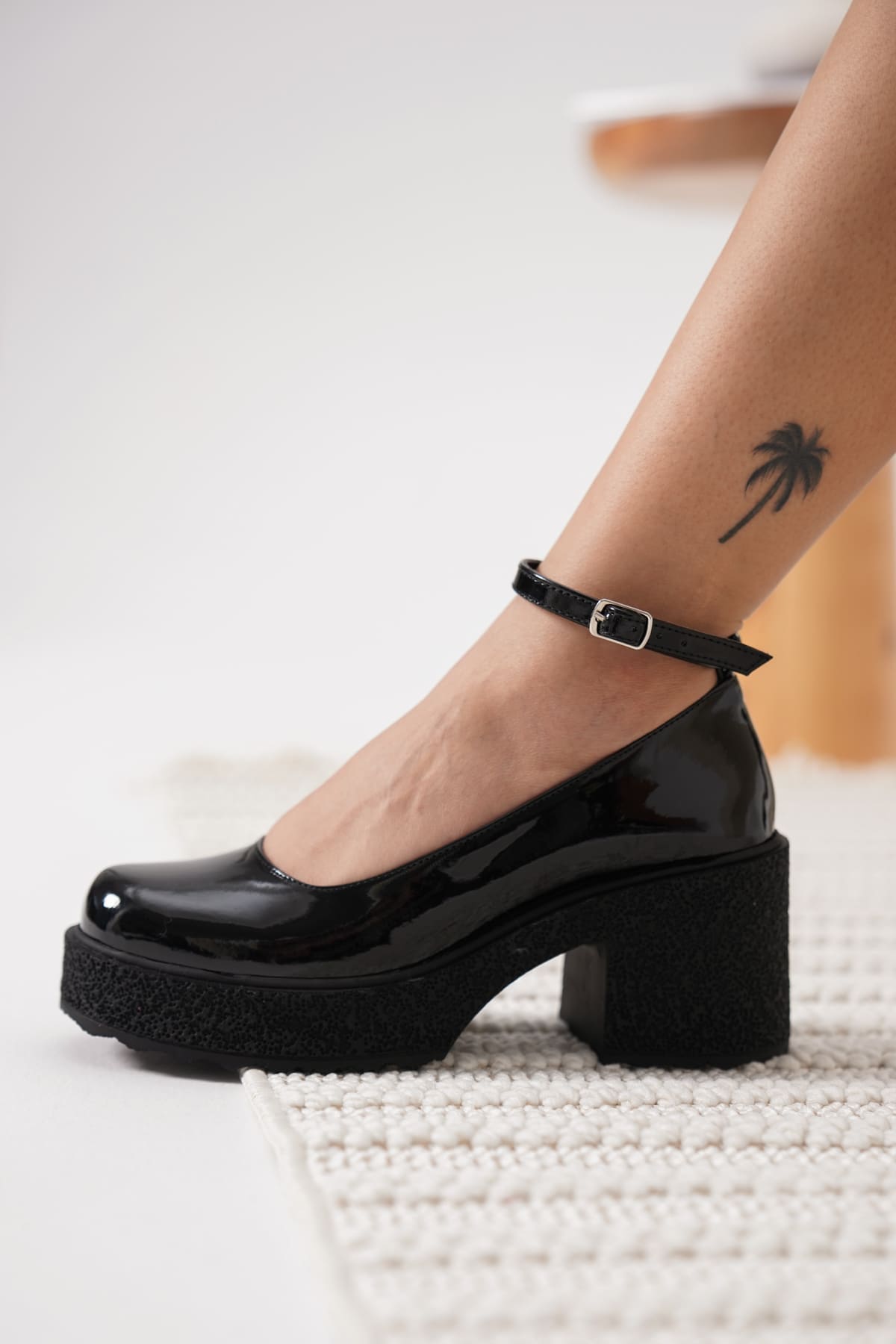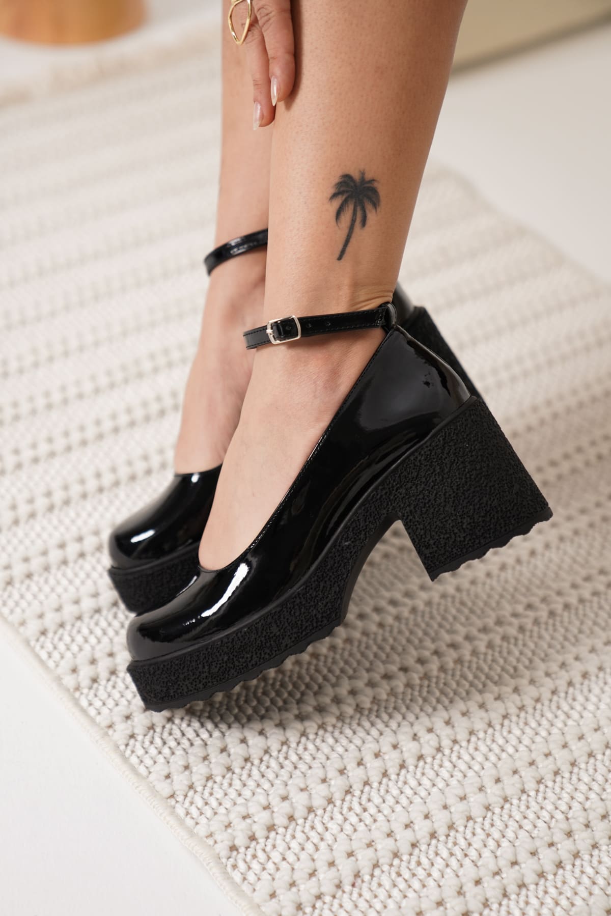 Marla Kadın Siyah Rugan Bilekten Bantlı Günlük Kalın Topuklu Ayakkabı