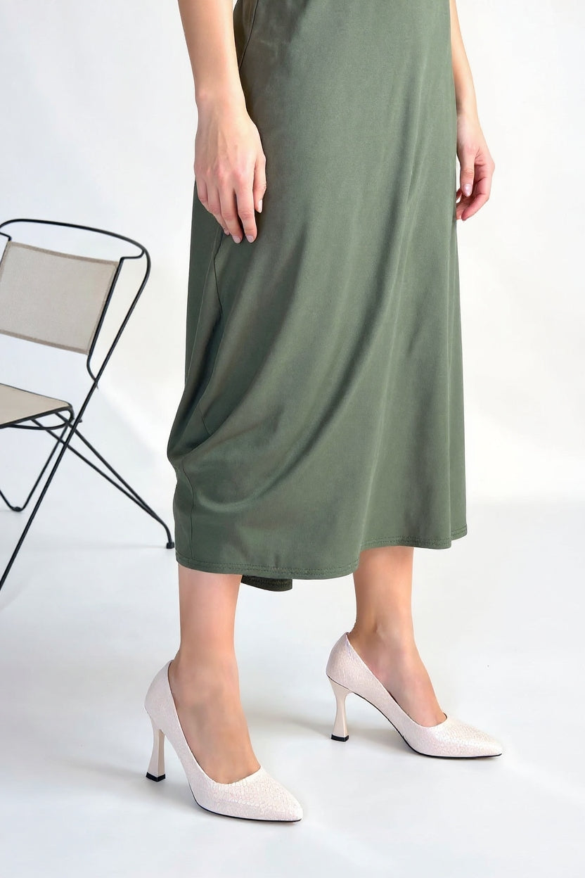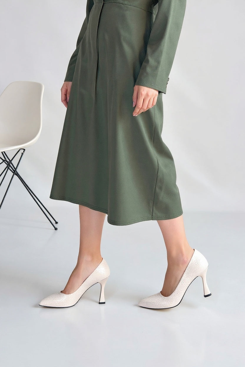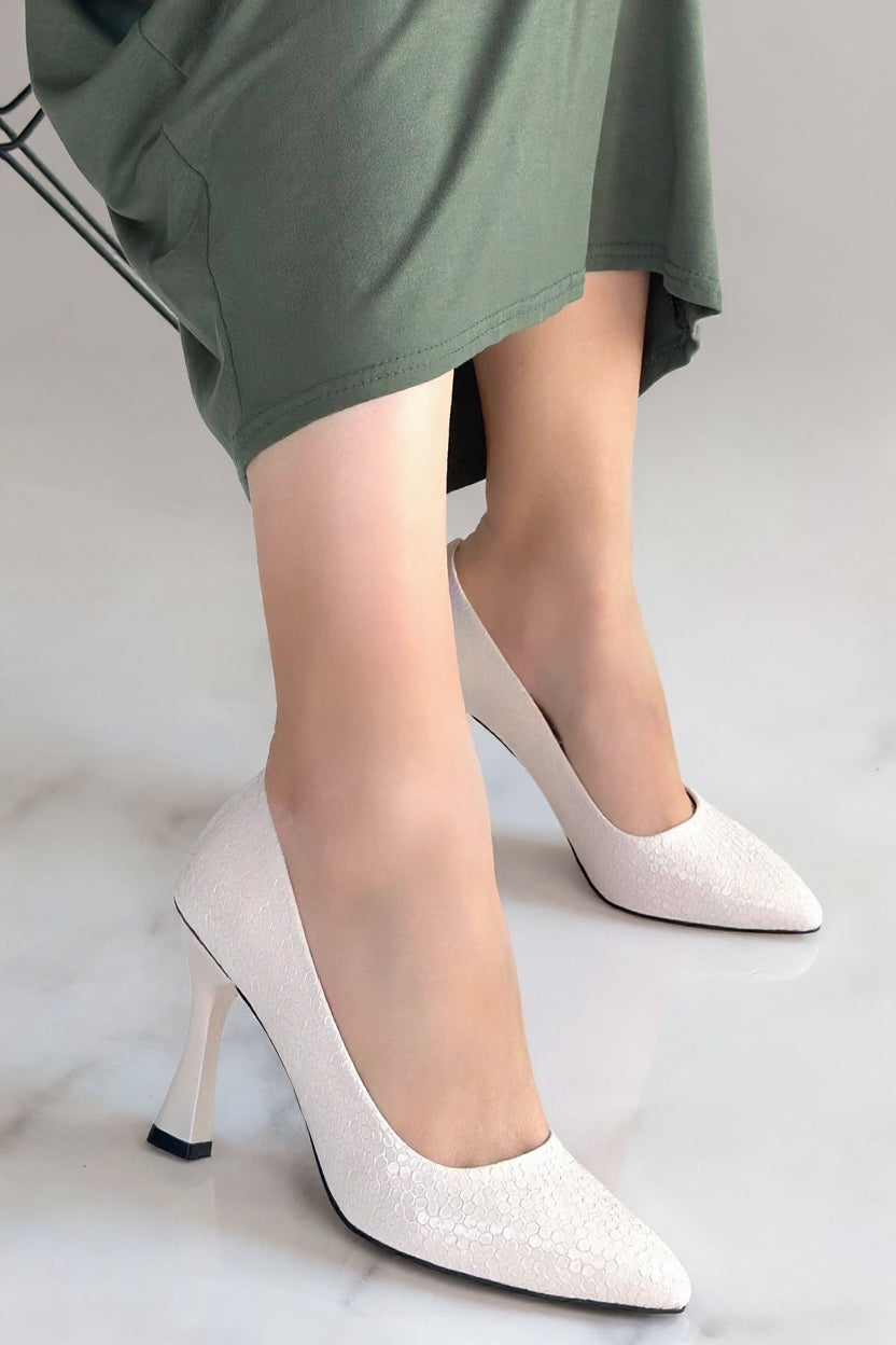 Zarif duruşu öne çıkaran Merio, baskılı yüzeyiyle klasik topuklu ayakkabılara güçlü bir karakter kazandırır. Kapalı burun formu sayesinde dengeli ve net bir siluet sunarken, orta-yüksek topuk yapısı gün boyu konforlu bir kullanım sağlar. İnce detaylarıyla hem ofis kombinlerine hem de özel davet stiline kolayca uyum sağlar.