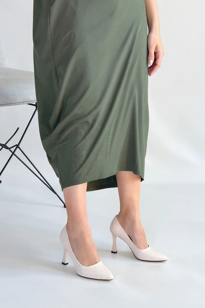 Merio Kadın Bej Baskılı Kapalı Burun Topuklu Ayakkabı