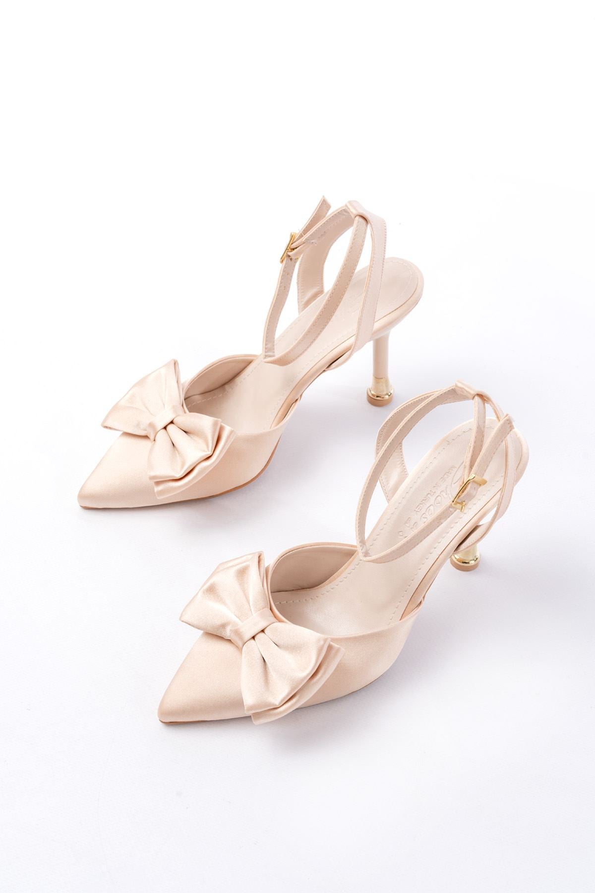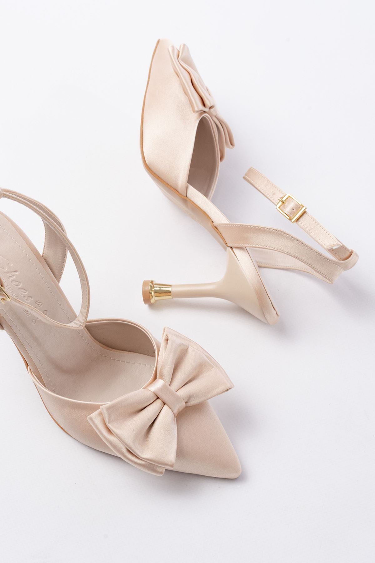 Purlene Bej Saten Arkası Açık Kurdele Detaylı İnce Kadın Topuklu Ayakkabı