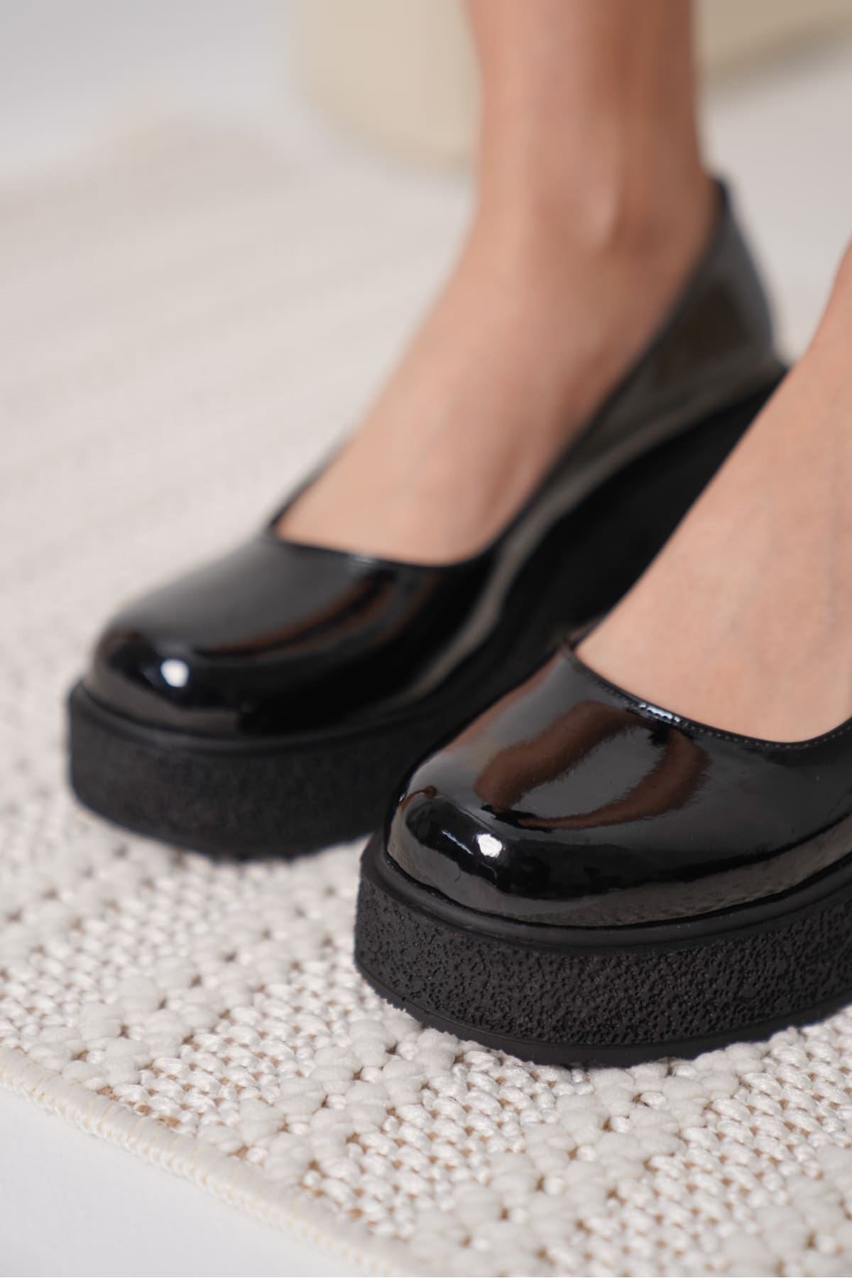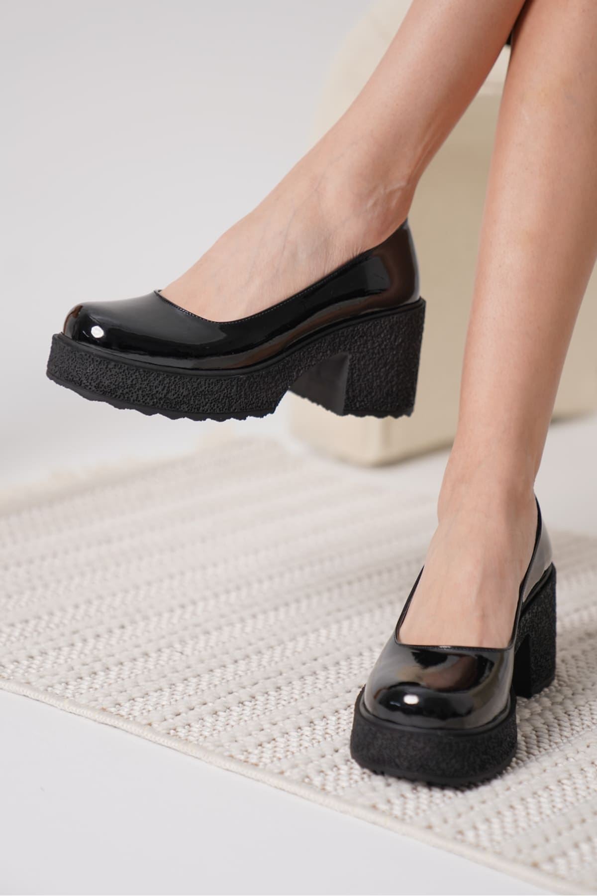 Talya Kadın Siyah Rugan Kısa Kalın Topuklu Ayakkabı