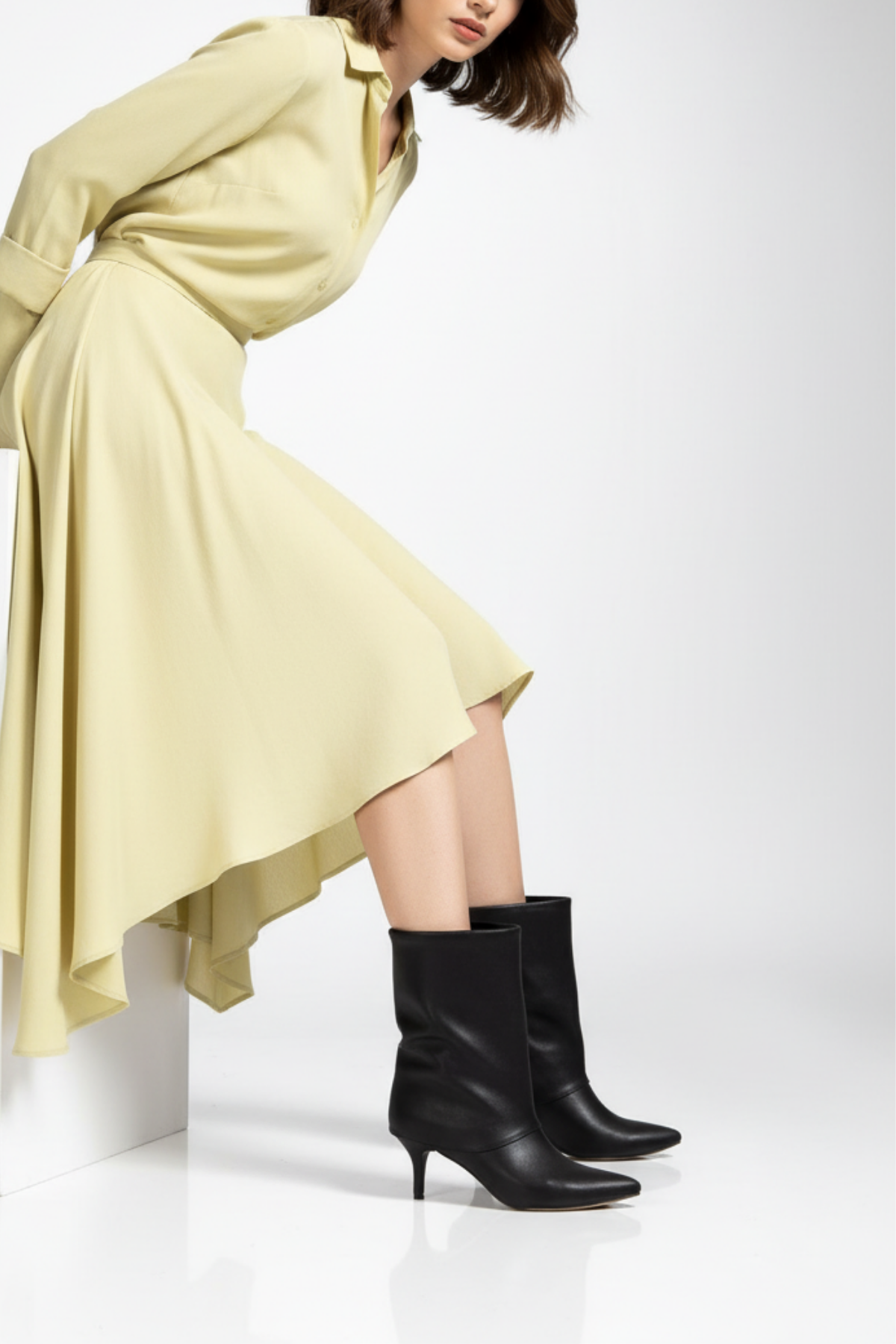 Zamansız çizgileri ve dengeli topuk yapısıyla öne çıkan Zenora modeli, sade tasarımını güçlü bir siluetle birleştirir. Yakalı formu bilek hattını net biçimde sararken, ince topuğu feminen ve kontrollü bir duruş kazandırır. Minimal detaylarla şekillenen bu bot, şehir stiline uyum sağlayan güçlü, net ve modern bir alternatif sunar.
