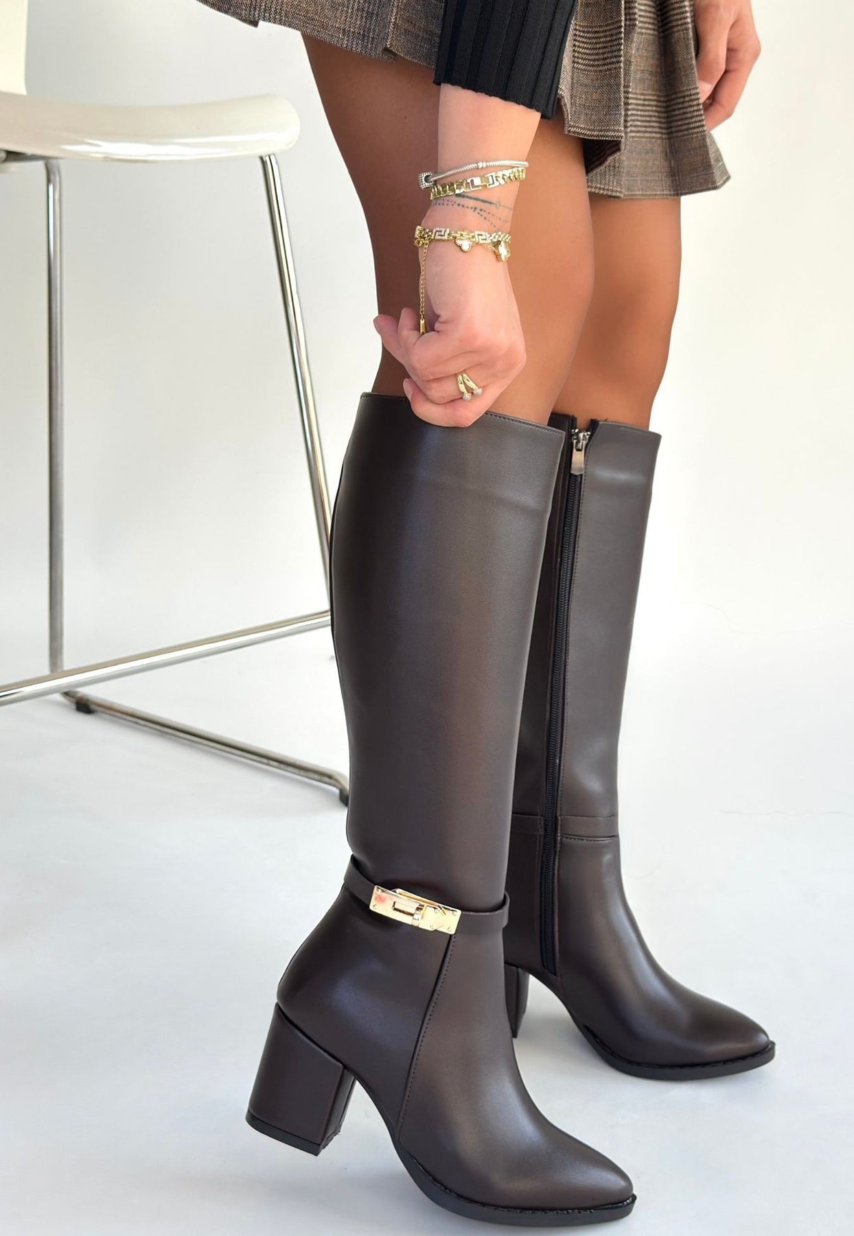 Jeoli Kadın Kahverengi Tokalı Diz Altı Topuklu Çizme