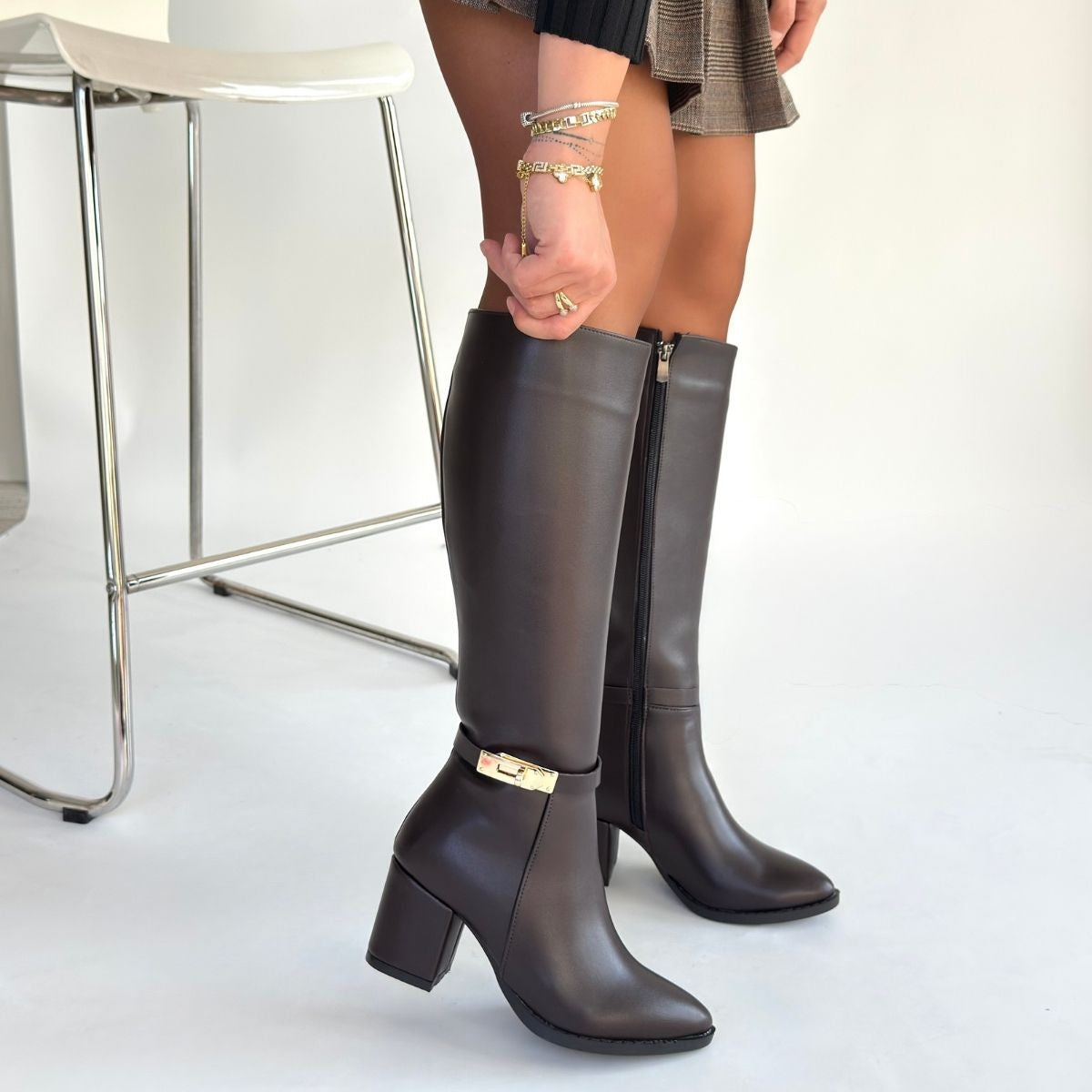 Zarif altın detaylı tokasıyla klasik diz altı çizmeye modern bir dokunuş katan bu model, hem şehir stilinde hem de özel kombinlerde güçlü bir duruş sağlar. Dengeli topuk yapısı gün boyu rahat adımlar sunarken, yumuşak iç yapısı konforu her an hissettirir.