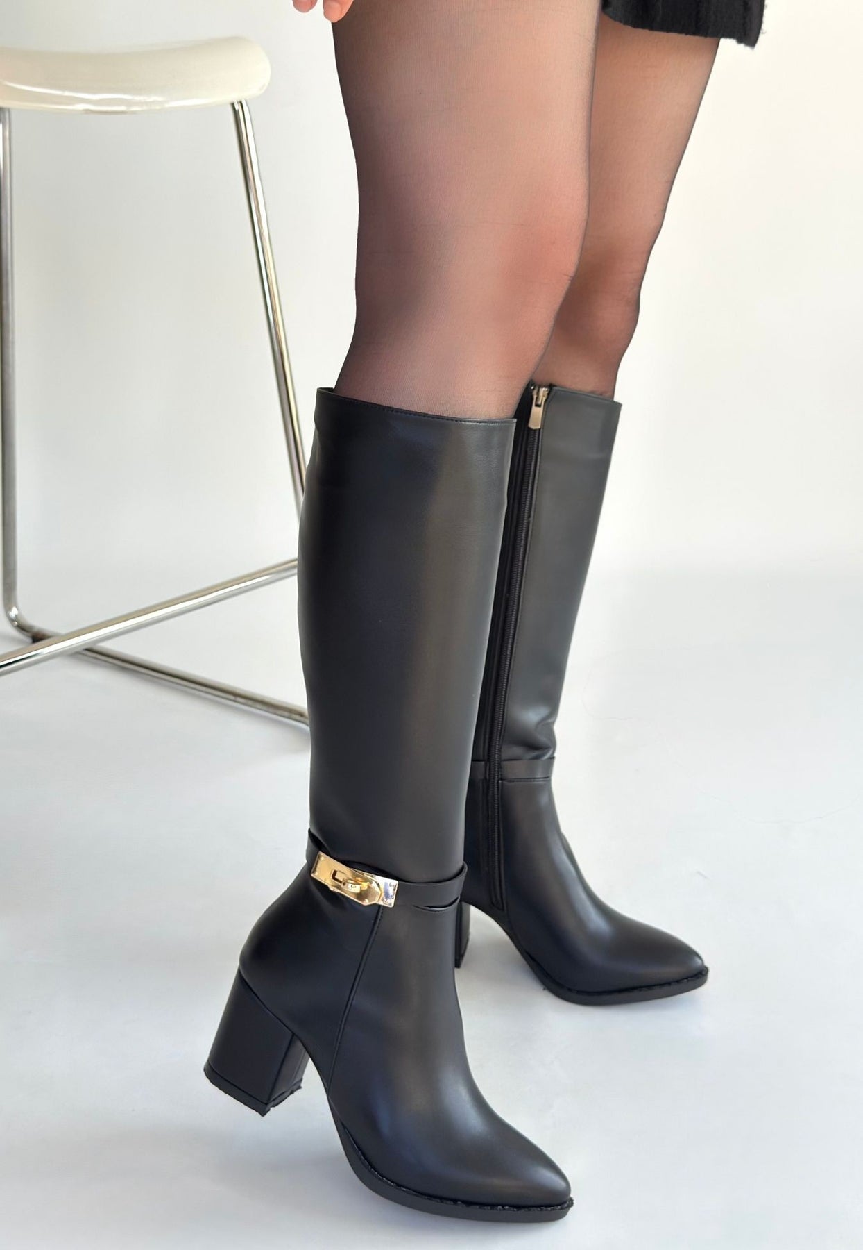 Zarif altın detaylı tokasıyla klasik diz altı çizmeye modern bir dokunuş katan bu model, hem şehir stilinde hem de özel kombinlerde güçlü bir duruş sağlar. Dengeli topuk yapısı gün boyu rahat adımlar sunarken, yumuşak iç yapısı konforu her an hissettirir.