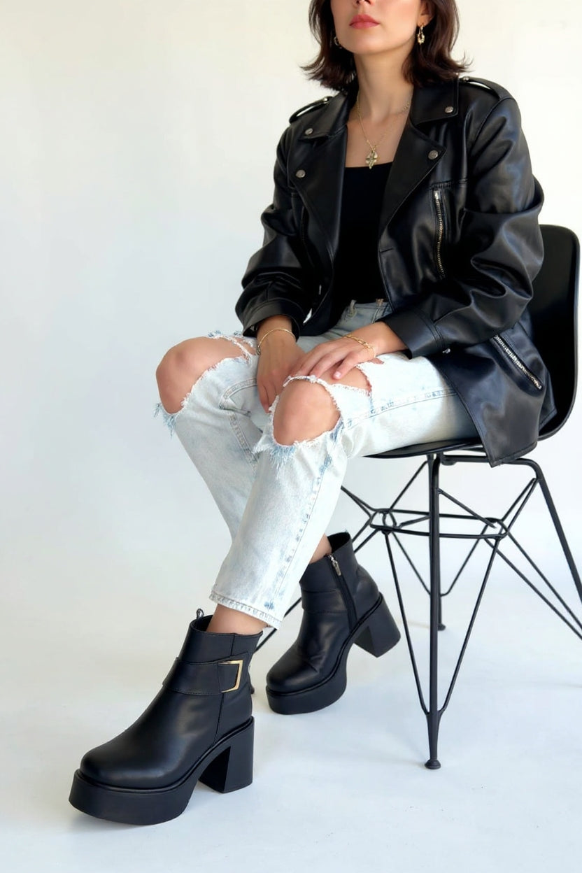 Modern tasarımı ve bilek kısmındaki gösterişli tokasıyla karakterli bir duruş sunan bu model, yüksek topuğu sayesinde görünümü zarifçe yükseltirken sağlam taban yapısıyla gün boyu dengeli adımlar sağlar. Şehir stiline güçlü bir dokunuş ekleyen iddialı bir tercih.