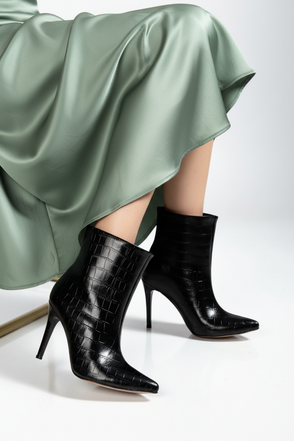 Kroko dokusuyla güçlü bir duruş sergileyen Mirelle modeli, sivri burun formu ve ince topuğuyla feminen bir siluet oluşturur. Bilek hizasında biten yapısı bacağı zarif gösterirken, dengeli topuk formu tasarıma modern bir karakter kazandırır. Şık ve iddialı kombinlerin tamamlayıcısı olarak öne çıkar.