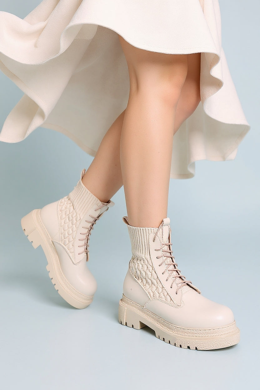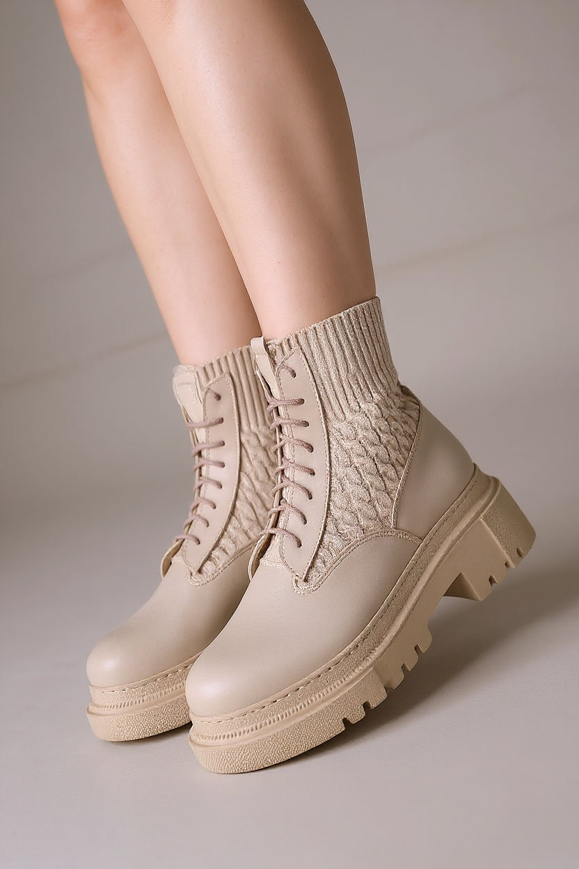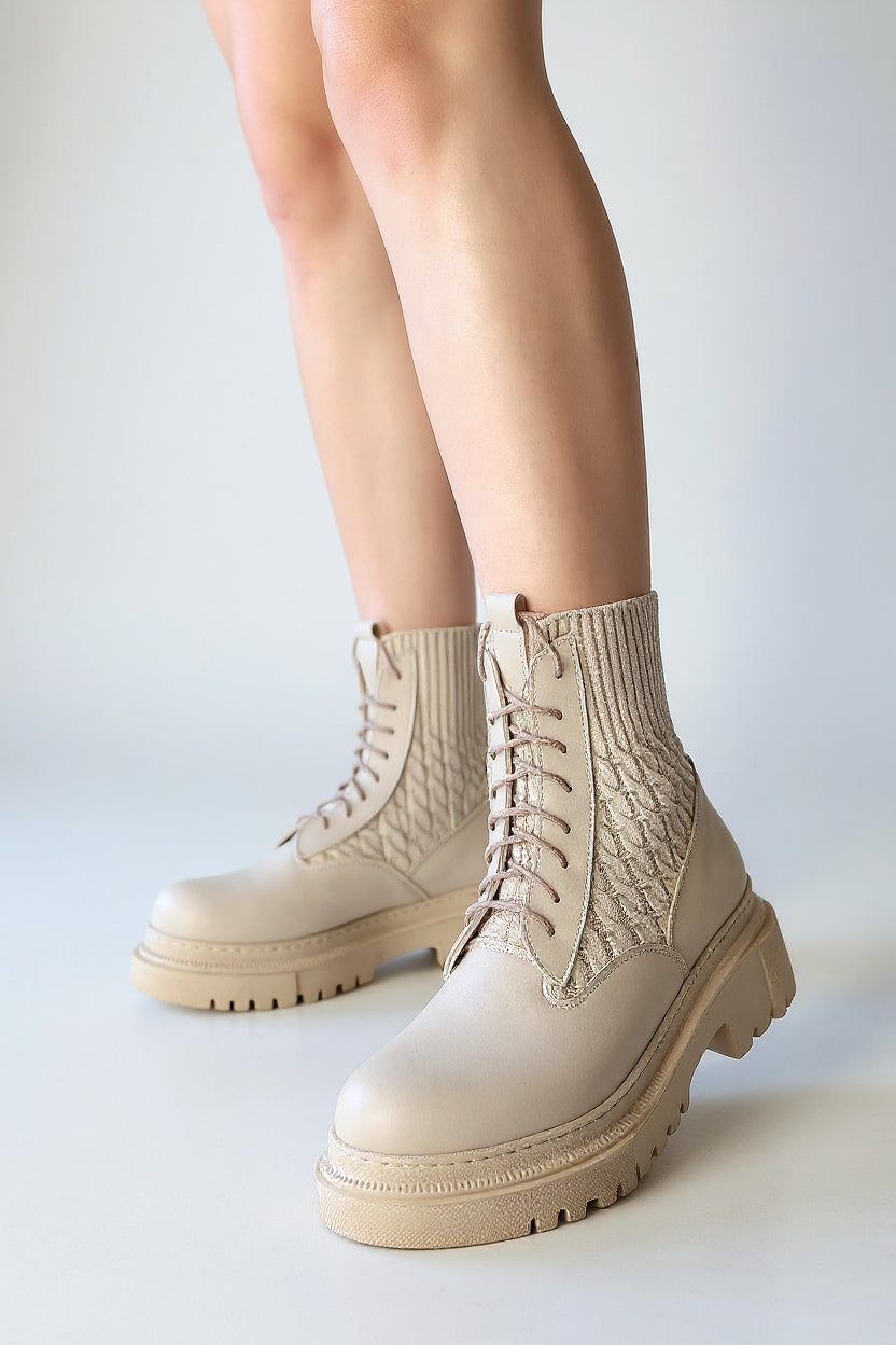 Utag bej bağcıklı bot, zarif ve dinamik tasarımıyla sezonun öne çıkan modellerinden biri. PU deri dış yüzeyi ve örgü detaylı esnek bilek kısmı, hem konfor hem de modern bir görünüm sunar. Yandan fermuarlı yapısı giyimi kolaylaştırırken, poli tabanı sağlam zemin tutuşu sağlar. Gün boyu rahat adımlar atmak isteyenler için stil ve işlevselliği bir arada sunar.