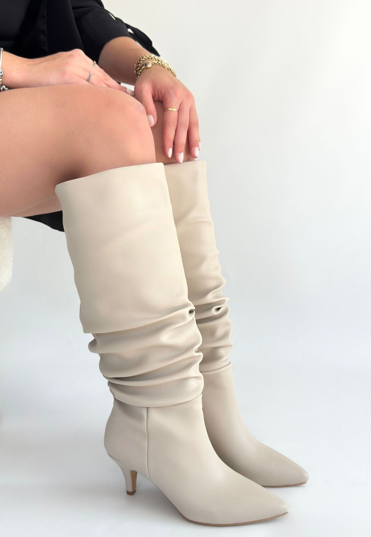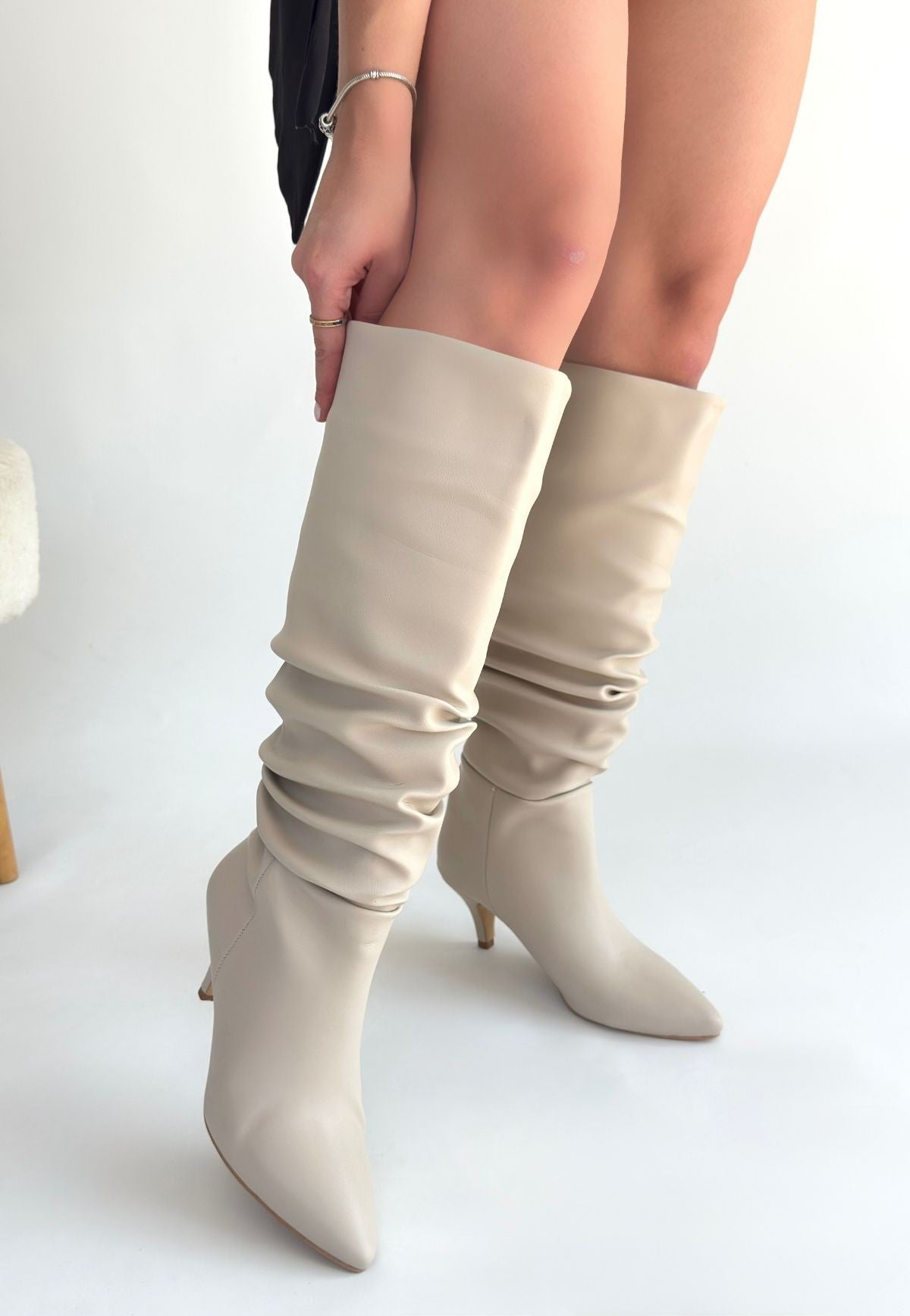 Kış sezonunun en zarif dokunuşu! Zelya bej cilt topuklu çizme, körüklü tasarımı ve zarif topuk formu ile modern feminenliğin simgesi. Diz altı uzunluğu ve parlak cilt dokusuyla her kombine sofistike bir hava katar. Jurdan tabanı ile sağlam adımlar sunarken, konforlu yapısı sayesinde gün boyu rahatlık sağlar.