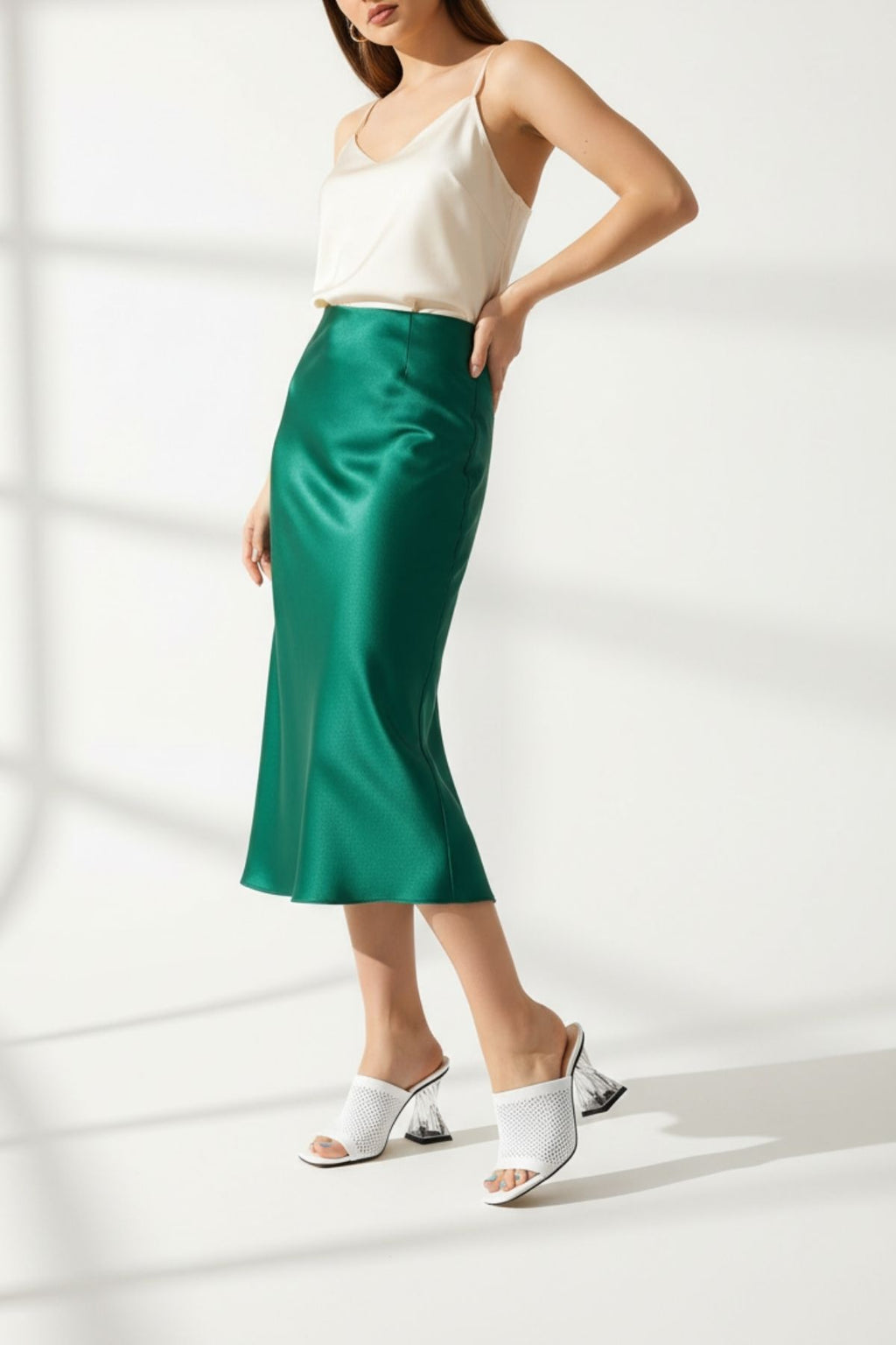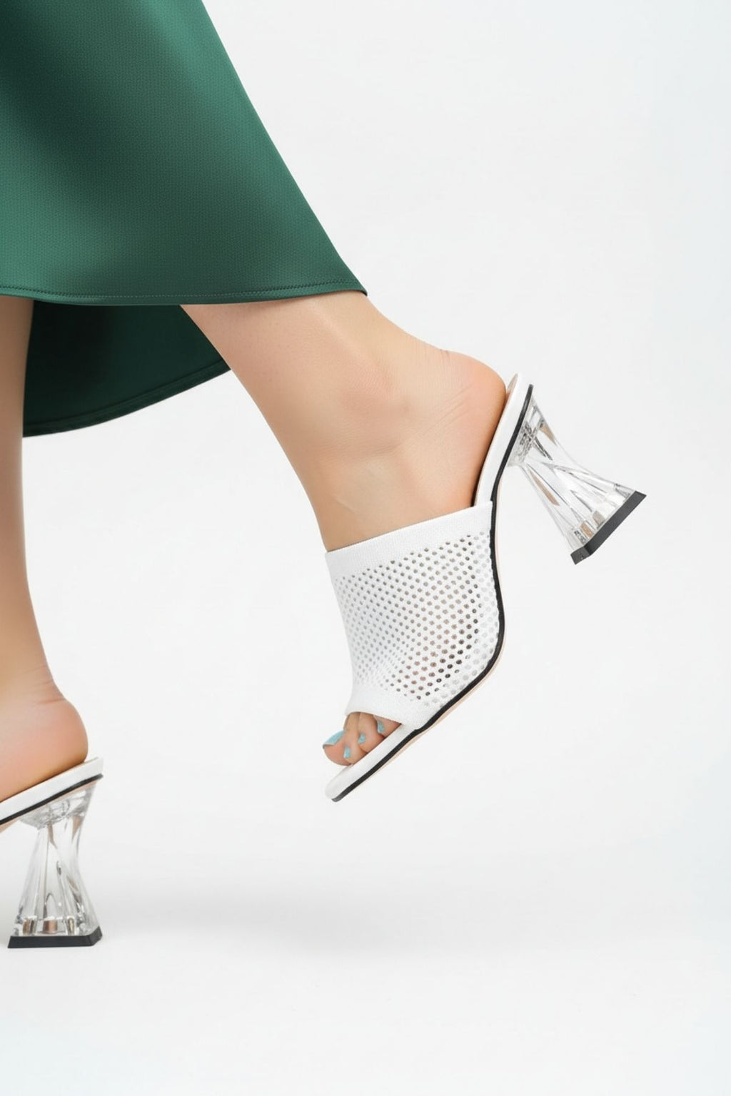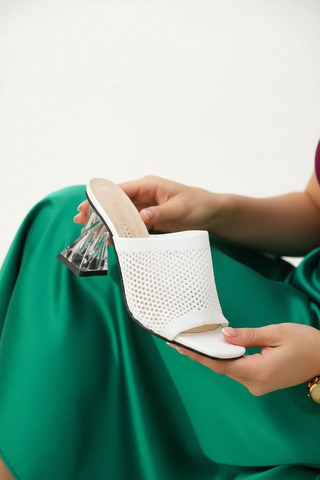 Modern ve dikkat çekici tasarımıyla stiline iddialı bir dokunuş katar! Akva beyaz şeffaf topuklu terlik, triko dokulu üst yüzeyi ve özgün topuk formu ile hem günlük kombinlerde hem özel davetlerde rahatlıkla tercih edilebilir. Ayağı saran yapısı ve dengeli topuk tasarımı sayesinde şıklıkla birlikte konfor sunar. Minimal görünümü güçlü bir detayla buluşturan bu model, yaz stilinin öne çıkan parçalarından biridir.