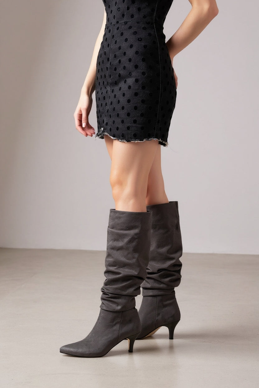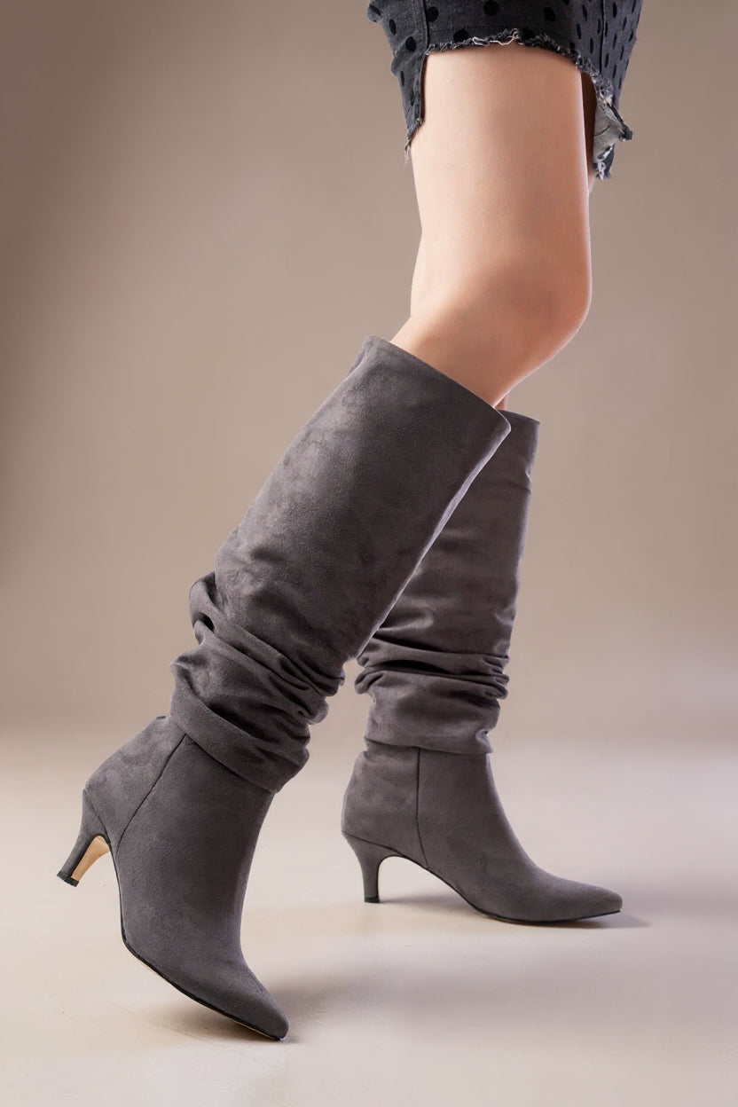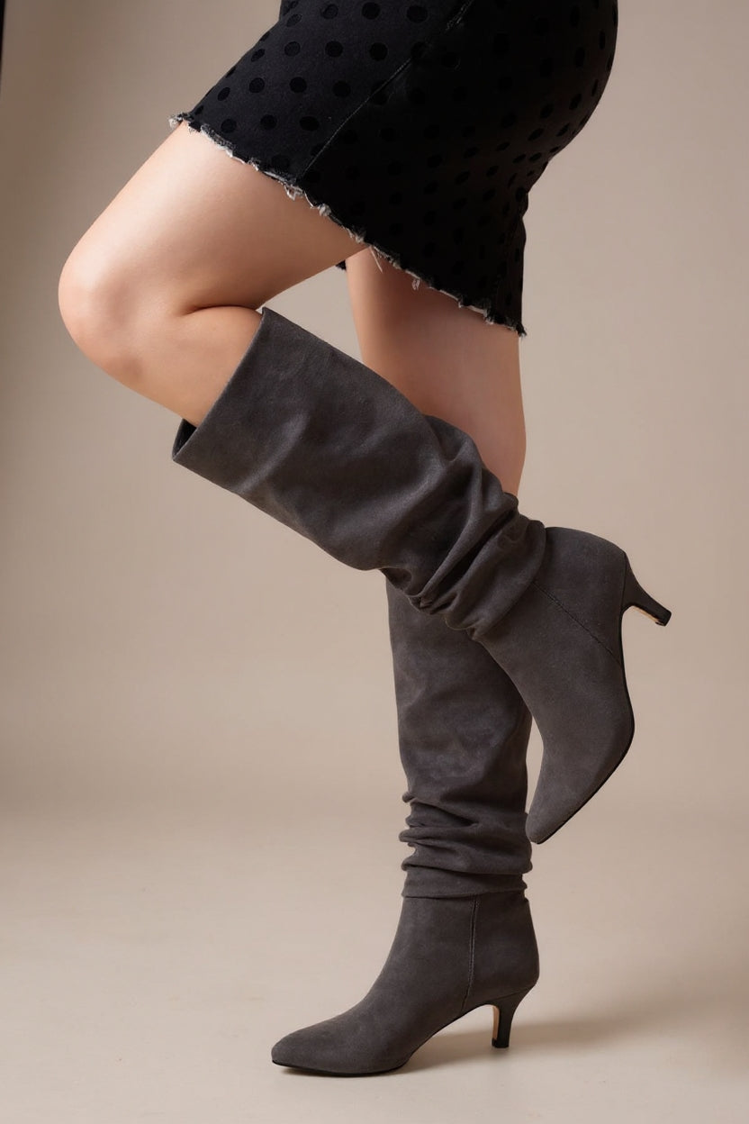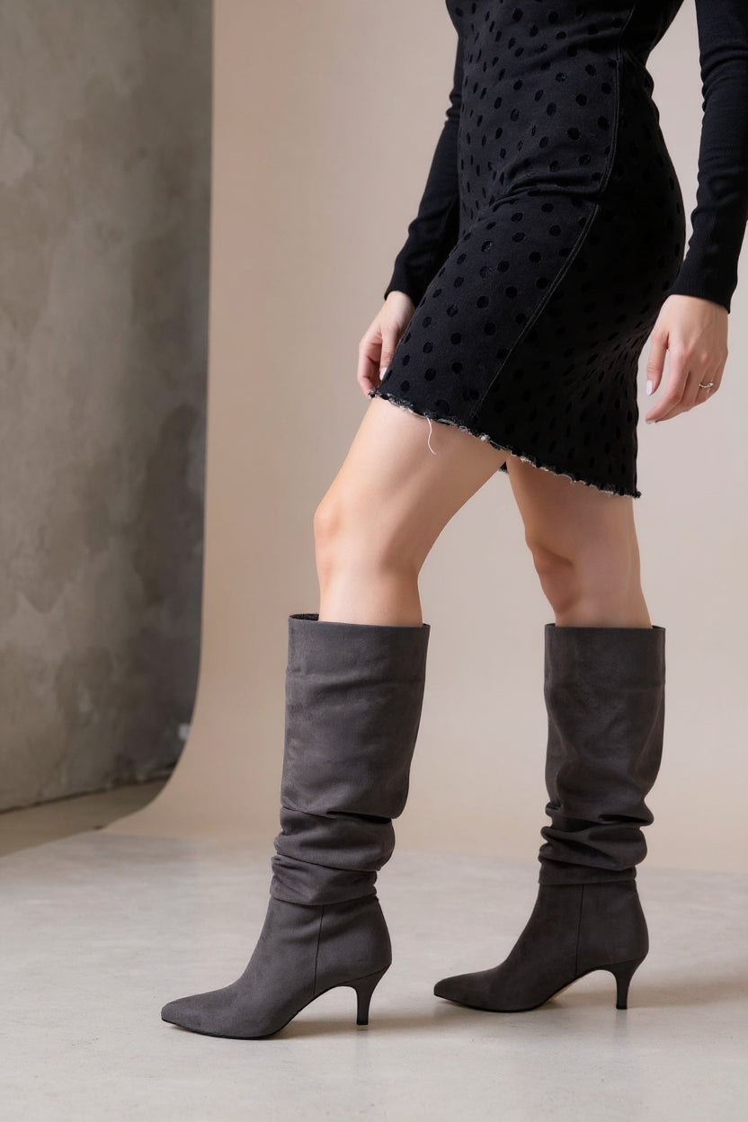 Aybin Gri Süet Körüklü İnce Topuklu Kadın Çizme