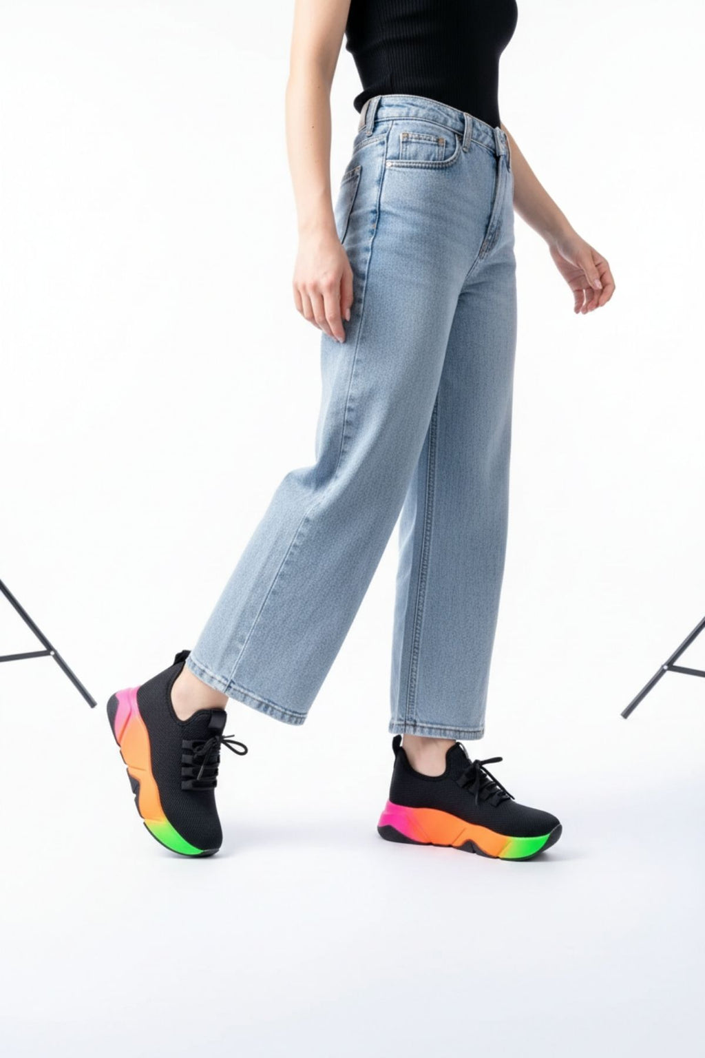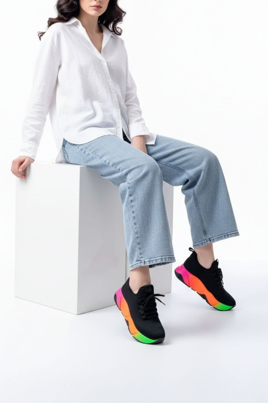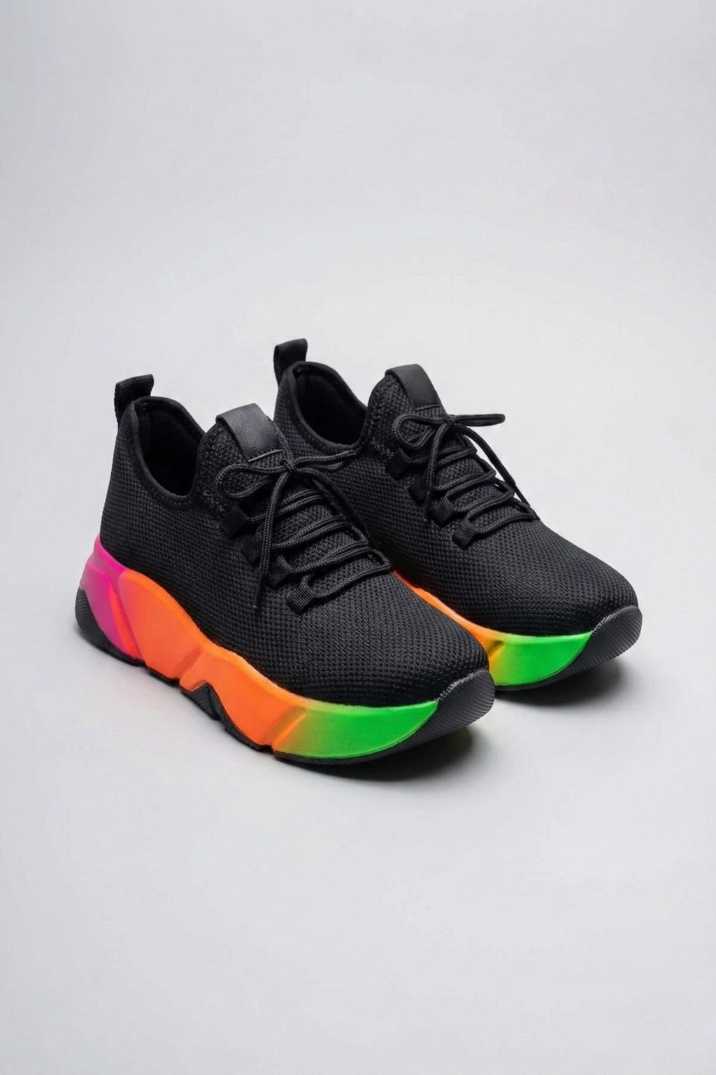 Brumli Siyah Bağcıklı Fileli Renkli Taban Günlük Kadın Spor Ayakkabı RS-400SYHM