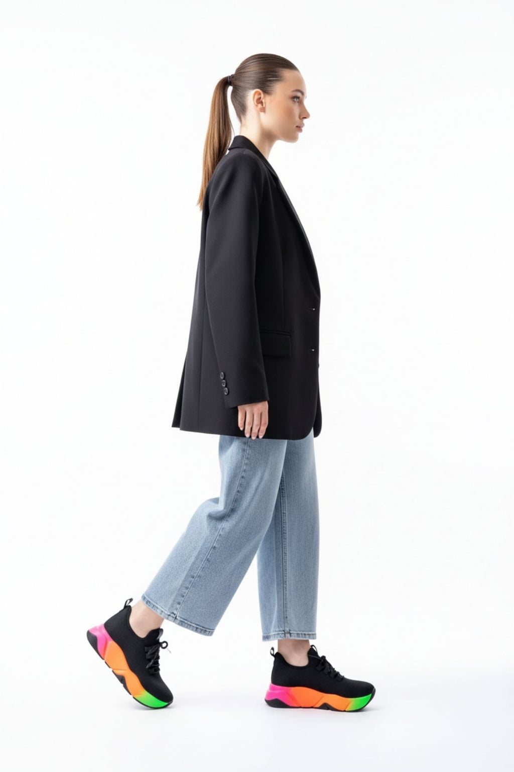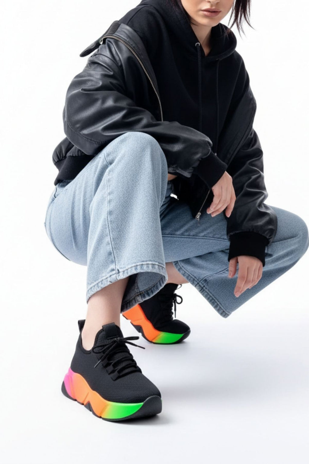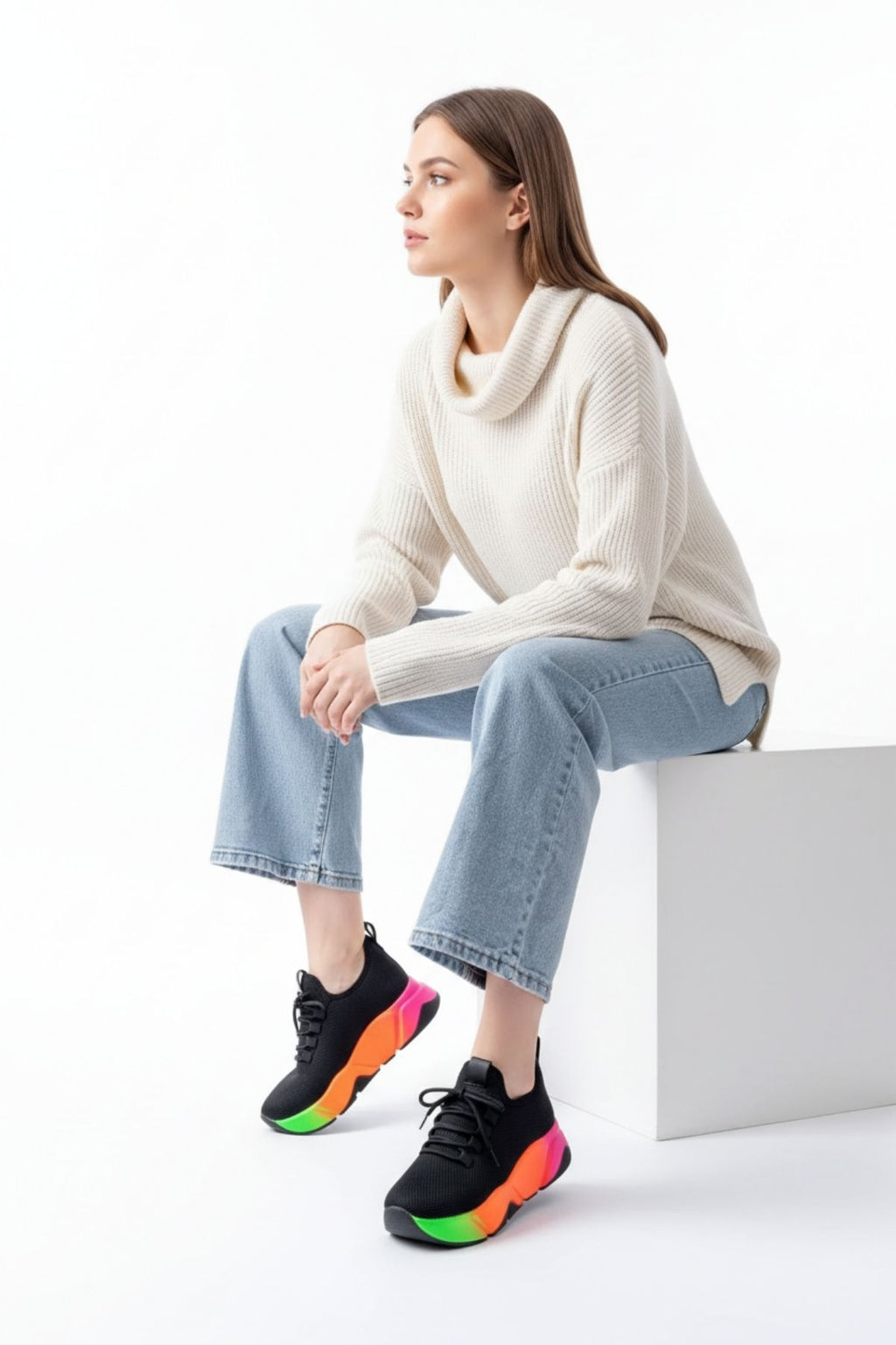 Brumli Siyah Bağcıklı Fileli Renkli Taban Günlük Kadın Spor Ayakkabı RS-400SYHM