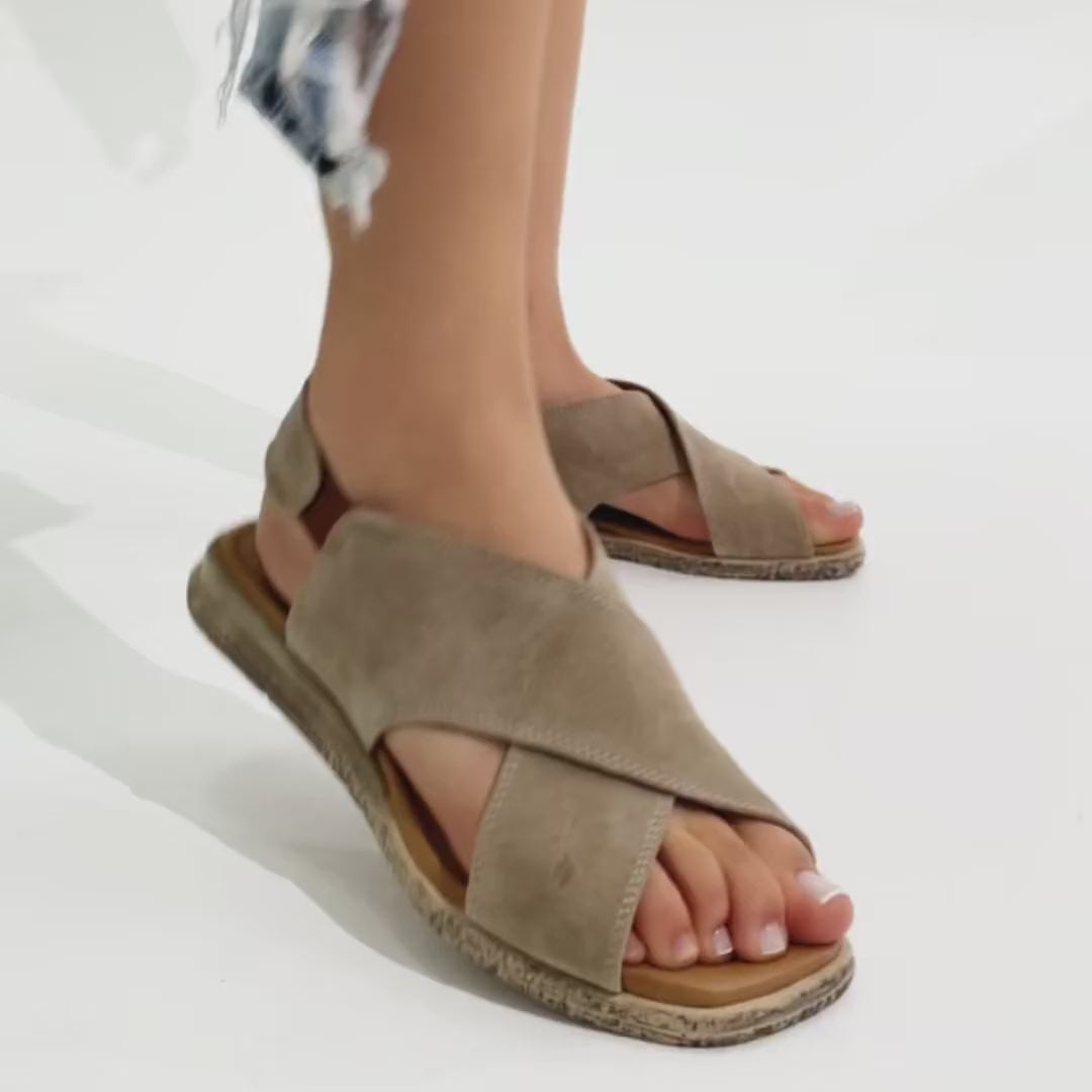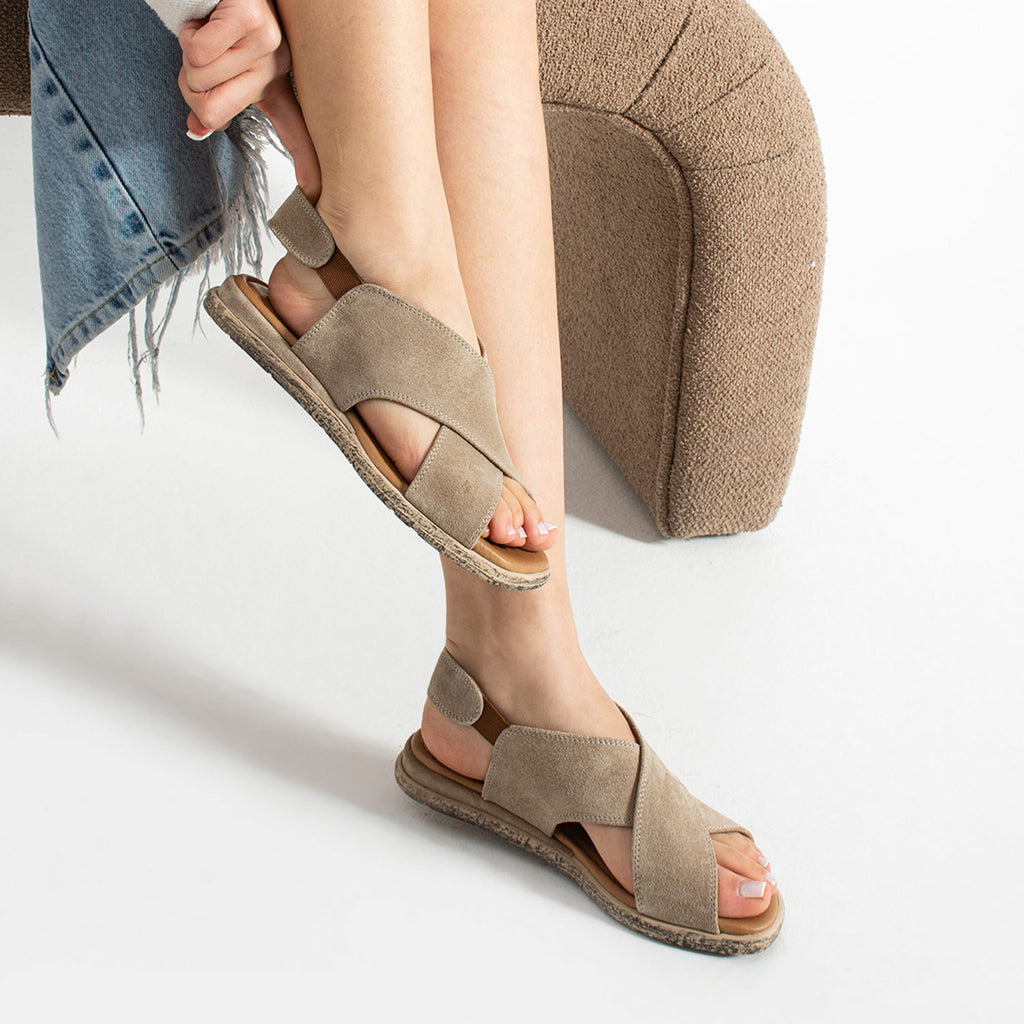 Rahat ve zamansız bir stilin keyfini çıkar! %100 hakiki süet deri yapısı ile yumuşak dokunuş sunan bu model, esnek tabanı sayesinde gün boyu konfor sağlar. Çapraz bant detayıyla modern bir hava katan sandalet, hem günlük hem de tatil kombinlerinin vazgeçilmezi olacak.