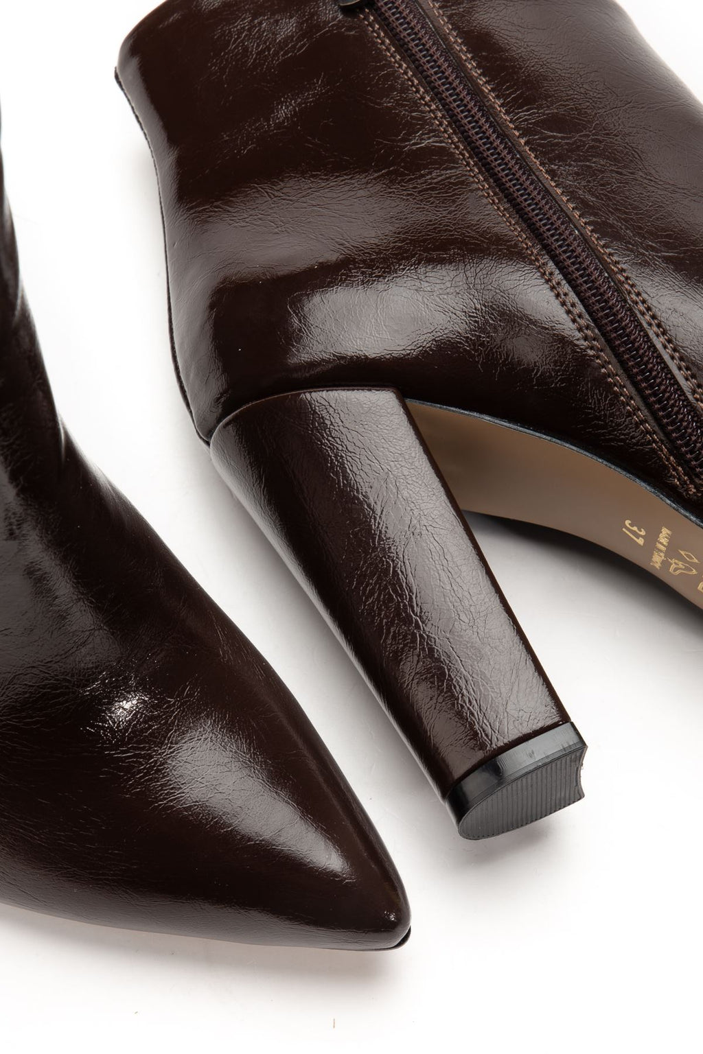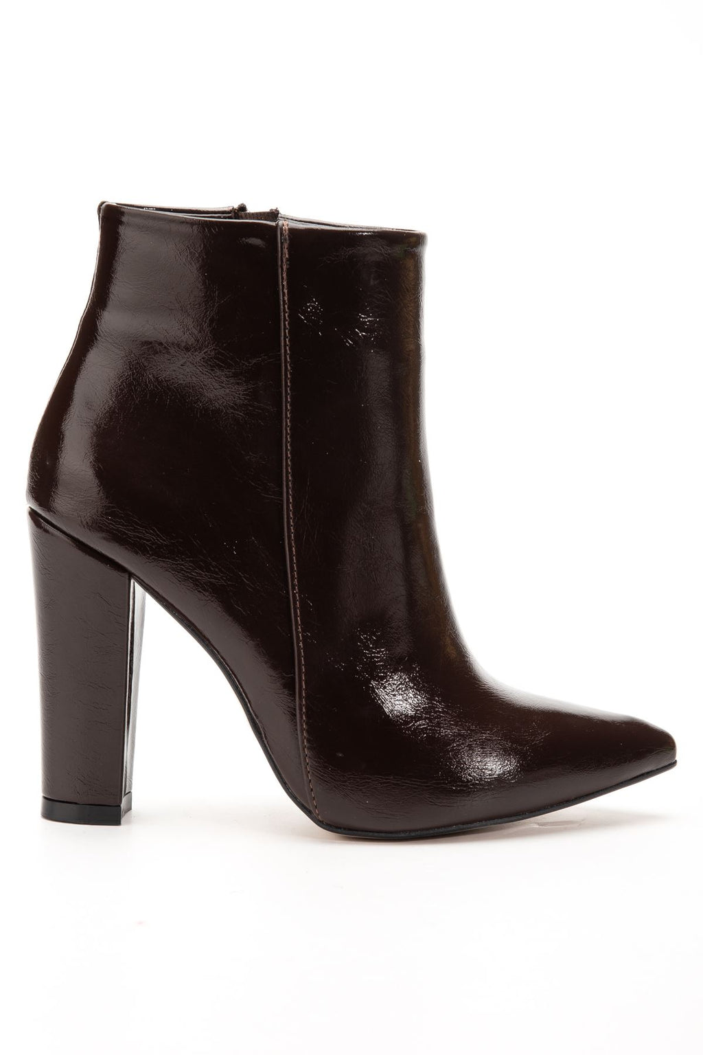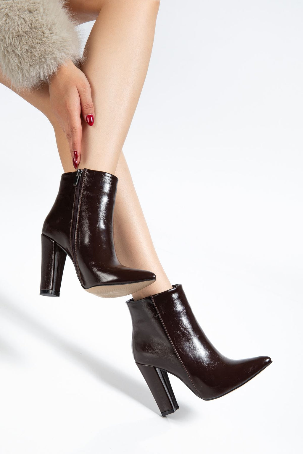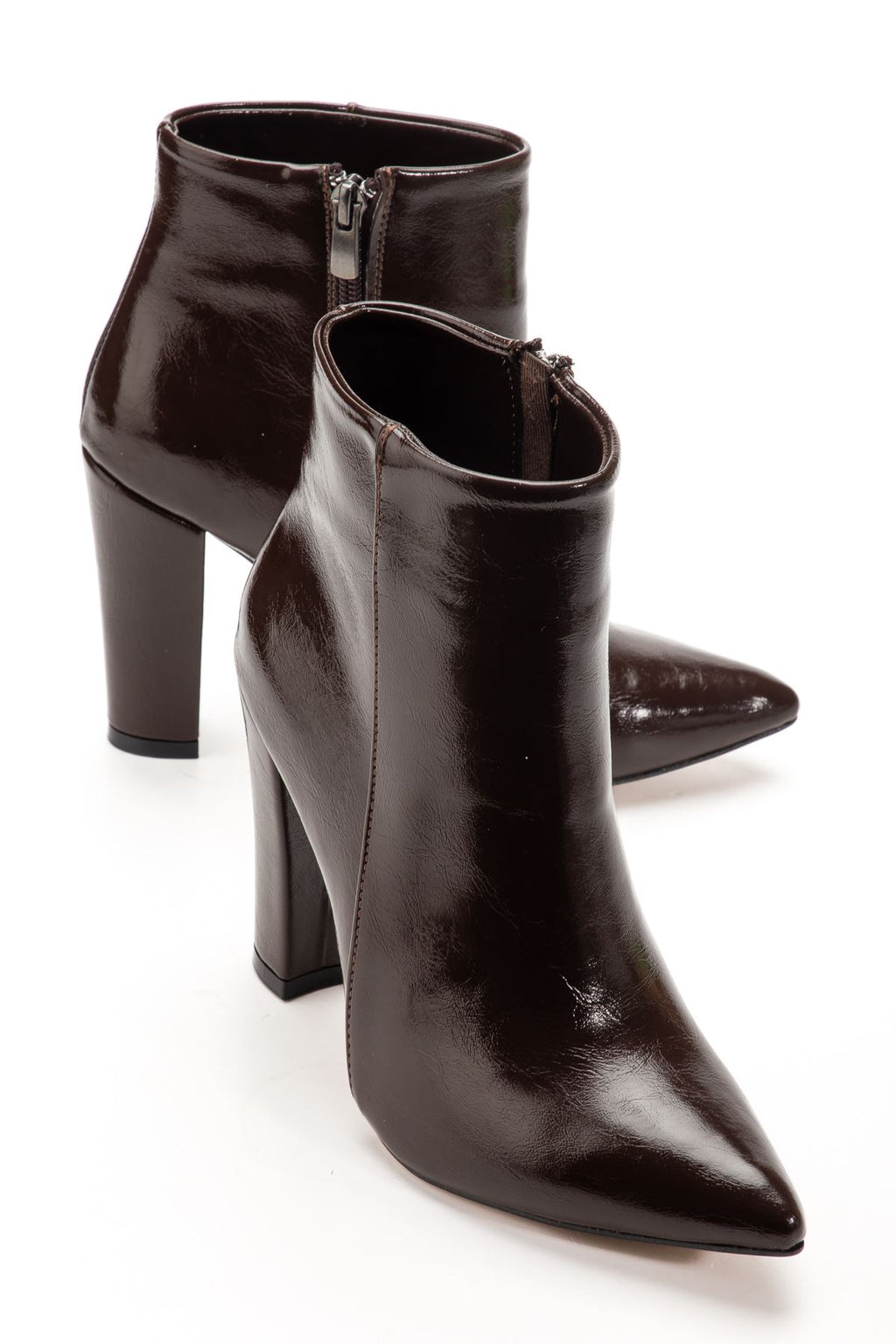 Defmen Kahve Kırışık Rugan Yüksek Kalın Topuklu Fermuarlı Kadın Bot