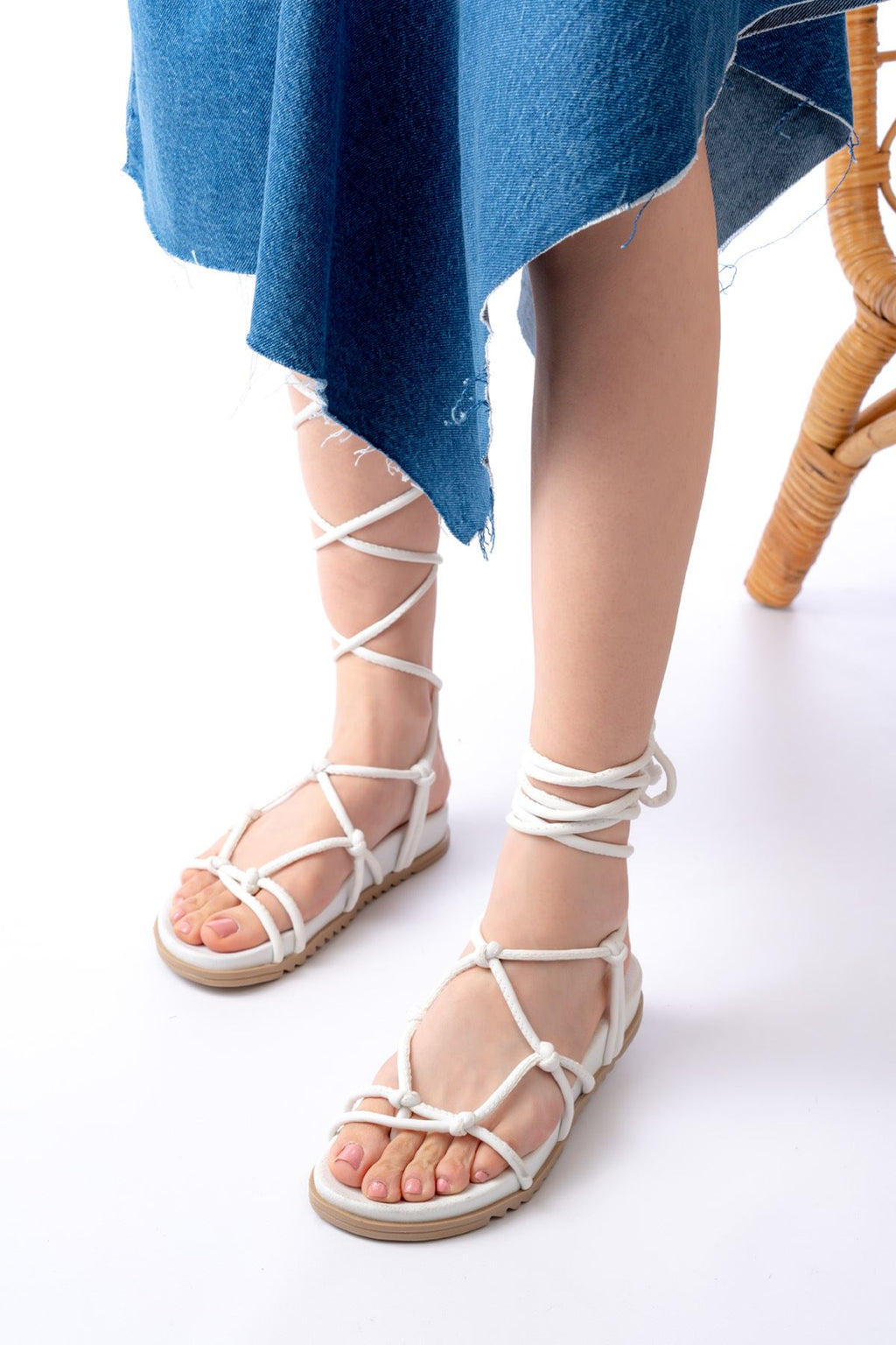 Elgan Beyaz Bilekten Bağcıklı Kadın Sandalet