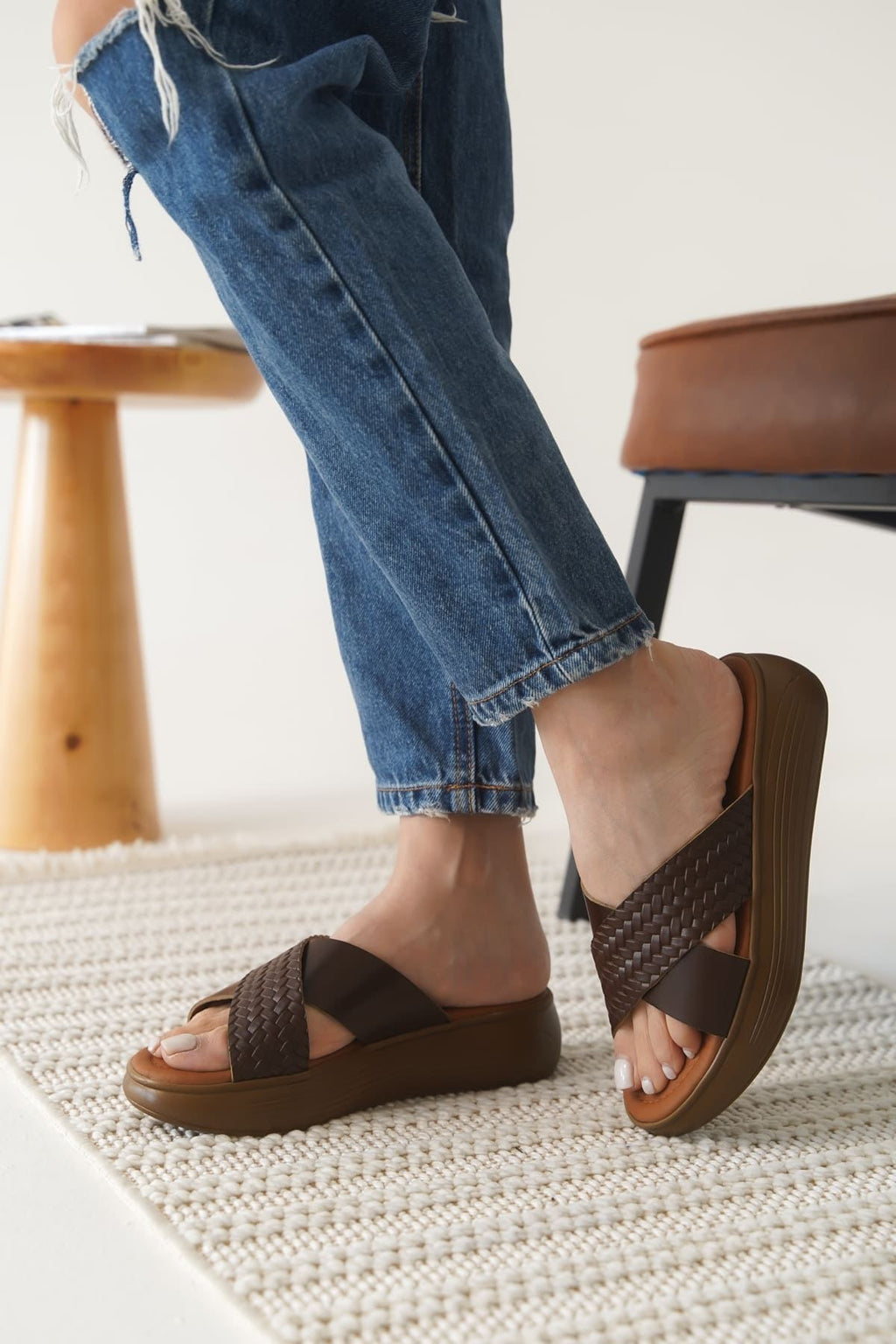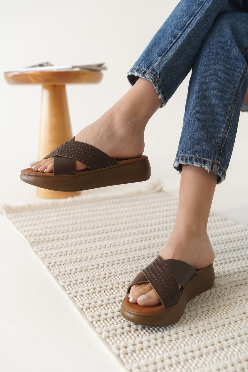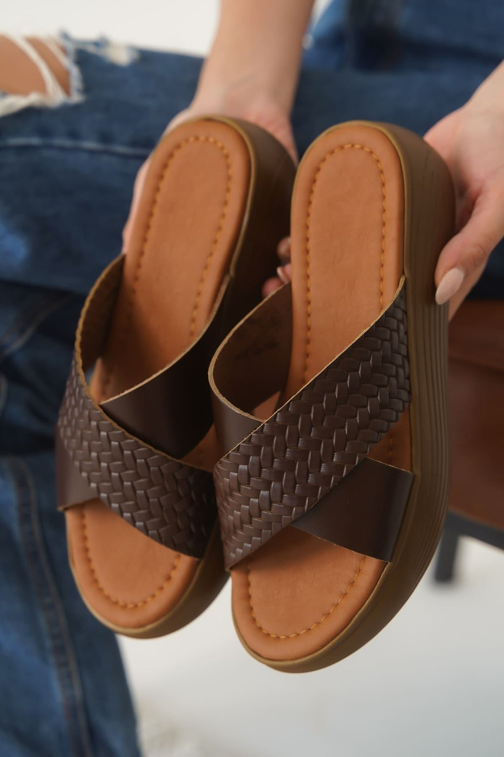 Fayn Kadın Örgü Desenli Hakiki Deri Acı Kahve Terlik