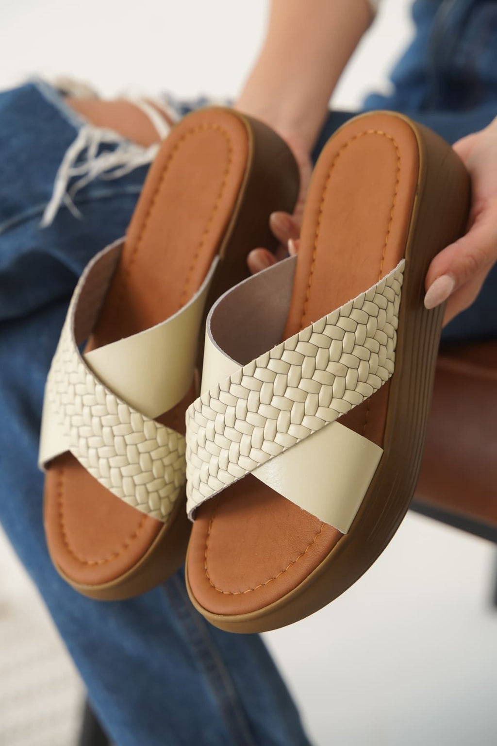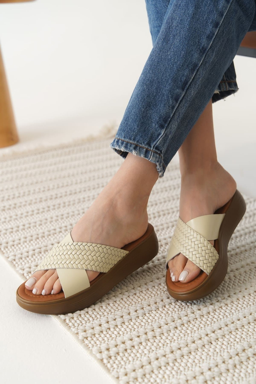 Fayn Kadın Örgü Desenli Hakiki Deri Bej Terlik