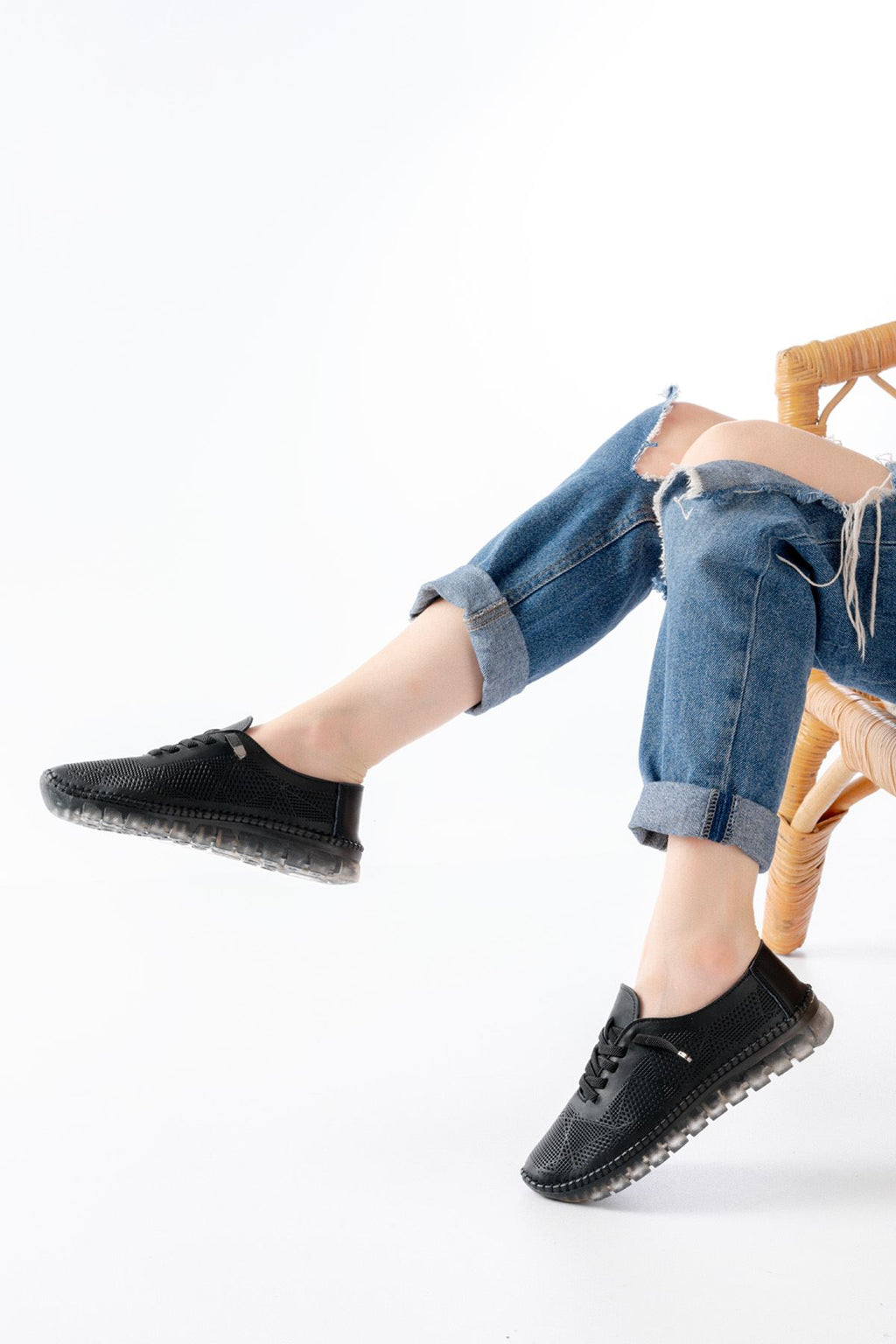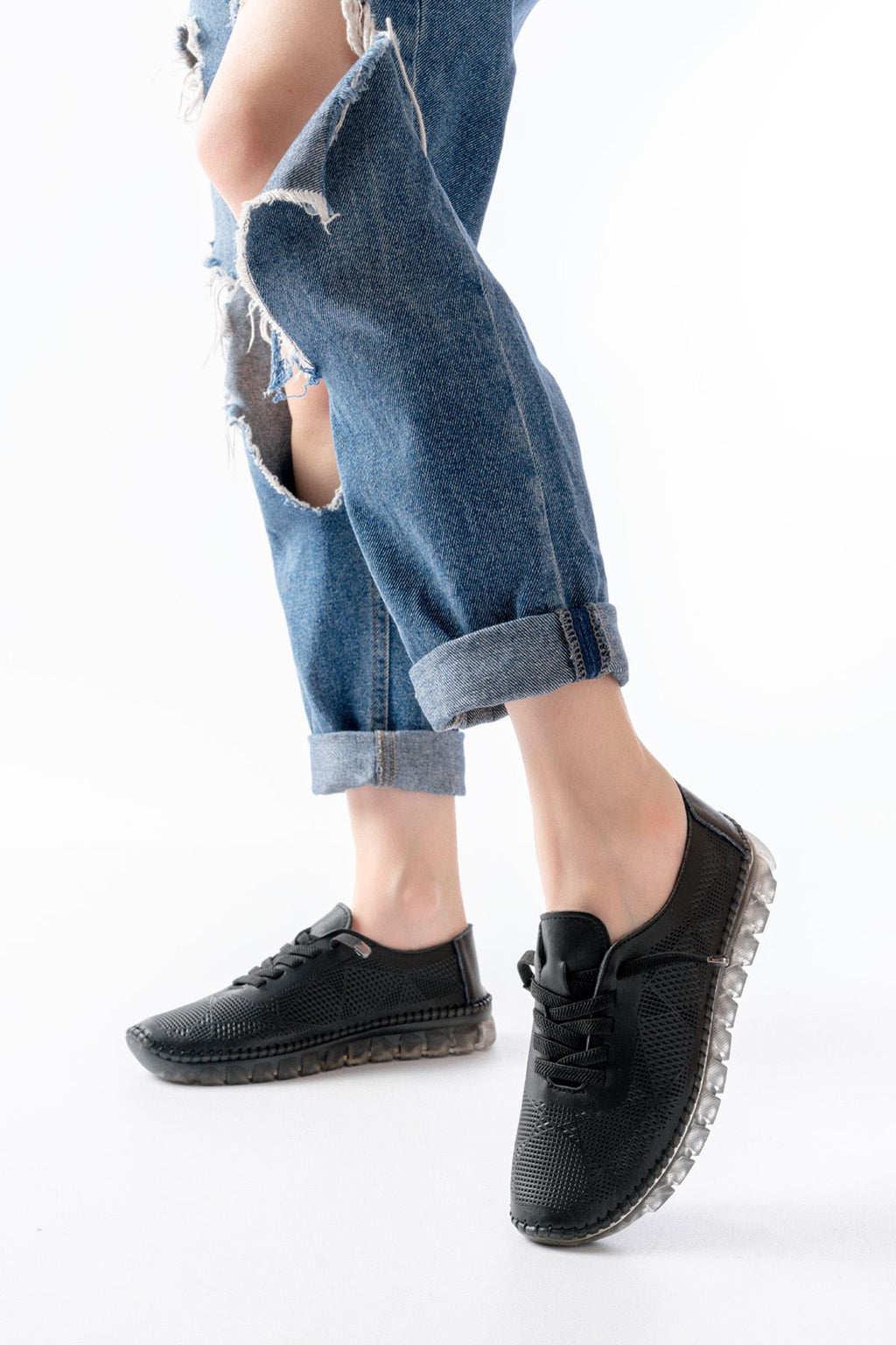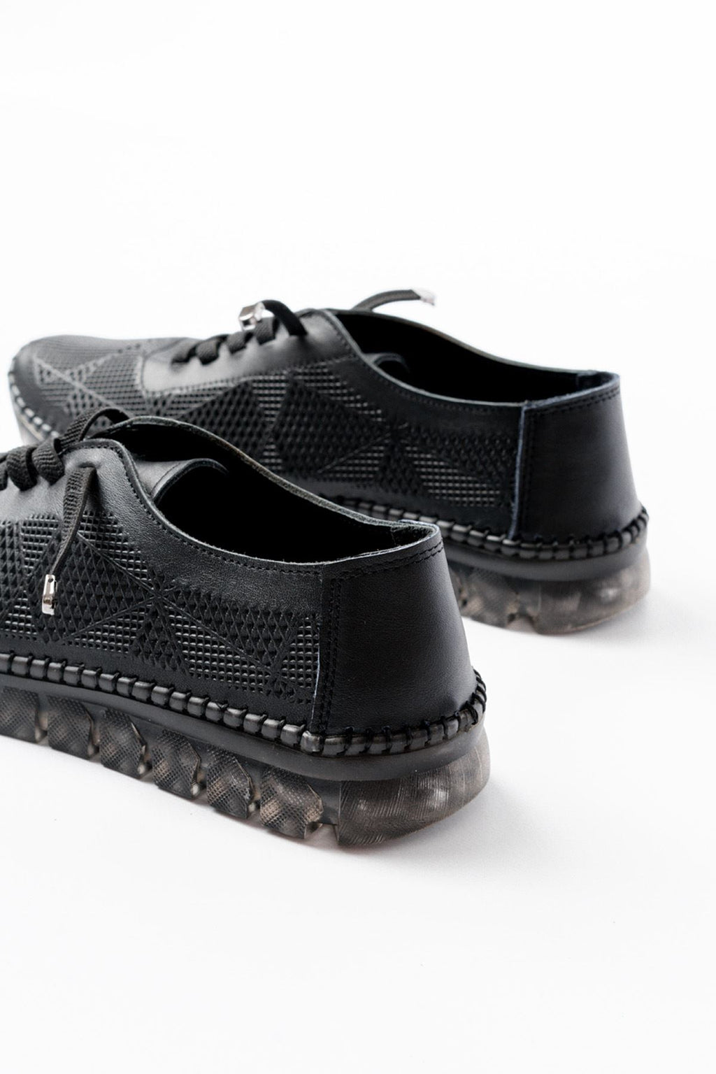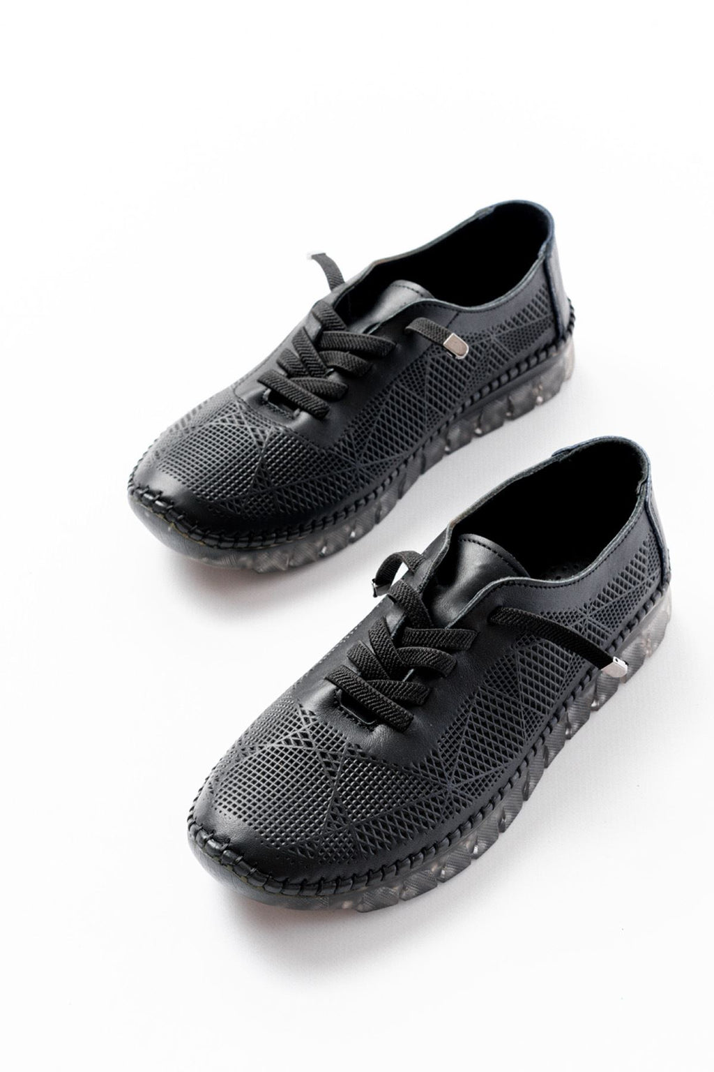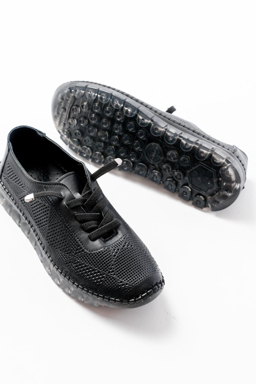 Garsen Kadın Siyah Hakiki Deri Şeffaf Taban Bağcıklı Spor Ayakkabı