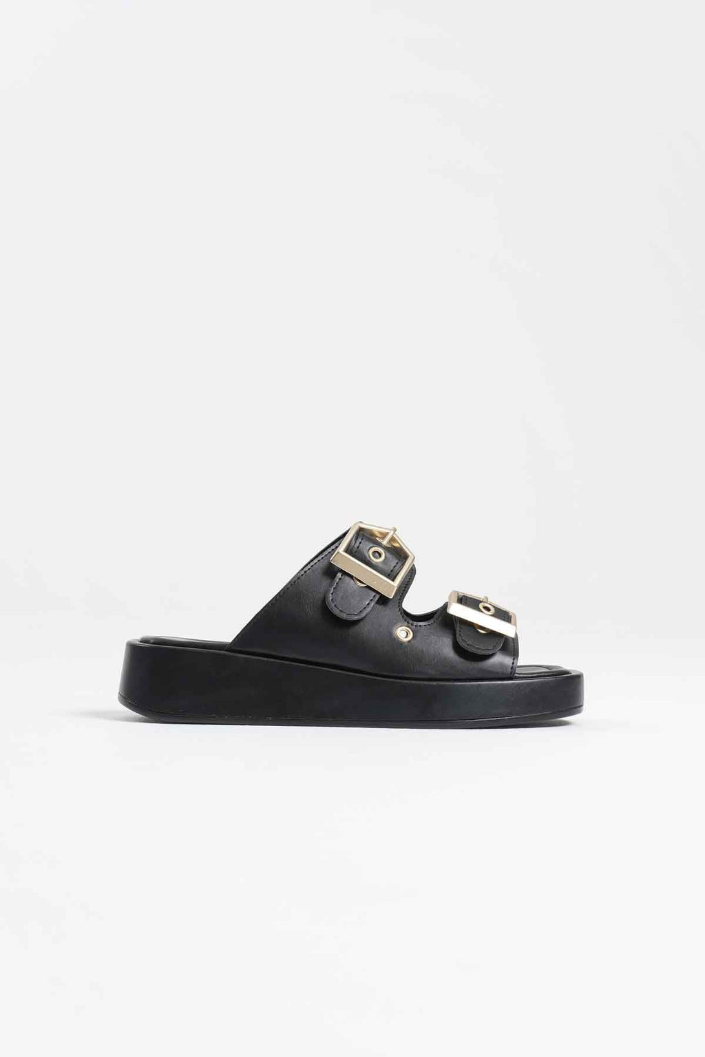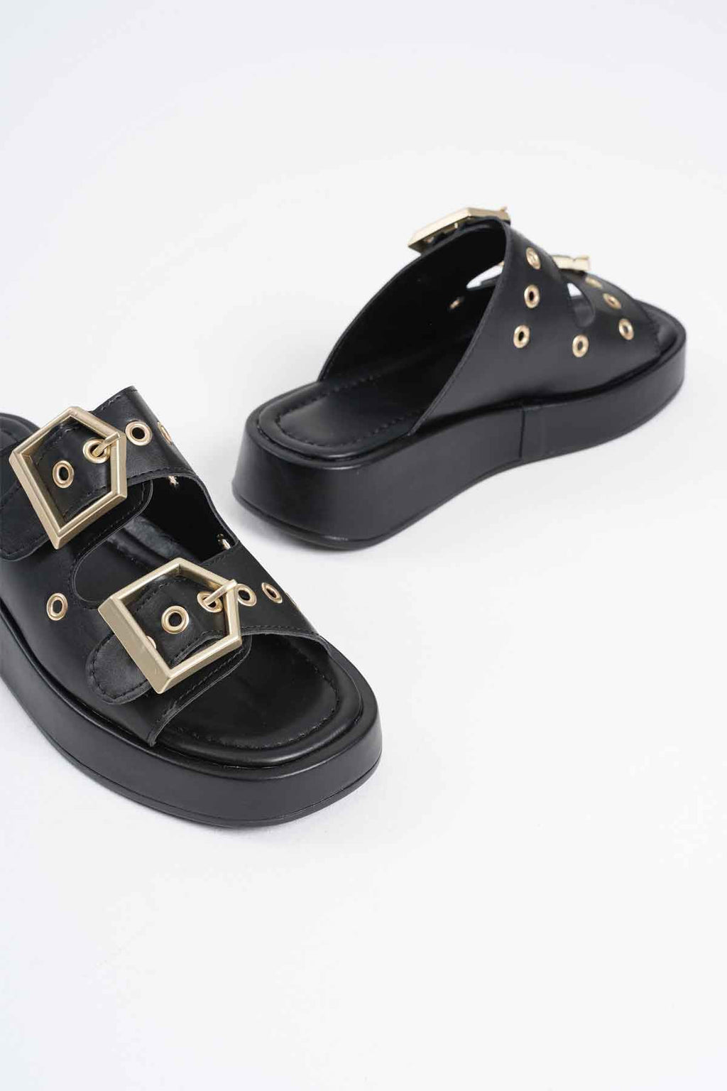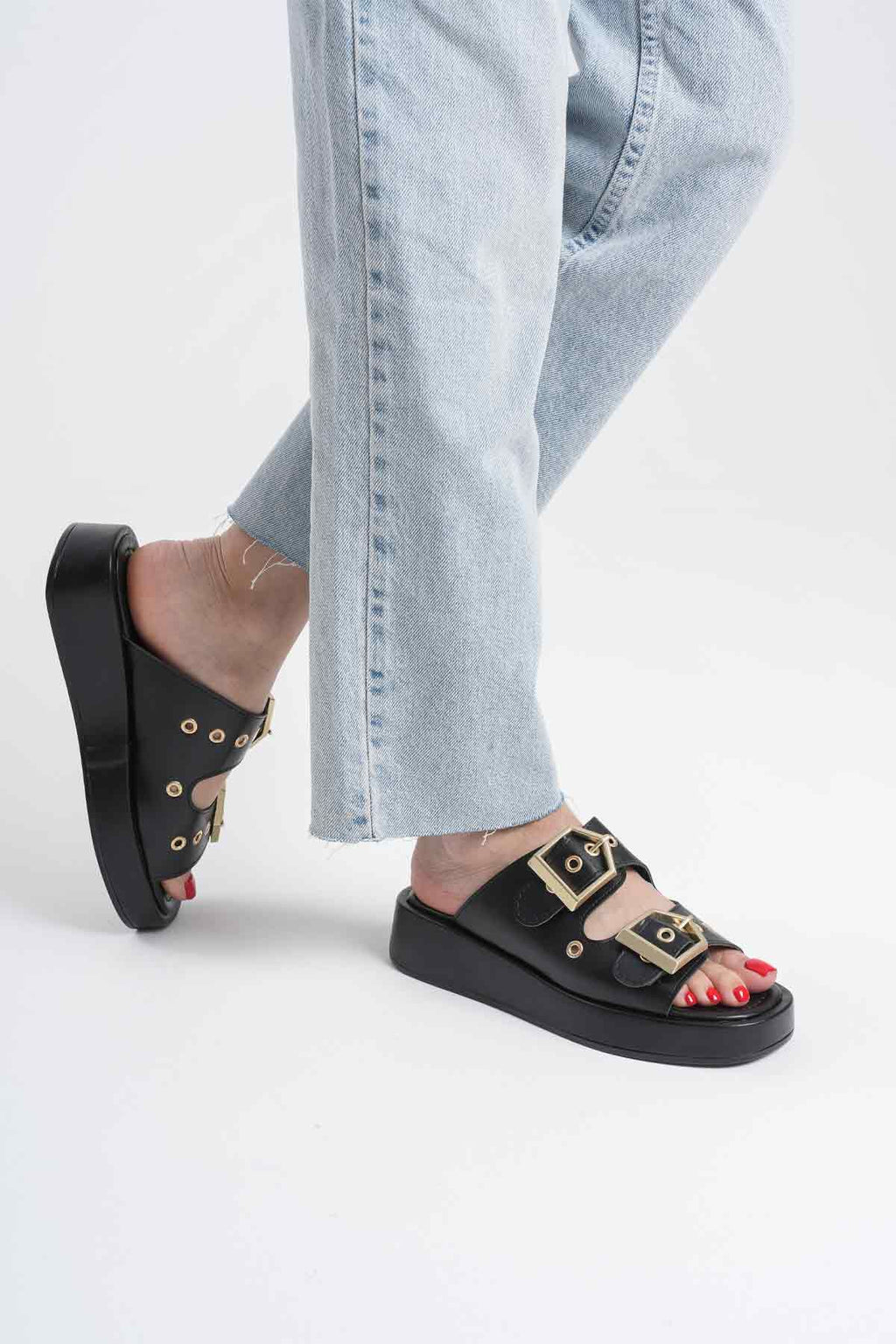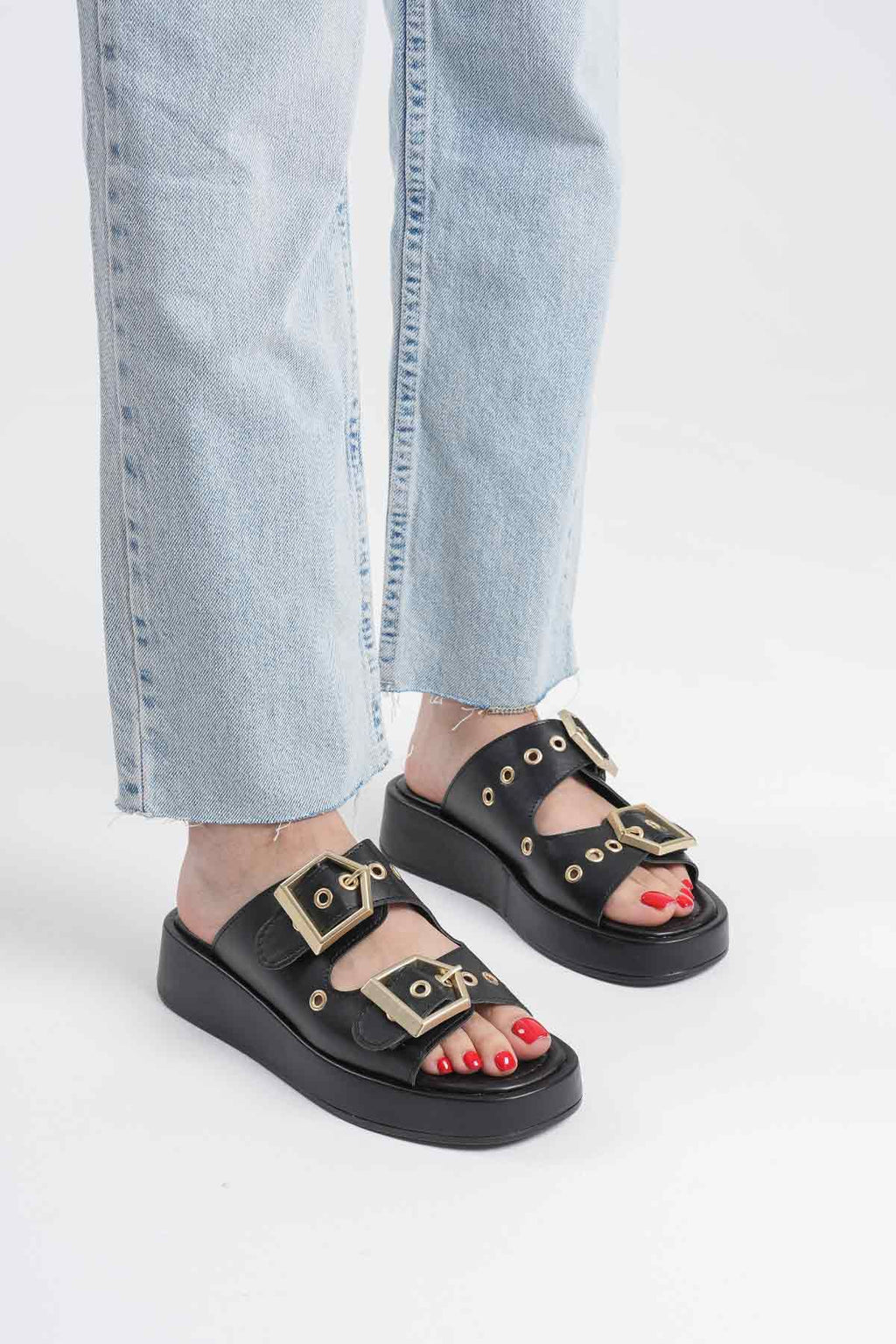 Güçlü siyah tonu ve tokalı tasarımıyla öne çıkan bu model, günlük stile net ve iddialı bir karakter kazandırır. Kalın bantlı yapısı ayağı dengeli şekilde sararken, metal tokalar tasarıma modern ve güçlü bir vurgu ekler. Düz ve sağlam tabanı sayesinde gün boyu kontrollü ve rahat bir kullanım hissi sunar.Şehir stilinden tatil kombinlerine kadar geniş bir kullanım alanına uyum sağlayan Glos, sade ama etkisi yüksek duruşuyla öne çıkar. Abartıdan uzak çizgileri sayesinde zamansız bir görünüm sunarken, güçlü formu kombinlerde dikkat çekici bir tamamlayıcı olur.