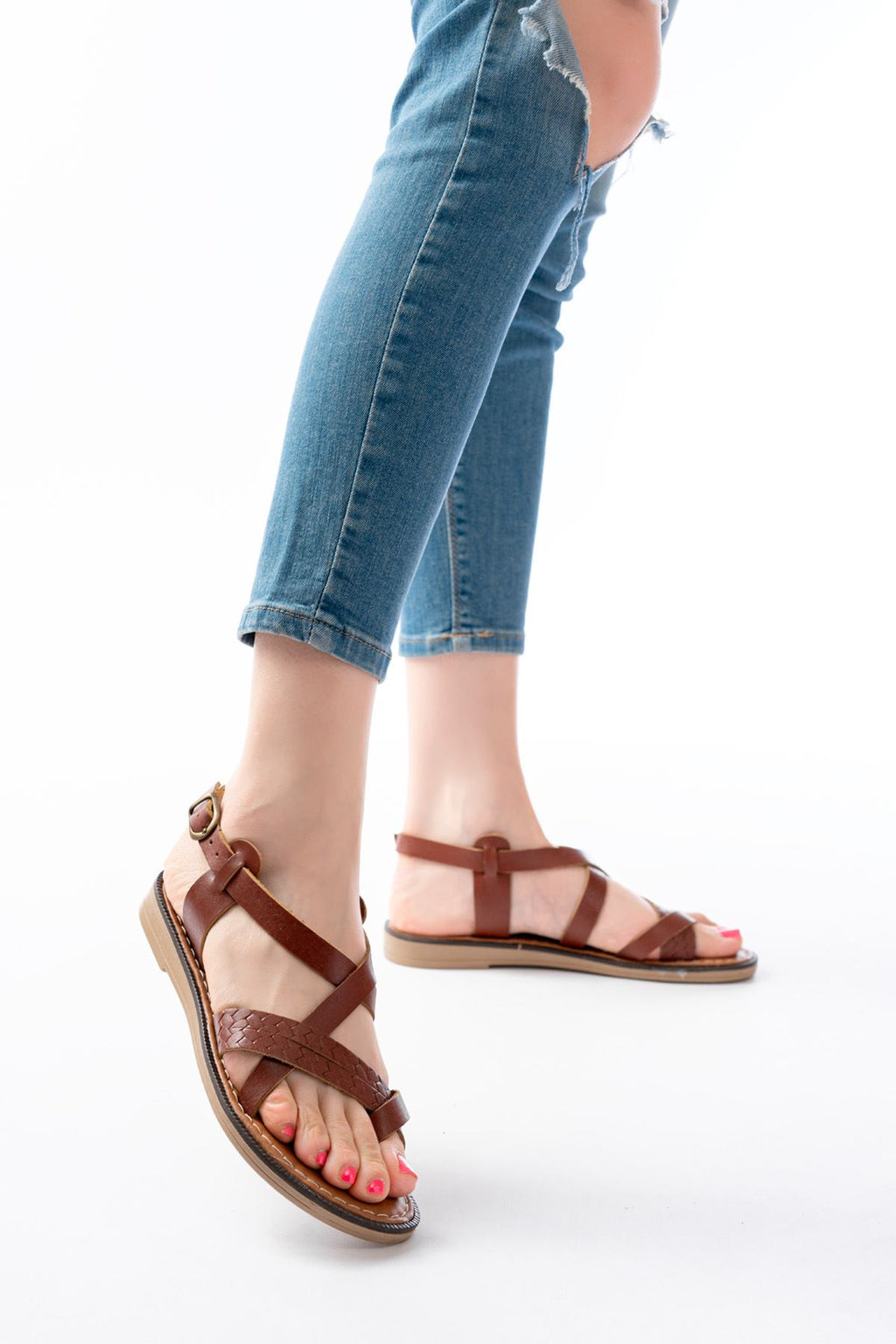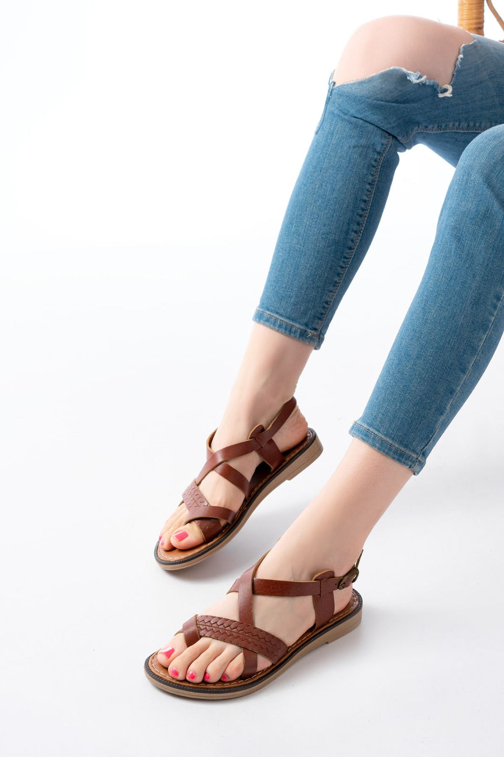 İnce ve hafif taban yapısı sayesinde gün boyu rahat bir kullanım sunar. Ön kısımdaki örgü bant detayı ayağı dengeli biçimde kavrarken, ayarlanabilir arka kayışı kişisel bir tutuş sağlar. Doğal koyu kahve tonu ve hakiki deri dokusuyla günlük kombinlere sıcak ve zarif bir karakter katan bu model, hem şehir hem tatil stilinde ferah ve konforlu bir tercihtir.