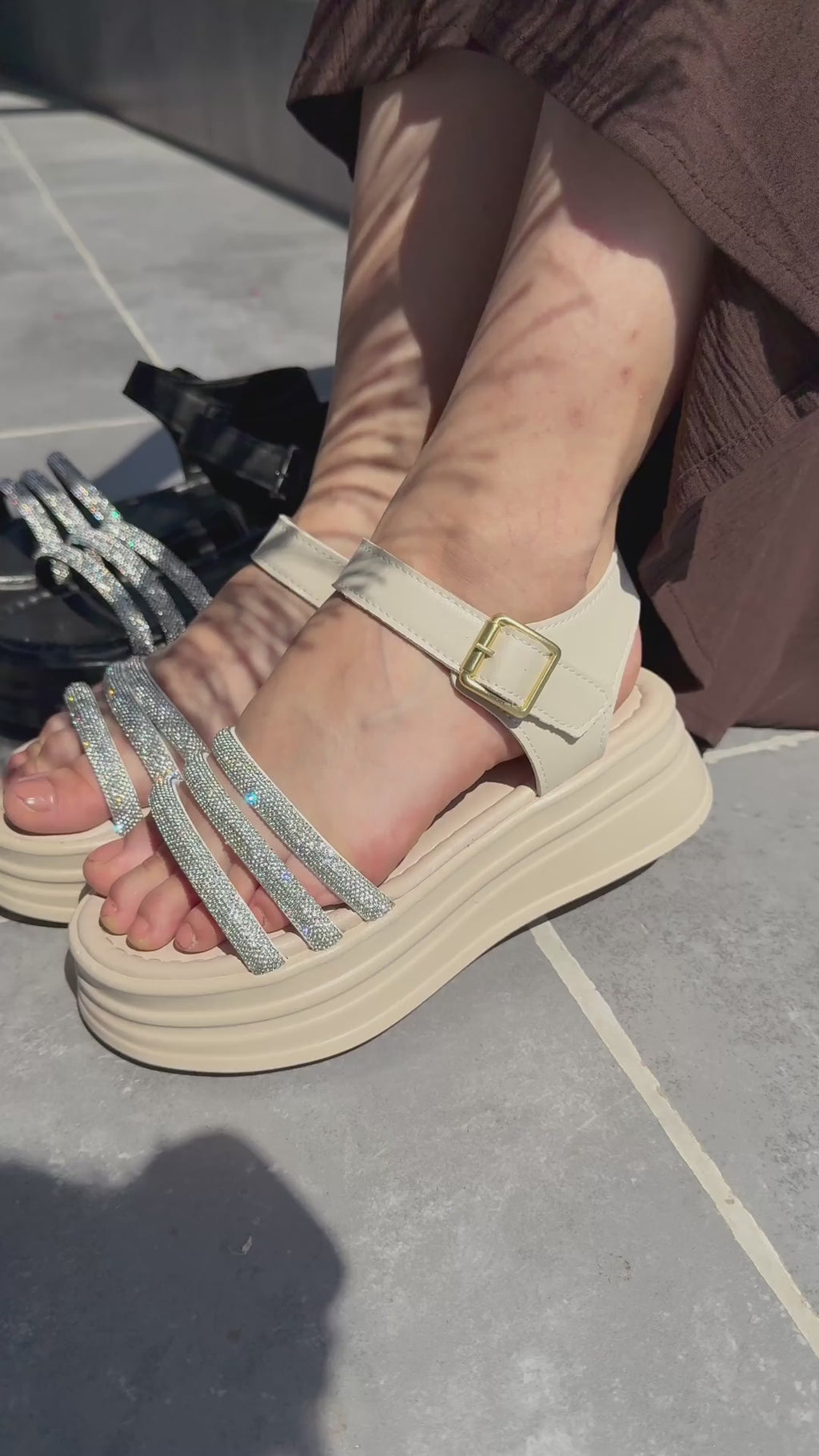 Lalen modeli, ışığı yansıtan taşlı bant tasarımıyla sade kombinlere güçlü bir vurgu katar. Ayak bileğini saran kemerli yapısı dengeli bir kullanım sunarken, kalın platform tabanı gün boyu rahat bir adım hissi oluşturur. Günlük şehir temposundan özel buluşmalara kadar farklı stillerle kolayca uyum sağlayan modern ve dikkat çekici bir tasarımdır.