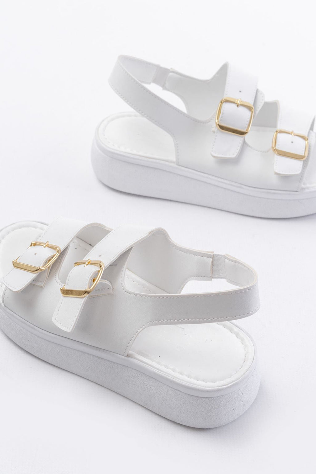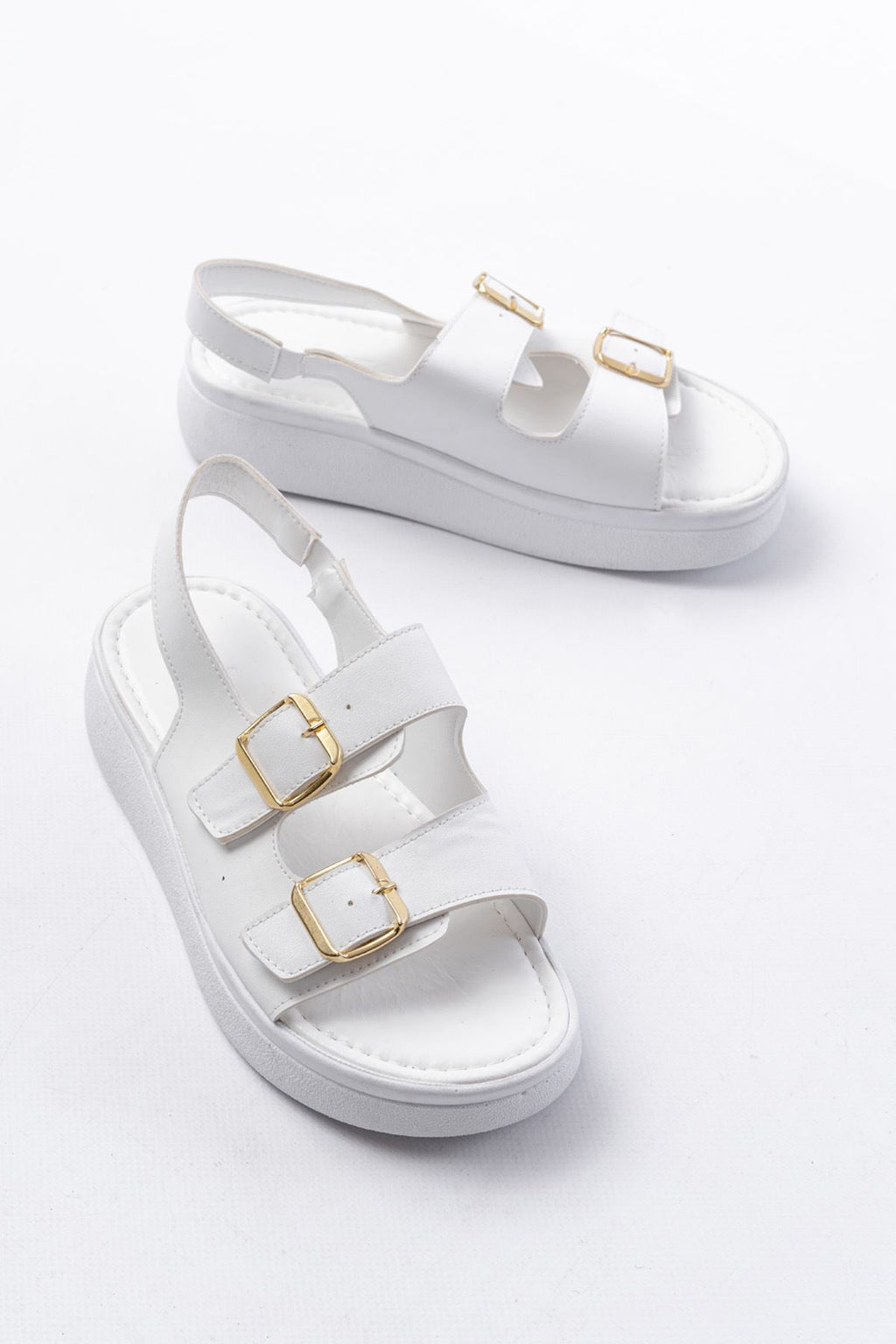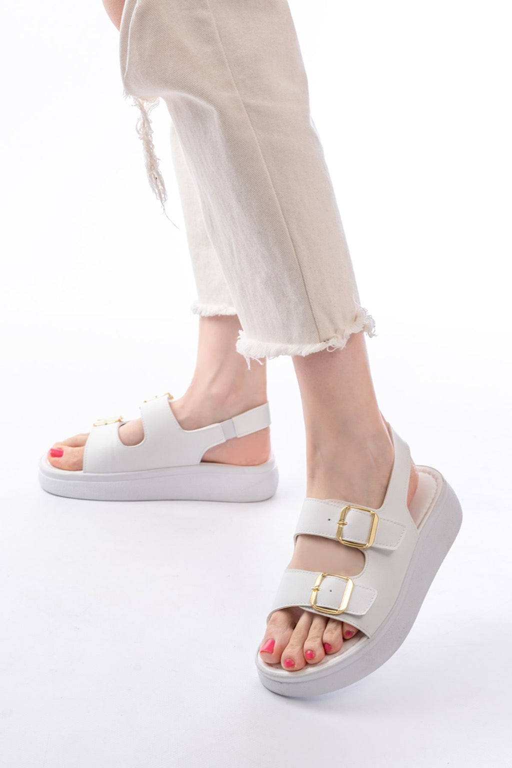 Çift tokalı bant yapısı ve dolgu topuk formuyla güçlü bir duruş sunan bu model, günlük stiline net ve dengeli bir görünüm kazandırır. Ayakta sade ama dikkat çekici bir etki oluşturan tasarımı sayesinde hem şehir temposuna hem yaz kombinlerine rahatlıkla uyum sağlar. Zamansız çizgileriyle uzun süre keyifle kullanılabilecek bir alternatiftir.