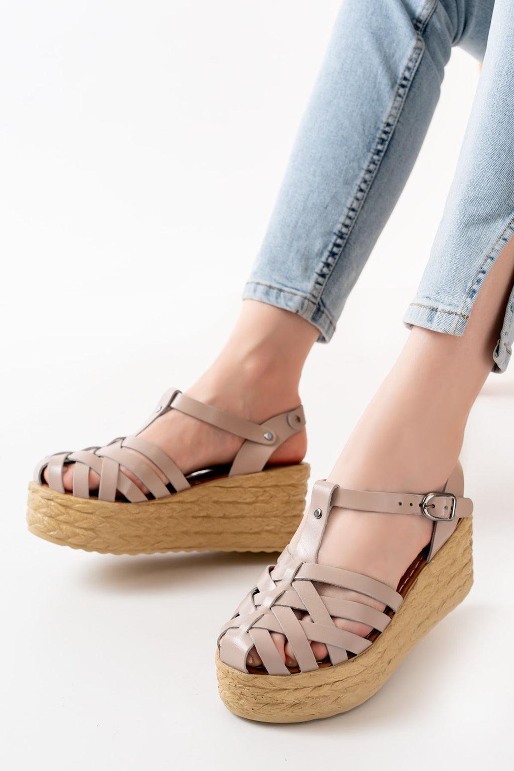 Nergan Bej Ortopedik Hakiki Deri Dolgu Kadın Sandalet
