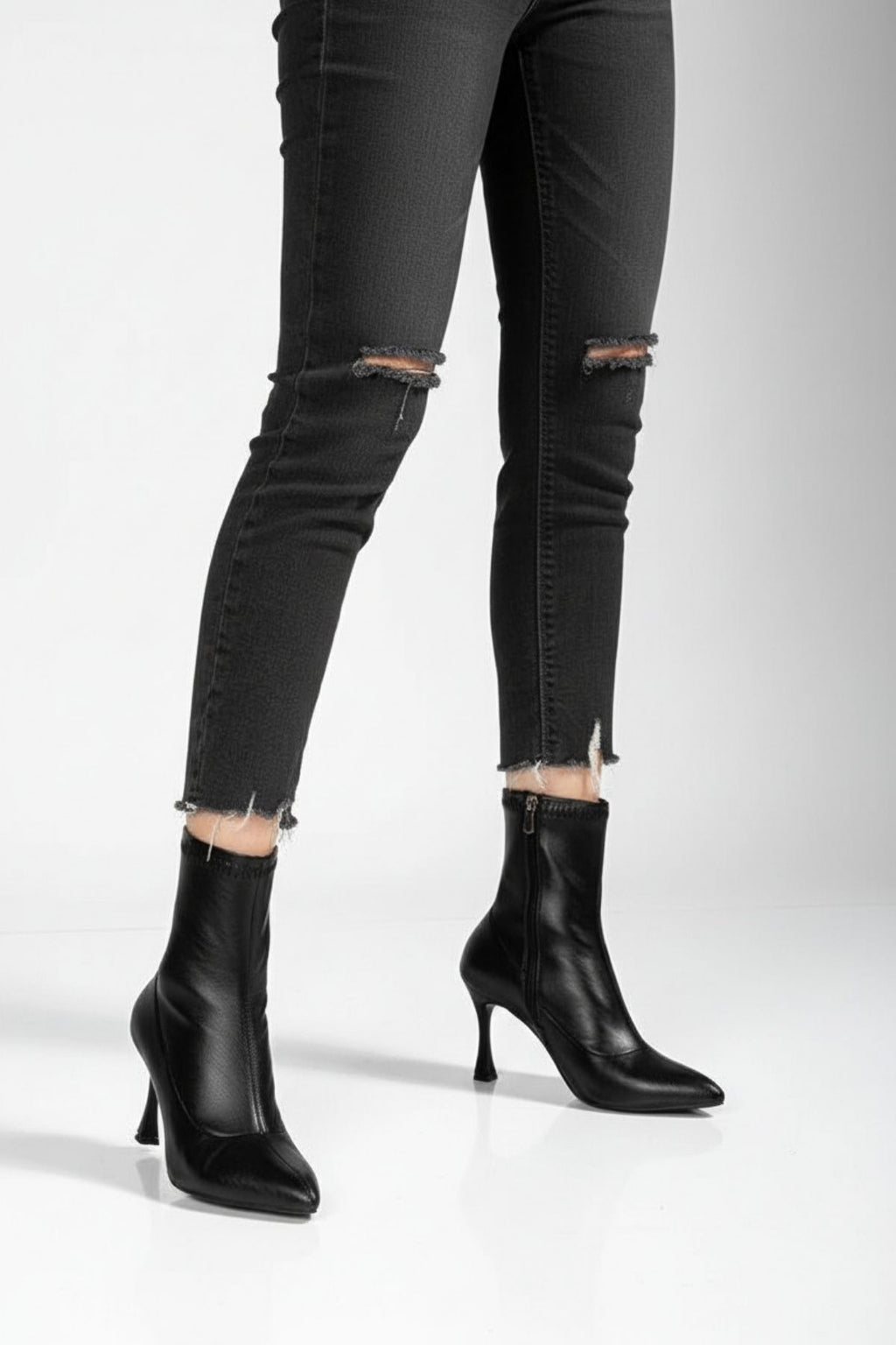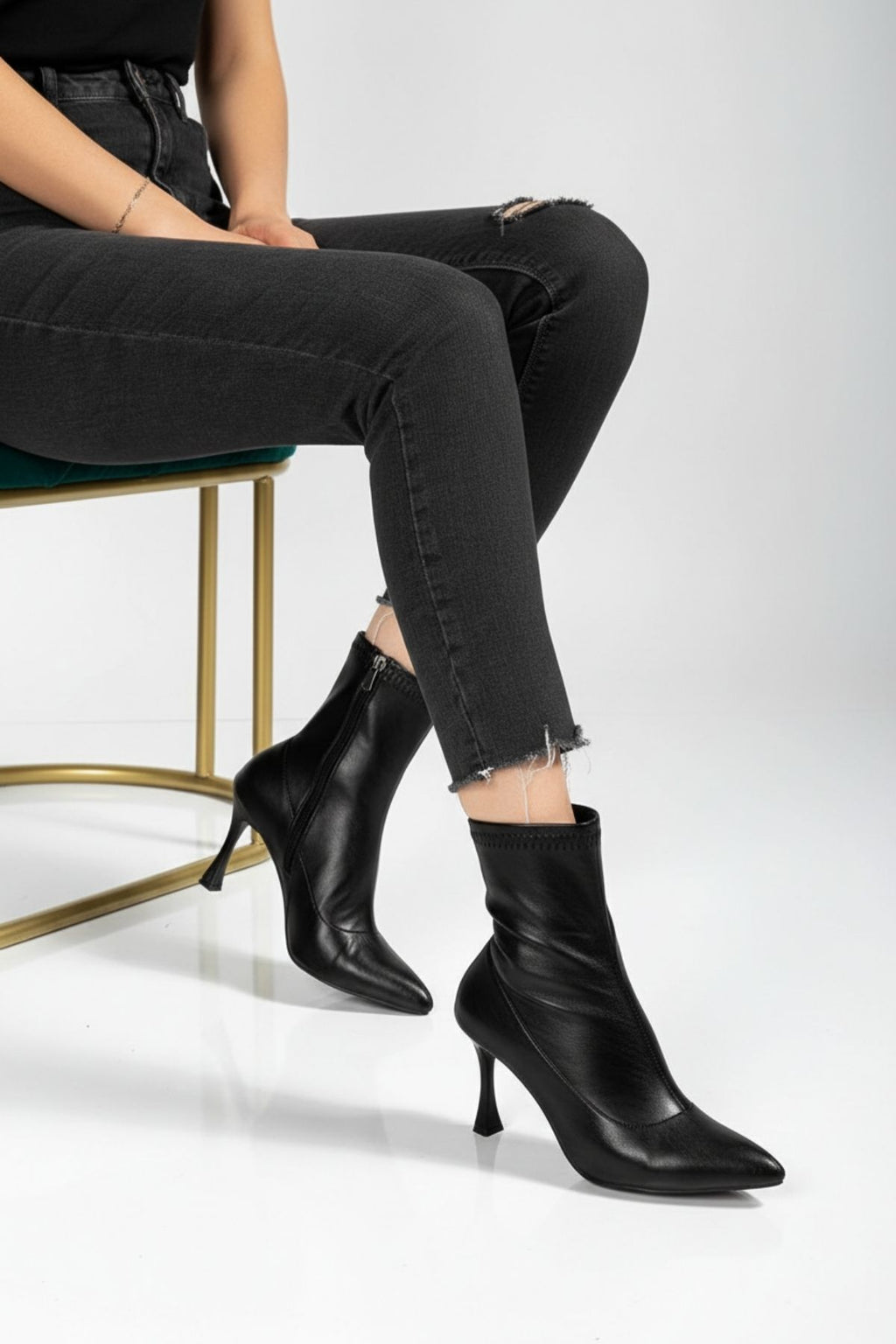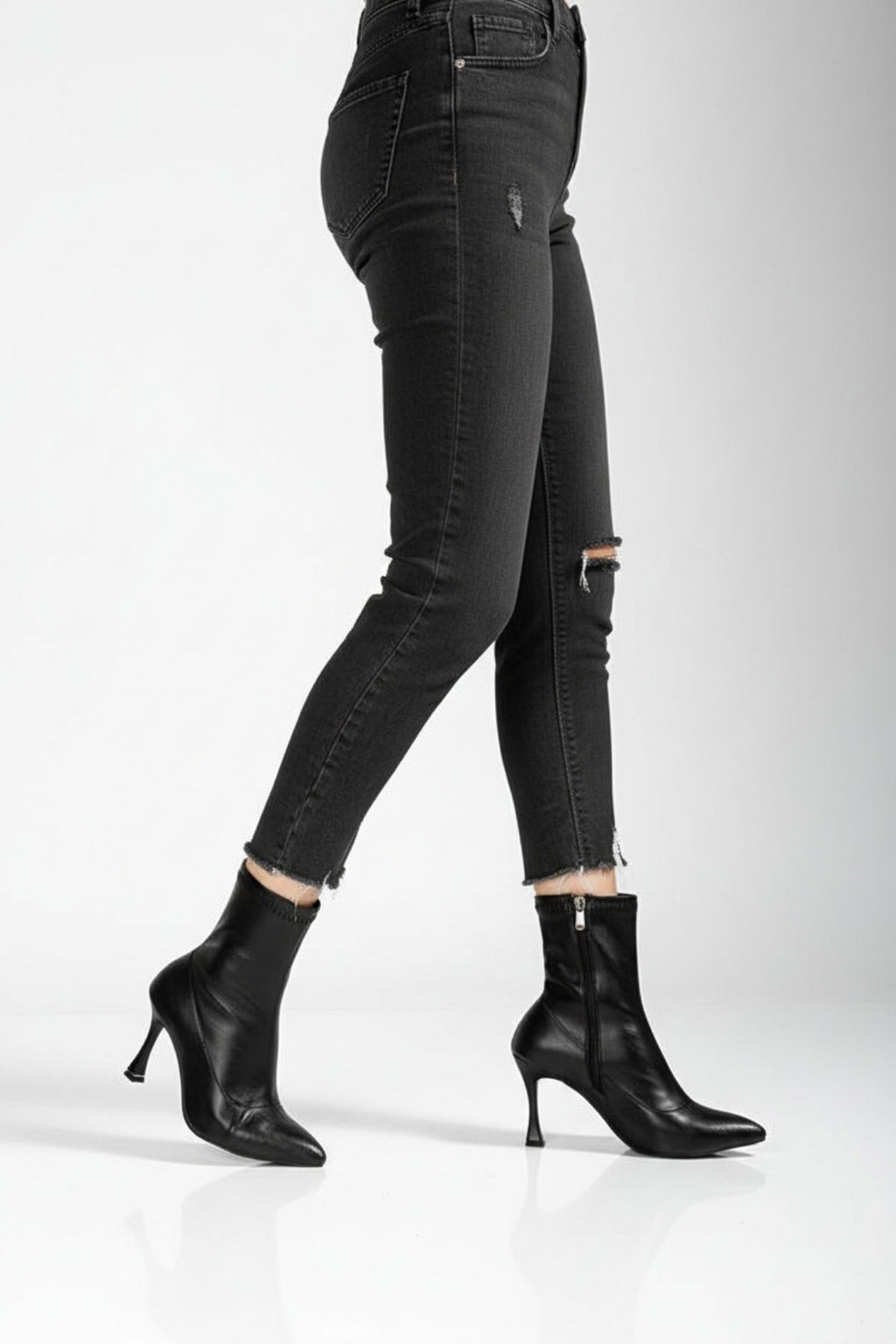 Zarif topuk formu ve streç yapısıyla ayağı kusursuz şekilde saran Orjen modeli, modern çizgileriyle güçlü bir duruş sunar. İnce burun tasarımı silueti daha uzun gösterirken, yandan fermuarlı yapısı kullanım kolaylığı sağlar. Dengeli topuk yüksekliği sayesinde şıklığı net bir formda tamamlar.