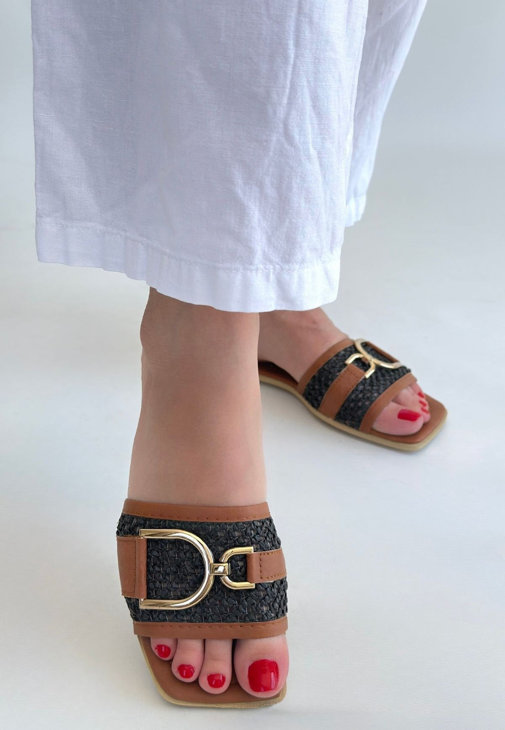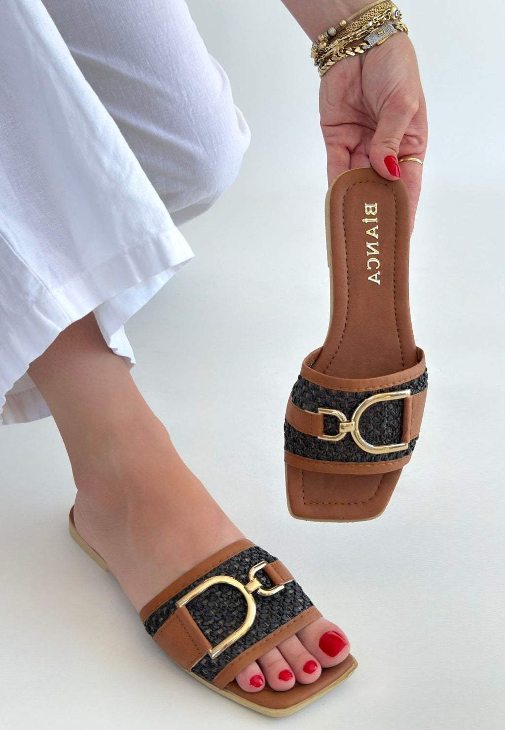 Hasır dokulu bant tasarımı ve gold toka detayıyla dikkat çeken Pıer modeli, sade formu güçlü bir stil vurgusuyla tamamlar. Kontrast geçişli yüzey yapısı modele hareket kazandırırken ince taban formu hafif ve dengeli bir kullanım sunar. Modern ve zamansız görünümü sayesinde farklı kombinlere kolayca uyum sağlar.